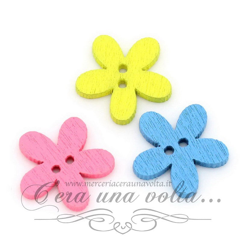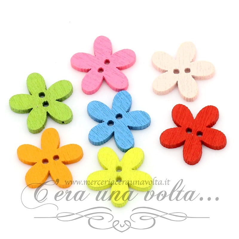 20 pz Bottoni in legno a forma di fiore colori assortiti con attacco a 2 fori, ideale per decorare e rifinire capi di abbigliamento e per aggiungere un tocco personale alle vostre creazioni. Trova largo uso nell'hobbistica creativa e per abbellire bomboniere