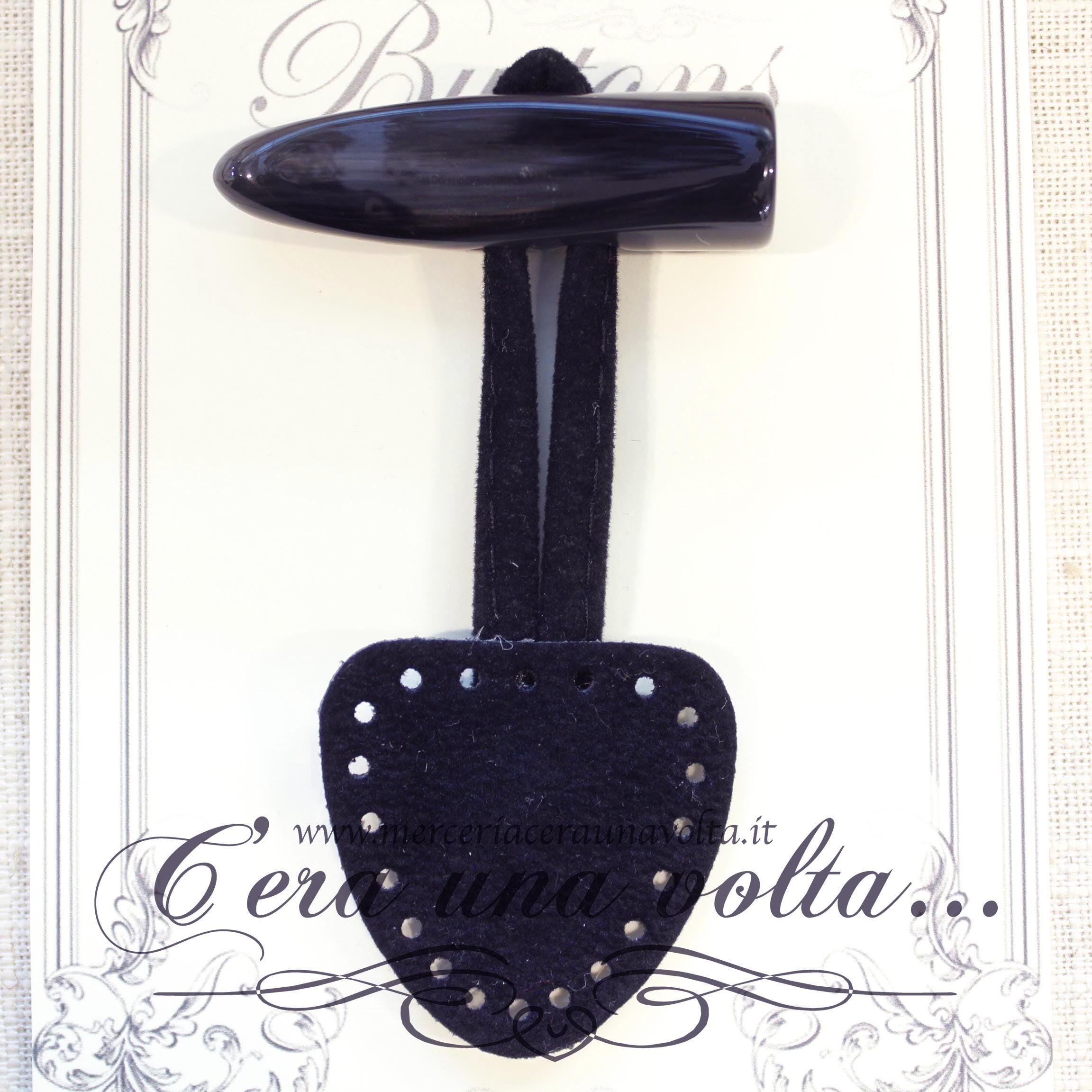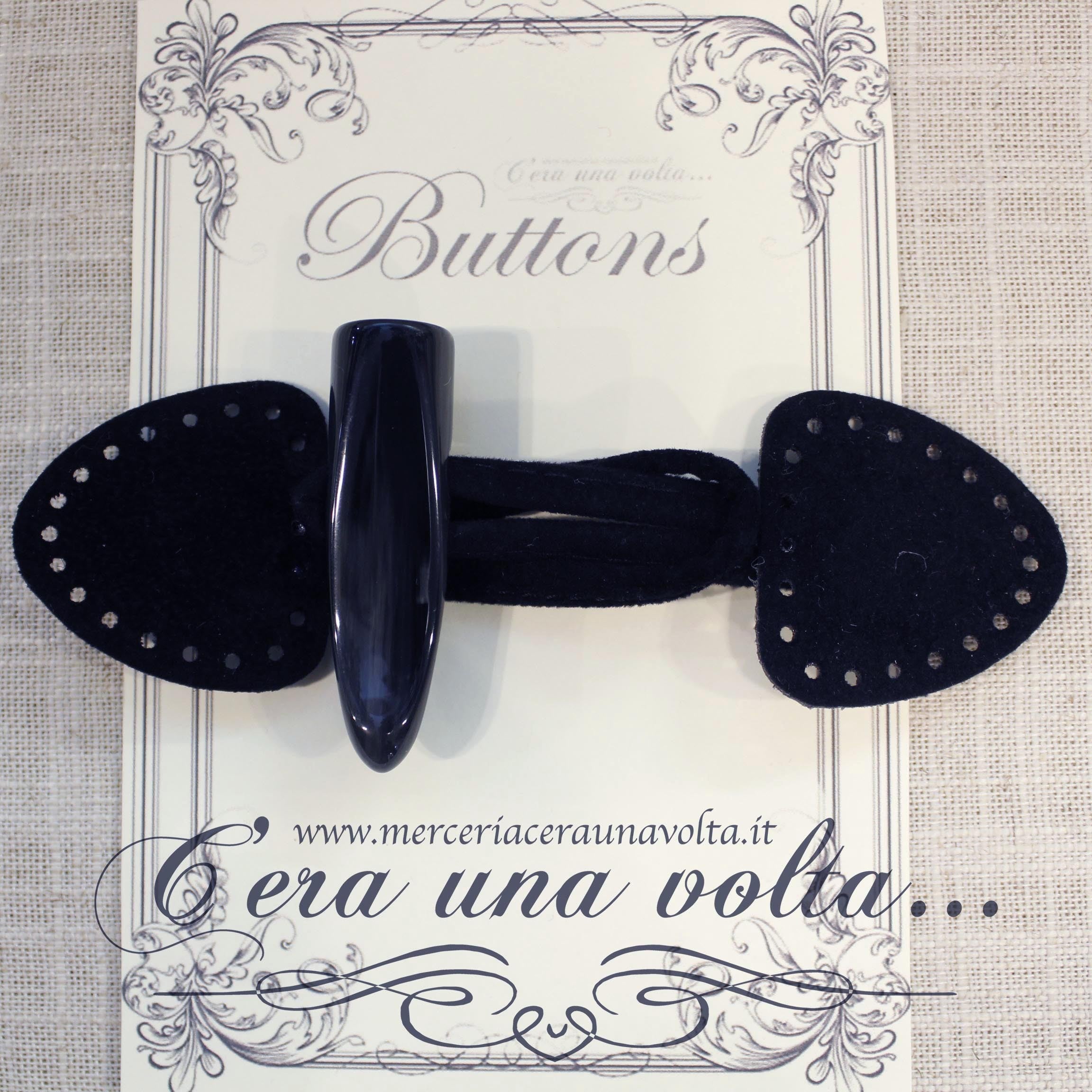 Allacciatura per abbigliamento formata da due parti: una con cordicella ripiegata a formare un'occhiello, l'altra con un bottone che andrà inserito nella prima, in Fibropelle Scamosciata con bottone in poliestere a due fori, adatto per abbigliamento e Montgomery
