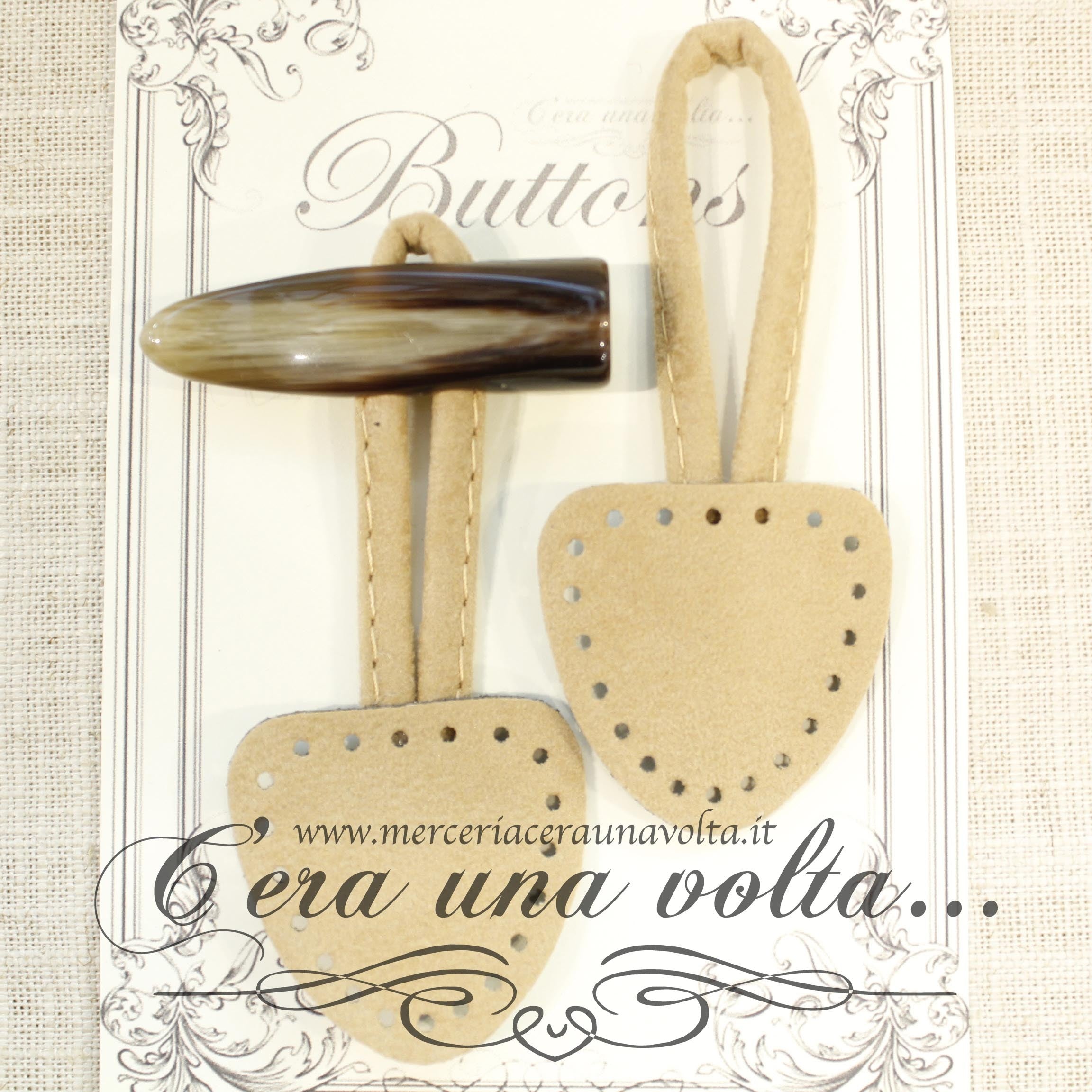 Allacciatura per abbigliamento formata da due parti: una con cordicella ripiegata a formare un'occhiello, l'altra con un bottone che andrà inserito nella prima, in Fibropelle Scamosciata con bottone in poliestere a due fori, adatto per abbigliamento e Montgomery