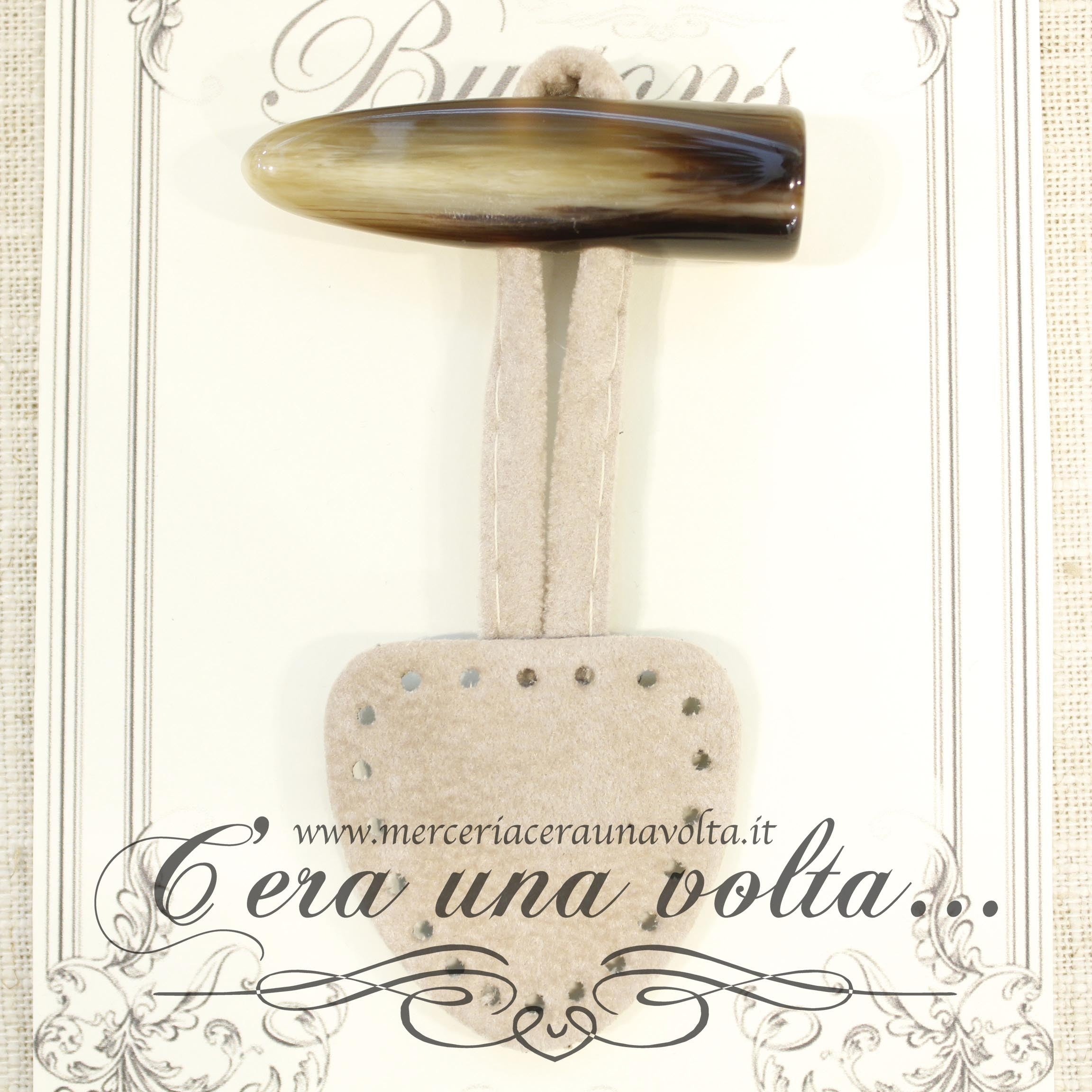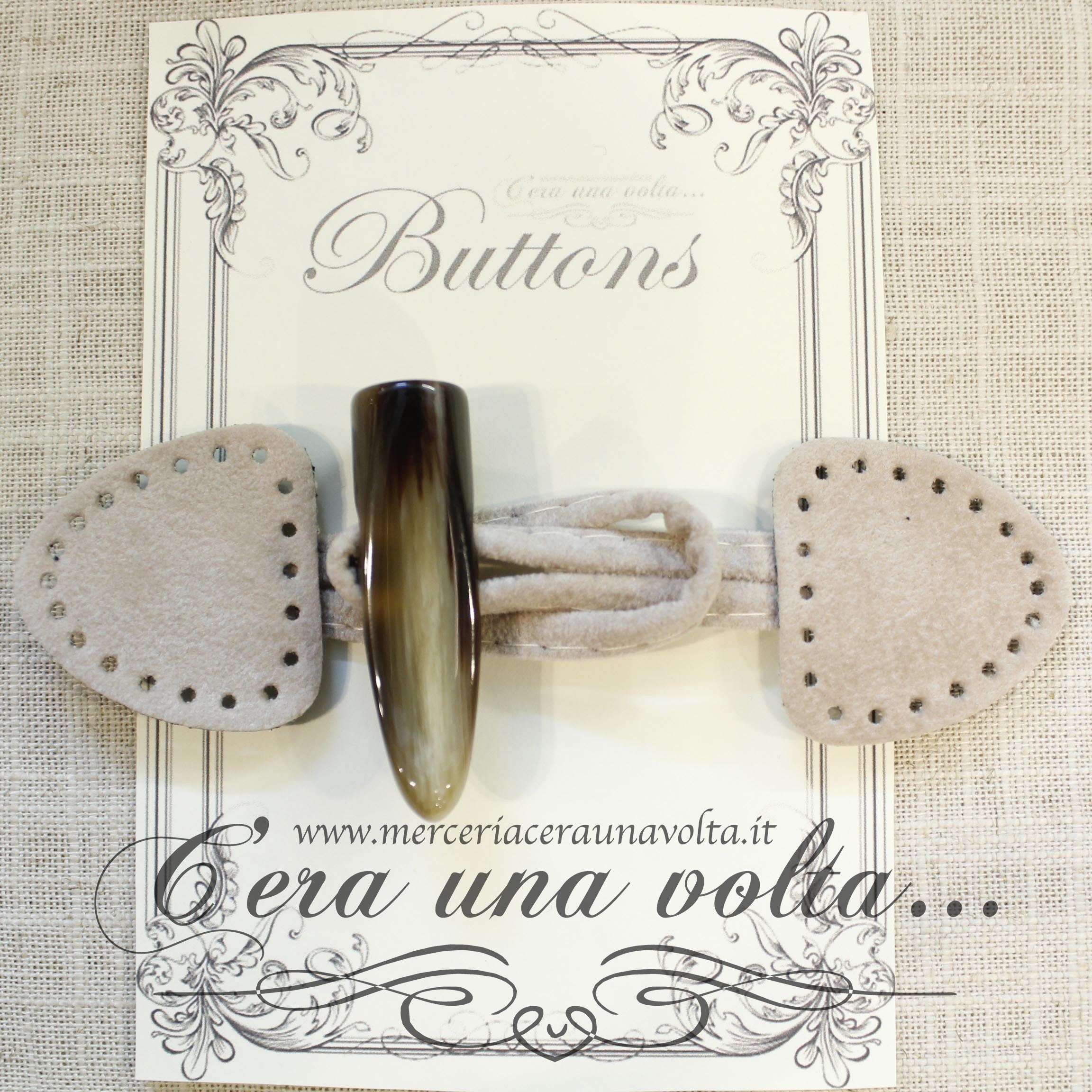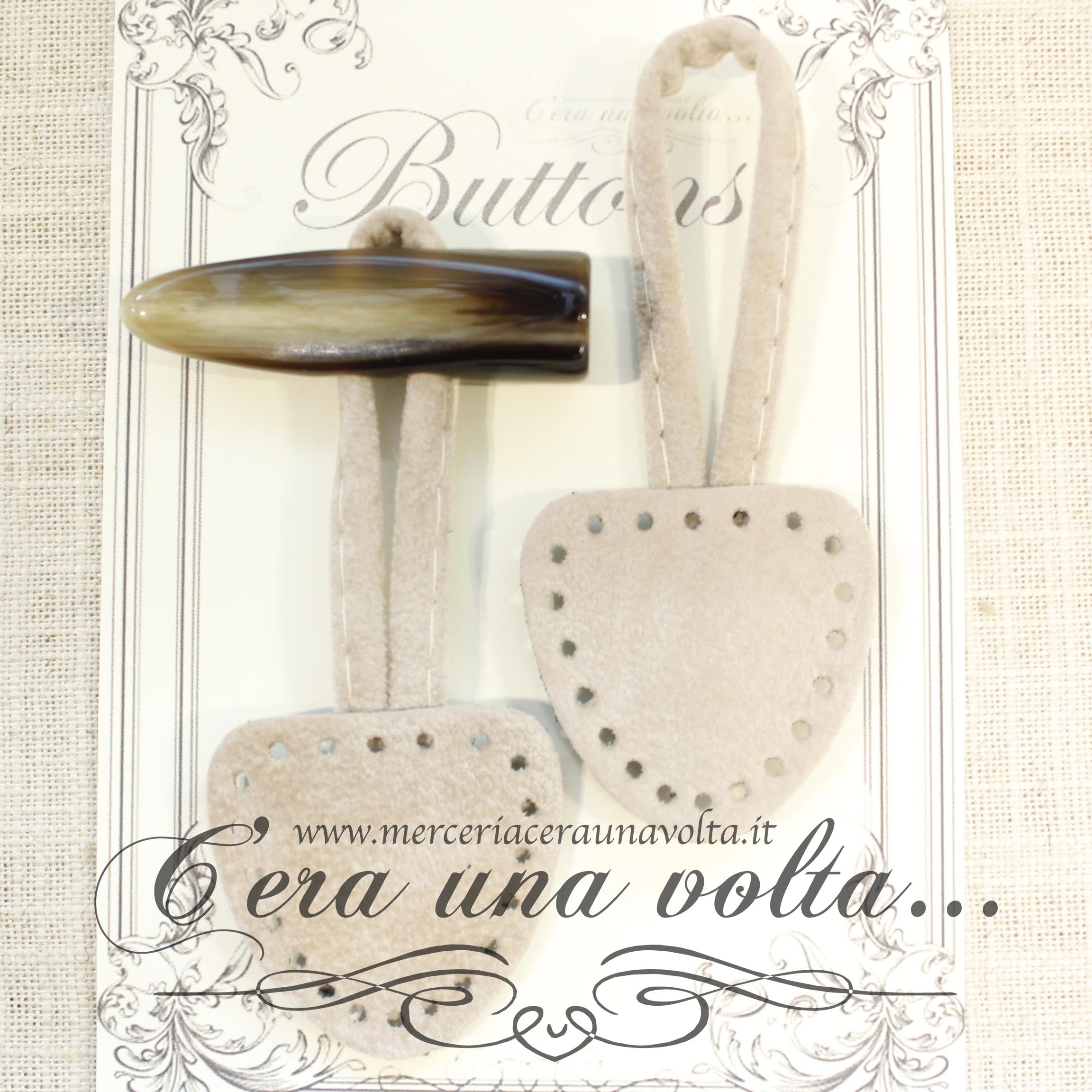 Allacciatura per abbigliamento formata da due parti: una con cordicella ripiegata a formare un'occhiello, l'altra con un bottone che andrà inserito nella prima, in Fibropelle Scamosciata con bottone in poliestere a due fori, adatto per abbigliamento e Montgomery