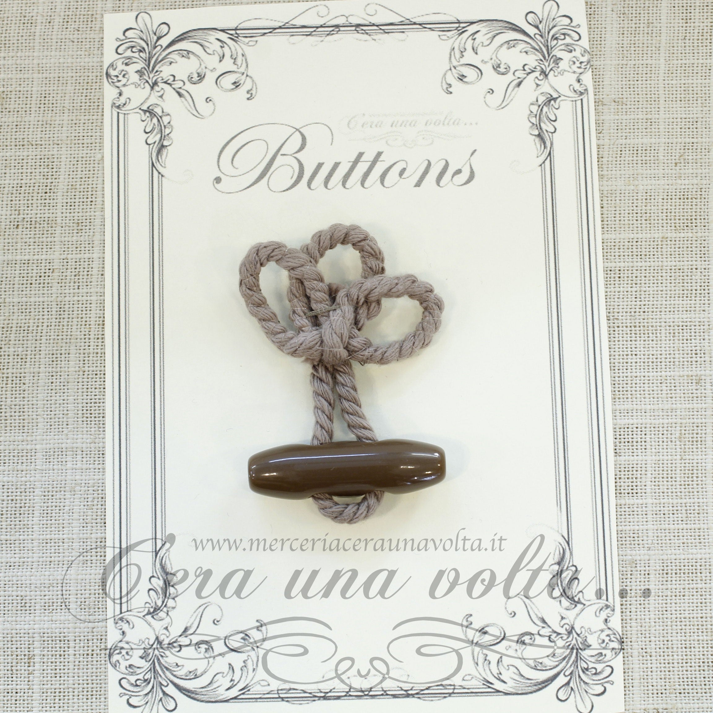 Allacciatura per abbigliamento formata da due parti: una con cordicella ripiegata a formare un'occhiello, l'altra con un bottone che andrà inserito nella prima, in cotone ritorto, con bottone in poliestere a due fori, adatto per abbigliamento e Montgomery