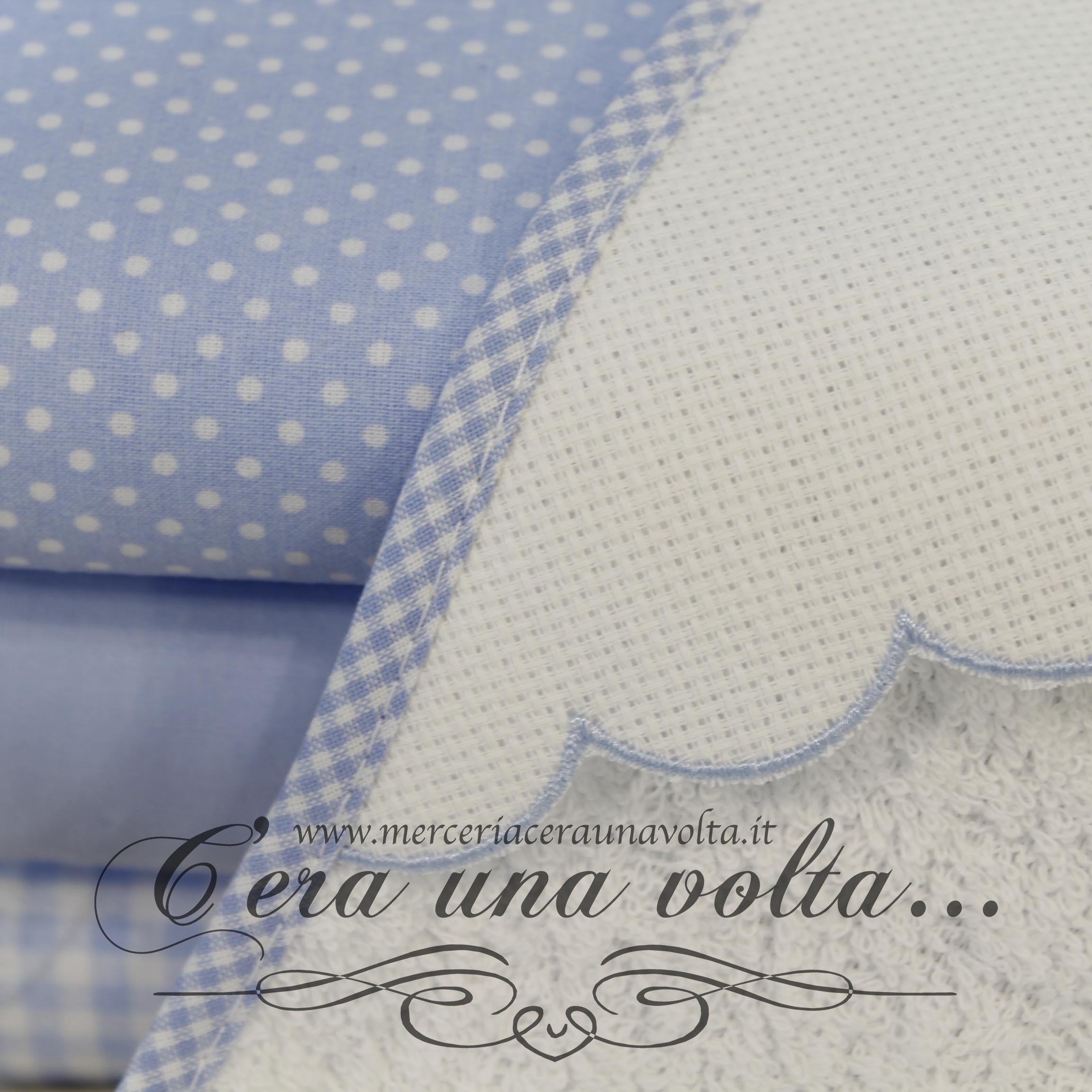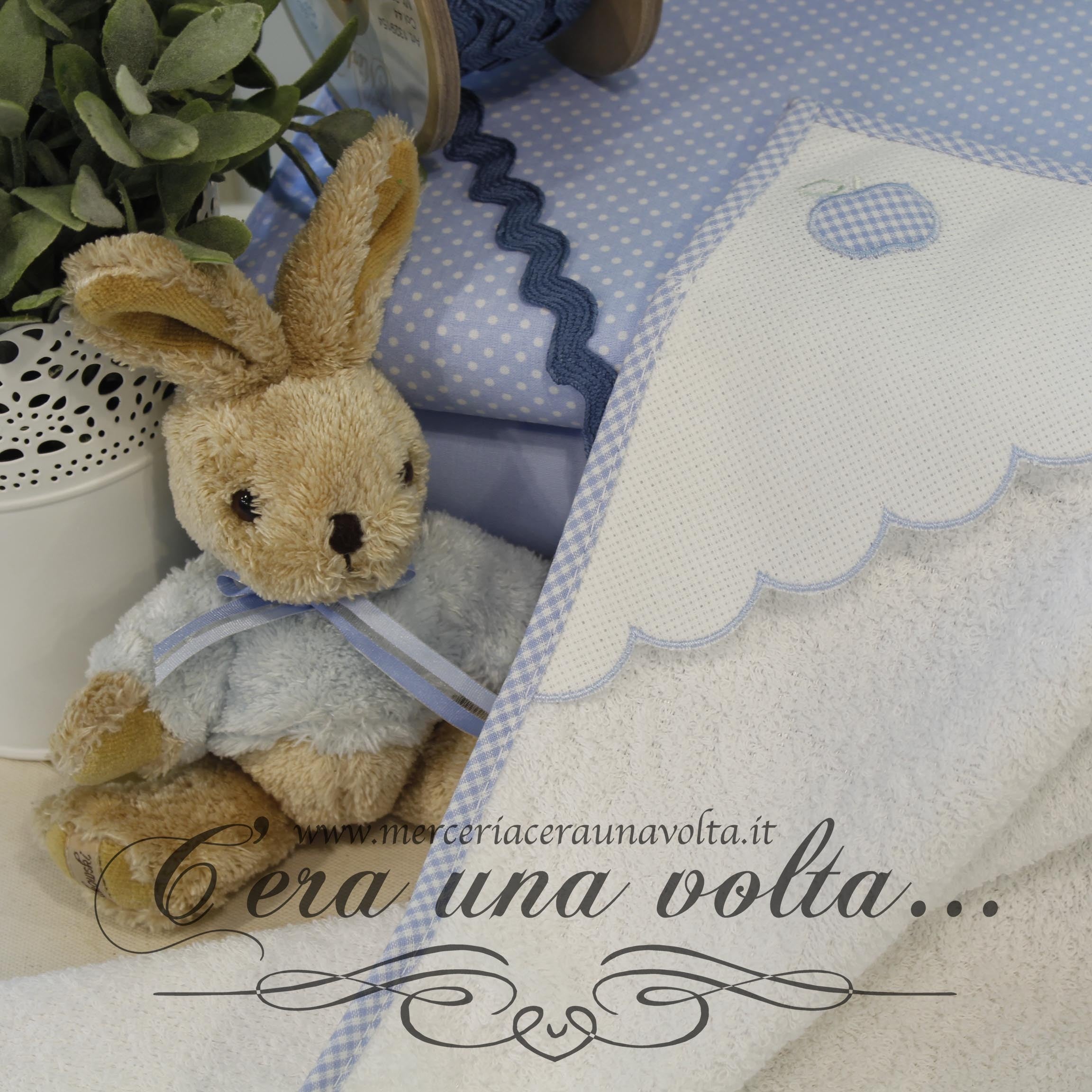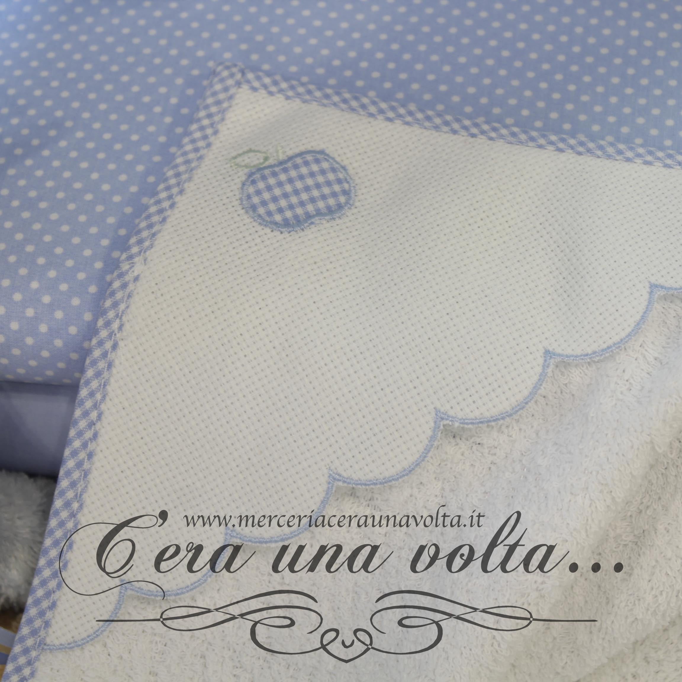 Rifinitura su tutto il perimetro, con fettuccia in cotone con stampa motivo Tartan, per l'asciugamano asilo in spugna extra e inserto in tela Aida 55 smerlato, con applicazione sull'angolo, comoda asola per appenderlo.