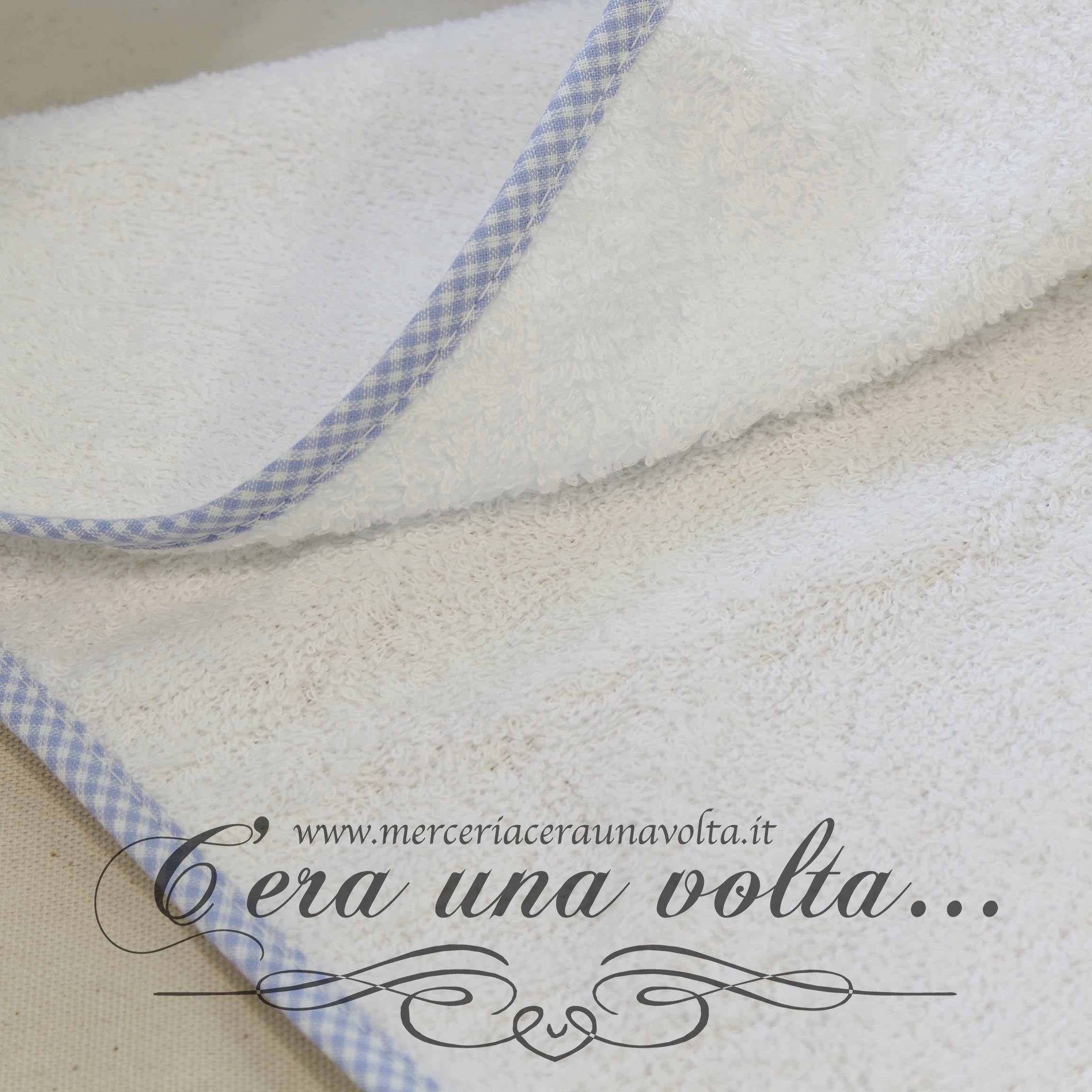 Rifinitura su tutto il perimetro, con fettuccia in cotone con stampa motivo Tartan, per l'asciugamano asilo in spugna extra e...