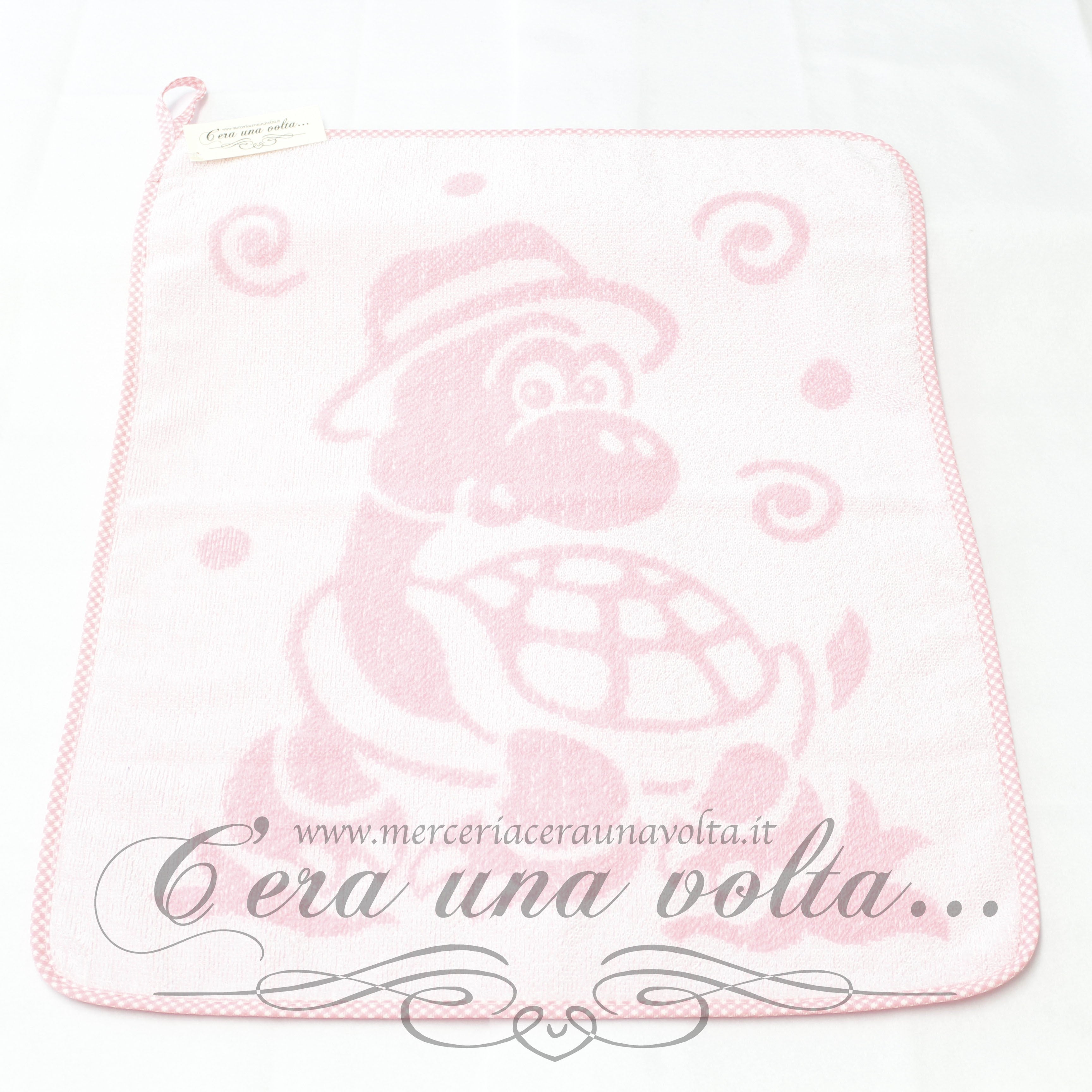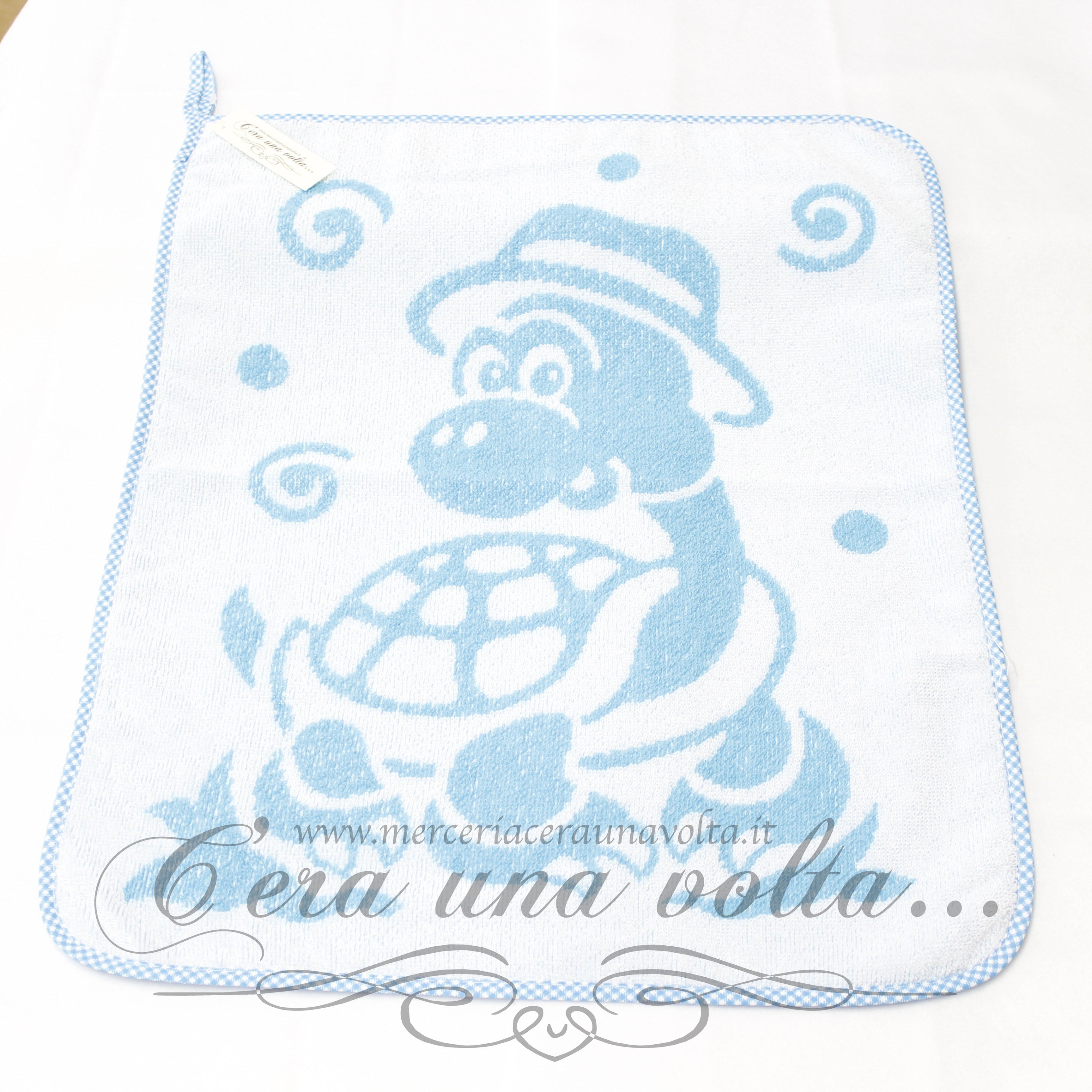 Asciugamano asilo in spugna, raffigurante una tartaruga, con asola per appenderlo e rifinito con fettuccia in cotone stampa vichy su tutto il perimetro.