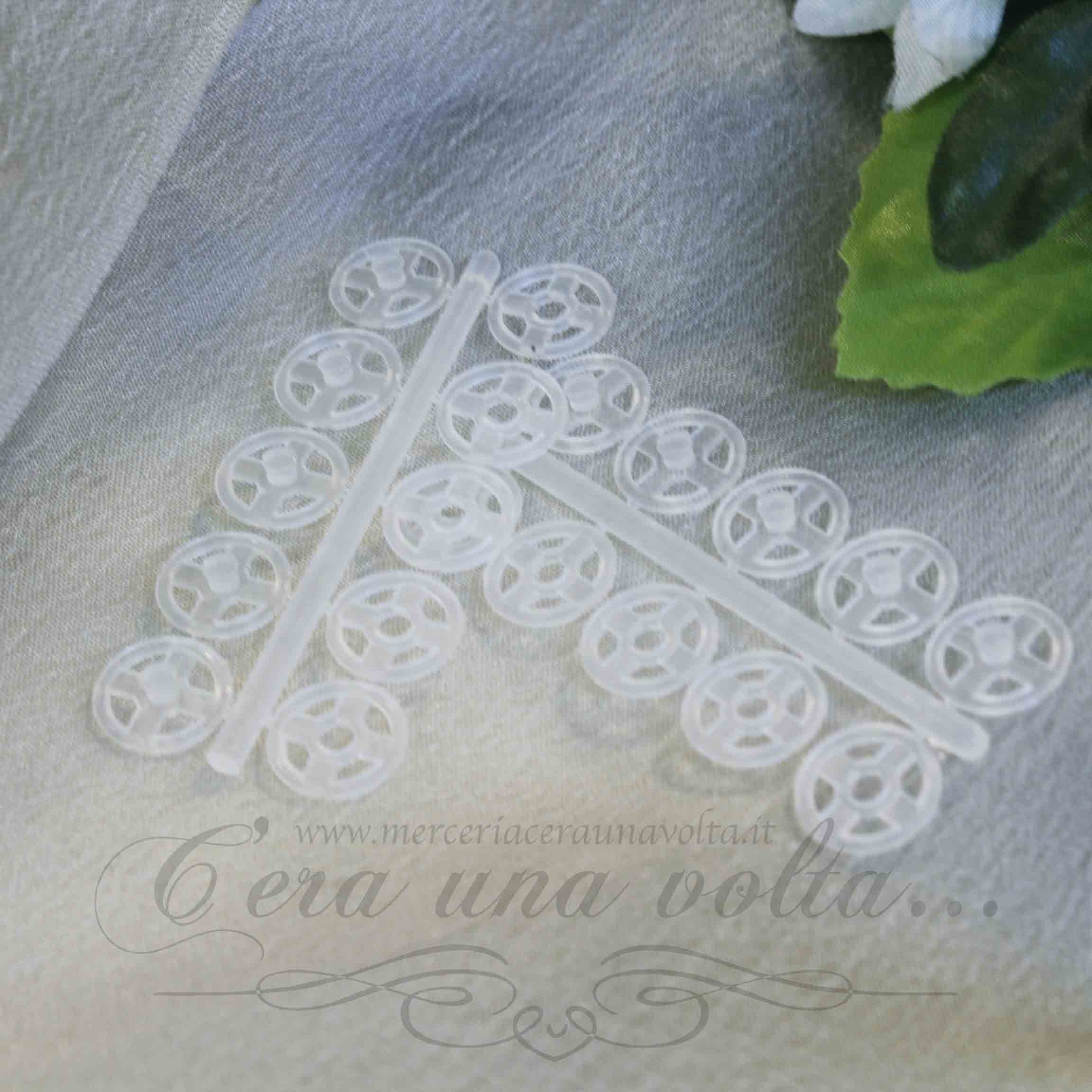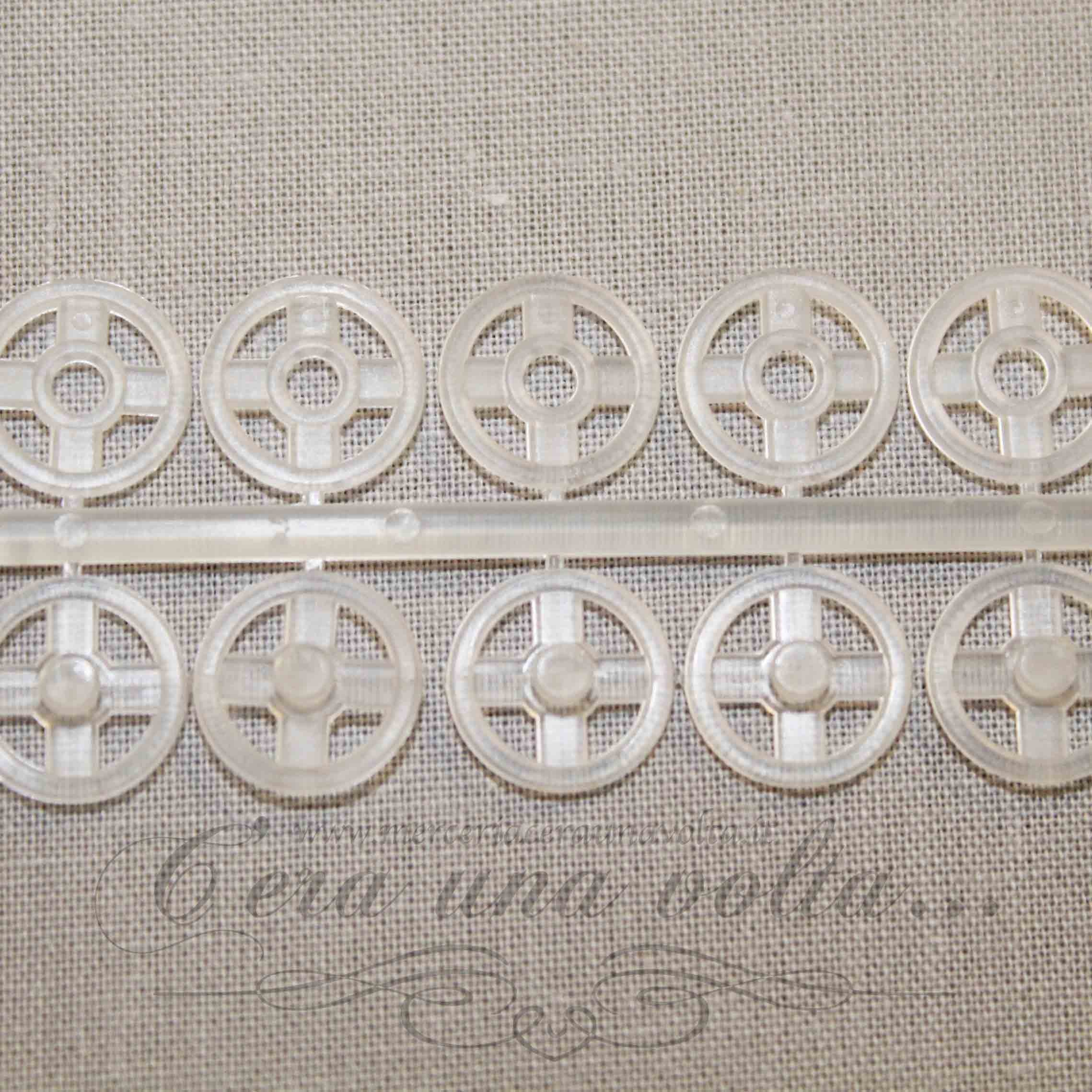 Bottone automatico in plastica infrangilbile trasparente di alta qualità, con foro di posizione, la parte inferiore ha il bordo arrotondato, quindi non presenta spigoli vivi, la stoffa è così protetta da ogni danno. La loro composizione li rende particolarmente adatti per indumenti leggeri. Dotato di 4 fori per la cucitura in modo di assicurare la chiusura a scatto in modo sicuro e durevole. Possono essere lavati a temperature fino a 95°