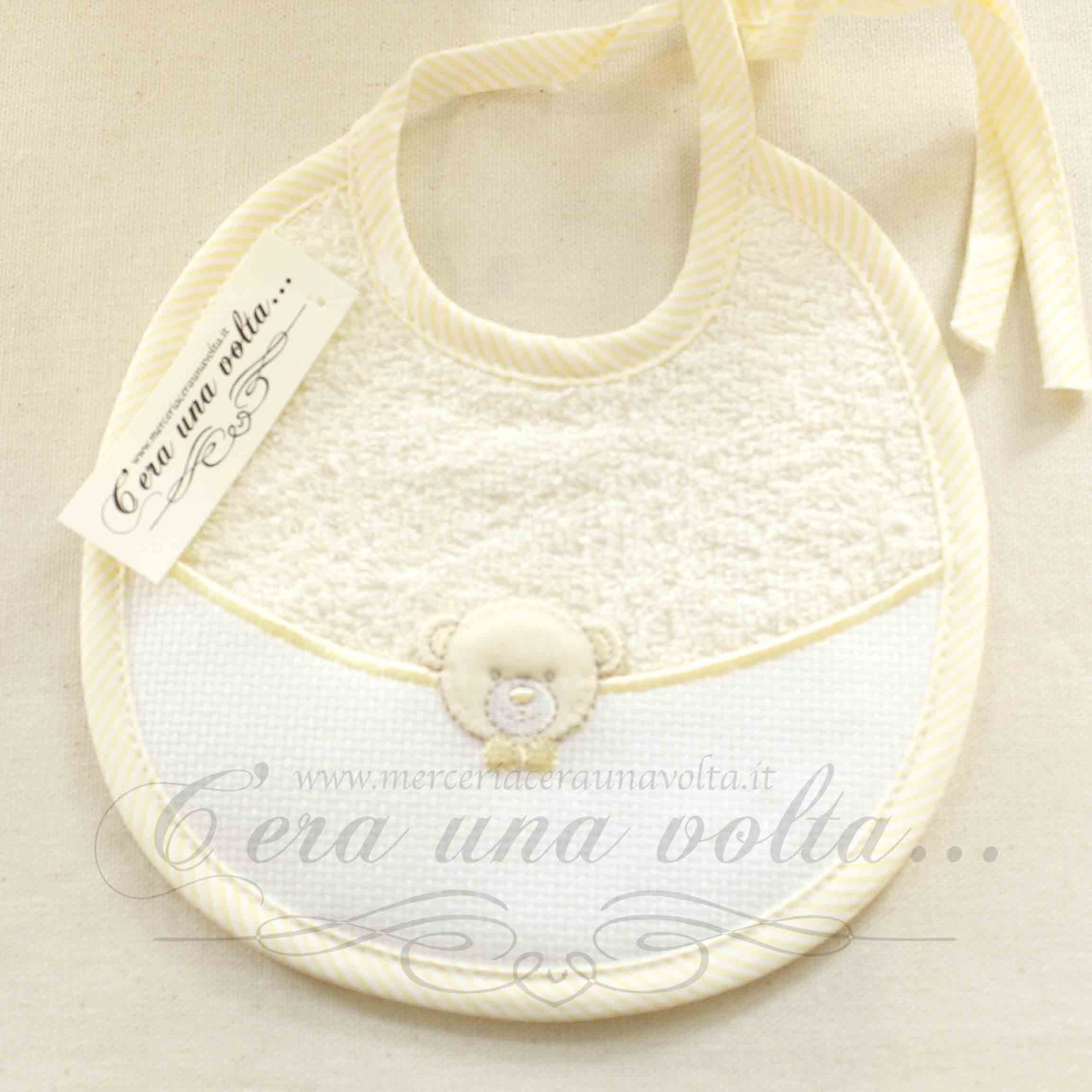 Bavaglino da ricamare in spugna con laccetti sul collo e rifinitura con fettuccia su tutto il perimetro, inserto in tela aida 55 (altezza 26 quadretti) con decorazione applicata. Disponibile in 3 varianti