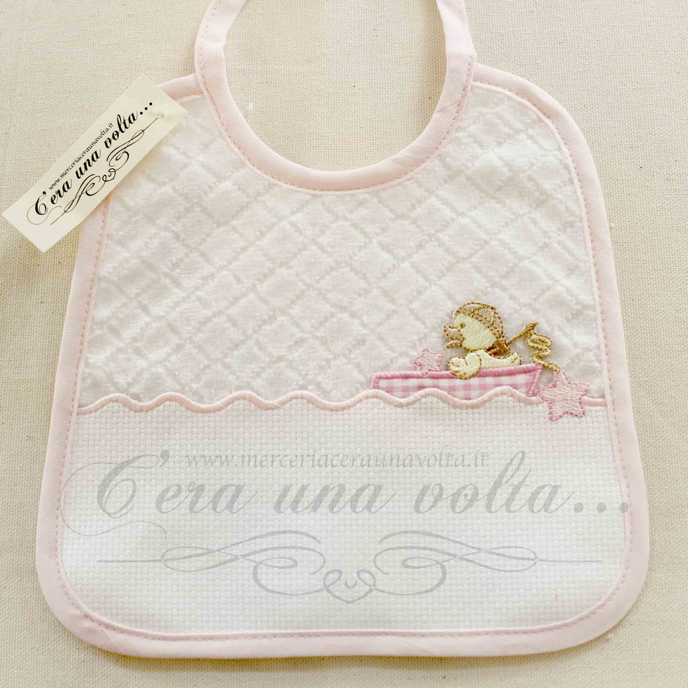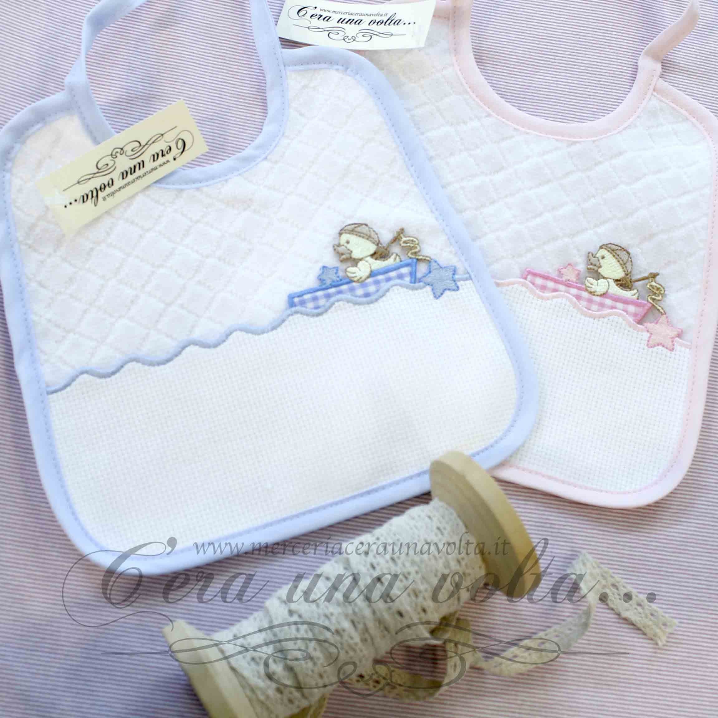 Bavaglino da ricamare in spugna con laccetti sul collo e rifinitura con fettuccia su tutto il perimetro, inserto in tela aida 55 (altezza 38 quadretti) con applicazione. Disponibile in 2 varianti