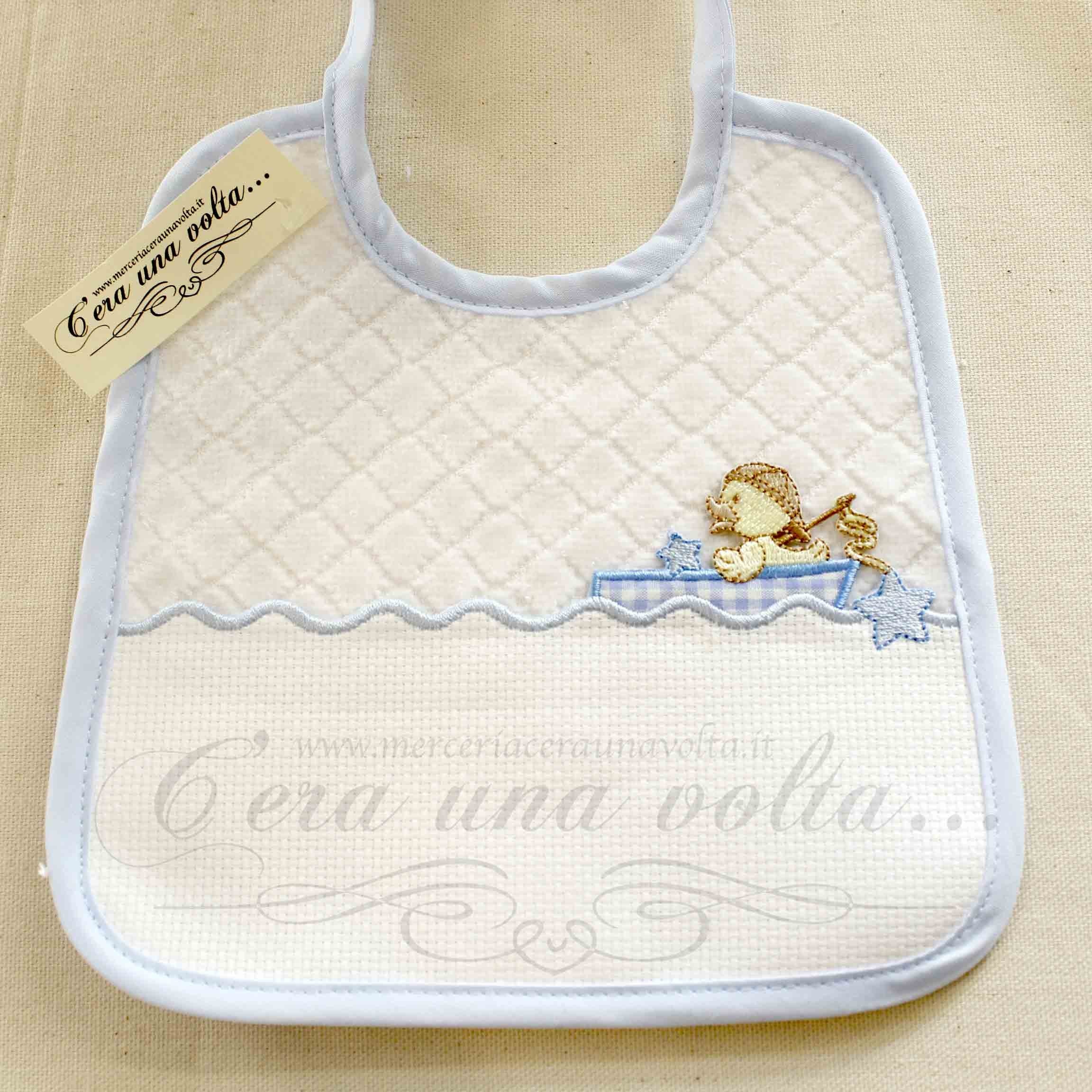 Bavaglino da ricamare in spugna con laccetti sul collo e rifinitura con fettuccia su tutto il perimetro, inserto in tela aida 55 (altezza 38...