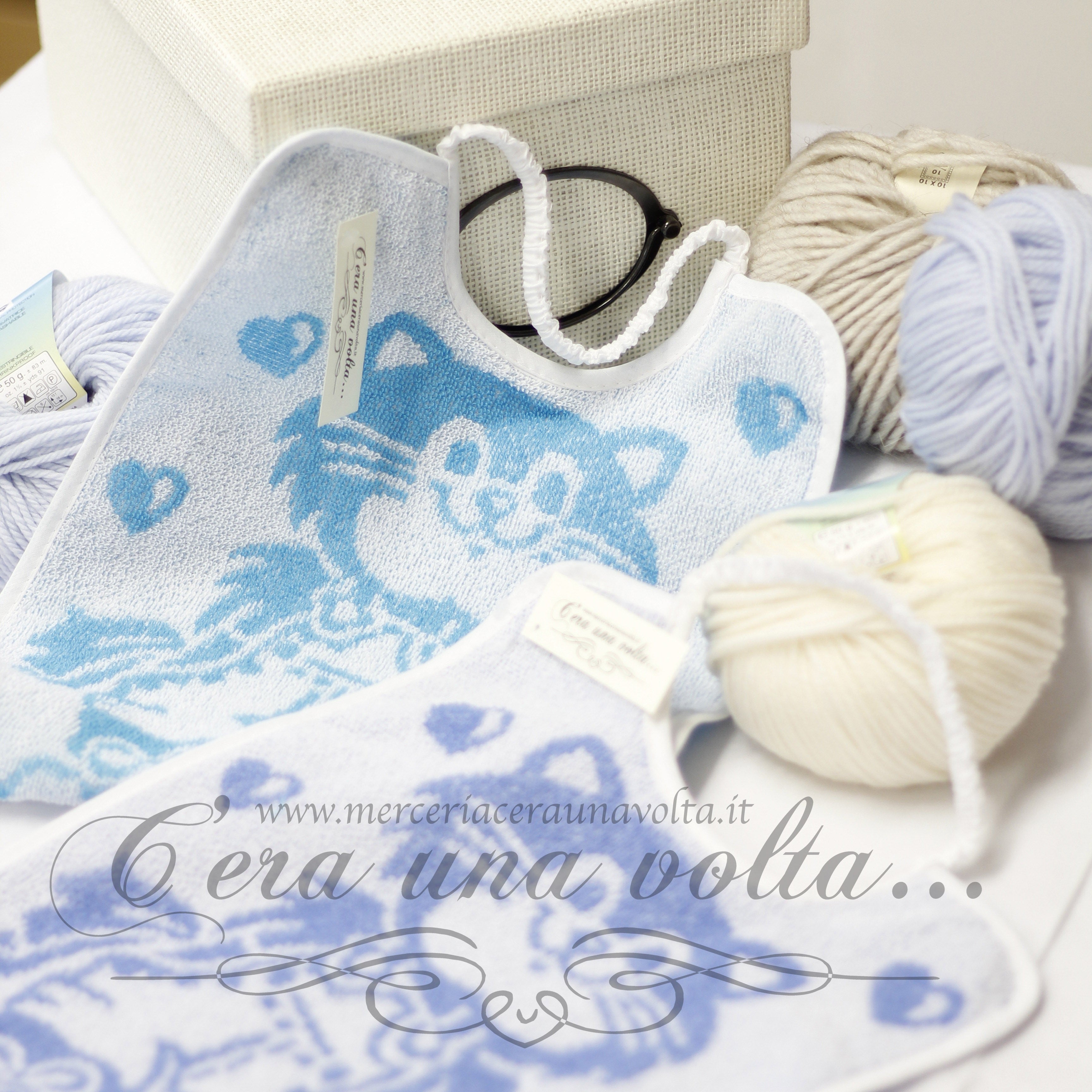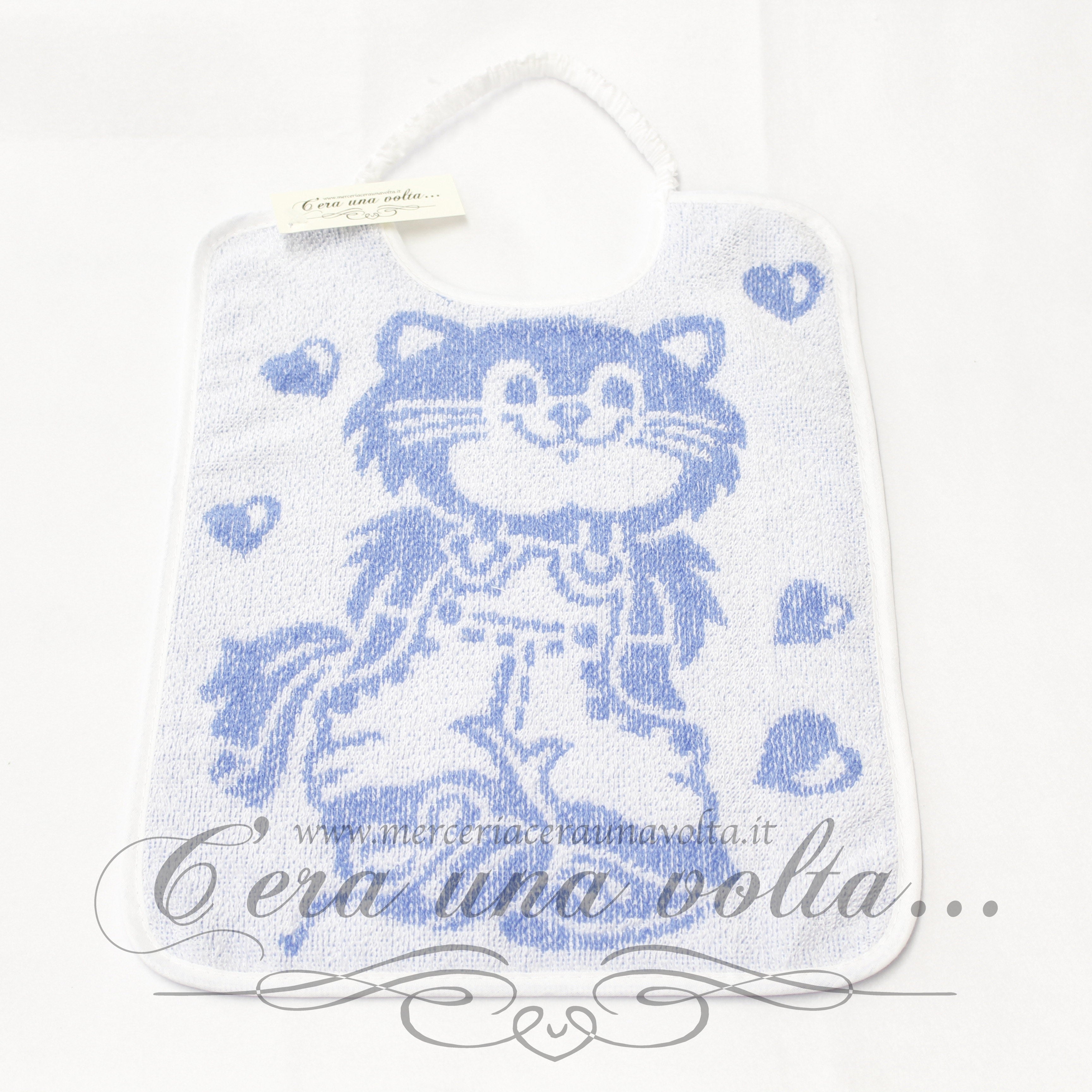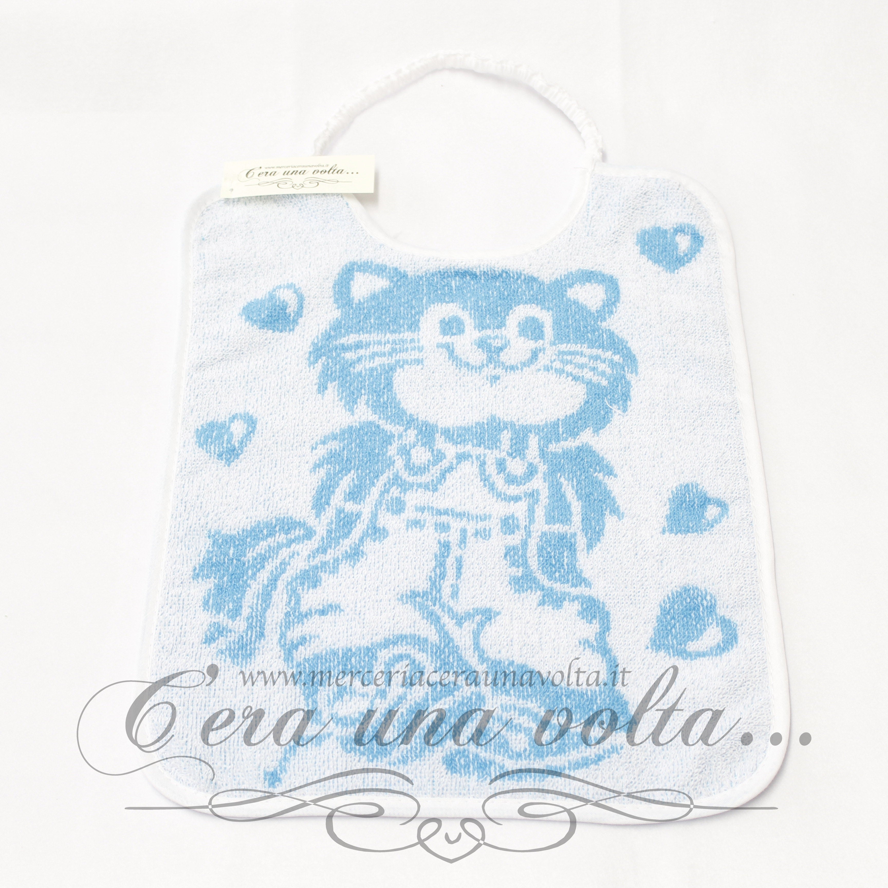 Bavaglino asilo stampato con gattino, elastico sul collo e rifinitura con fettuccia in cotone su tutto il perimetro. Disponibile in due varianti: