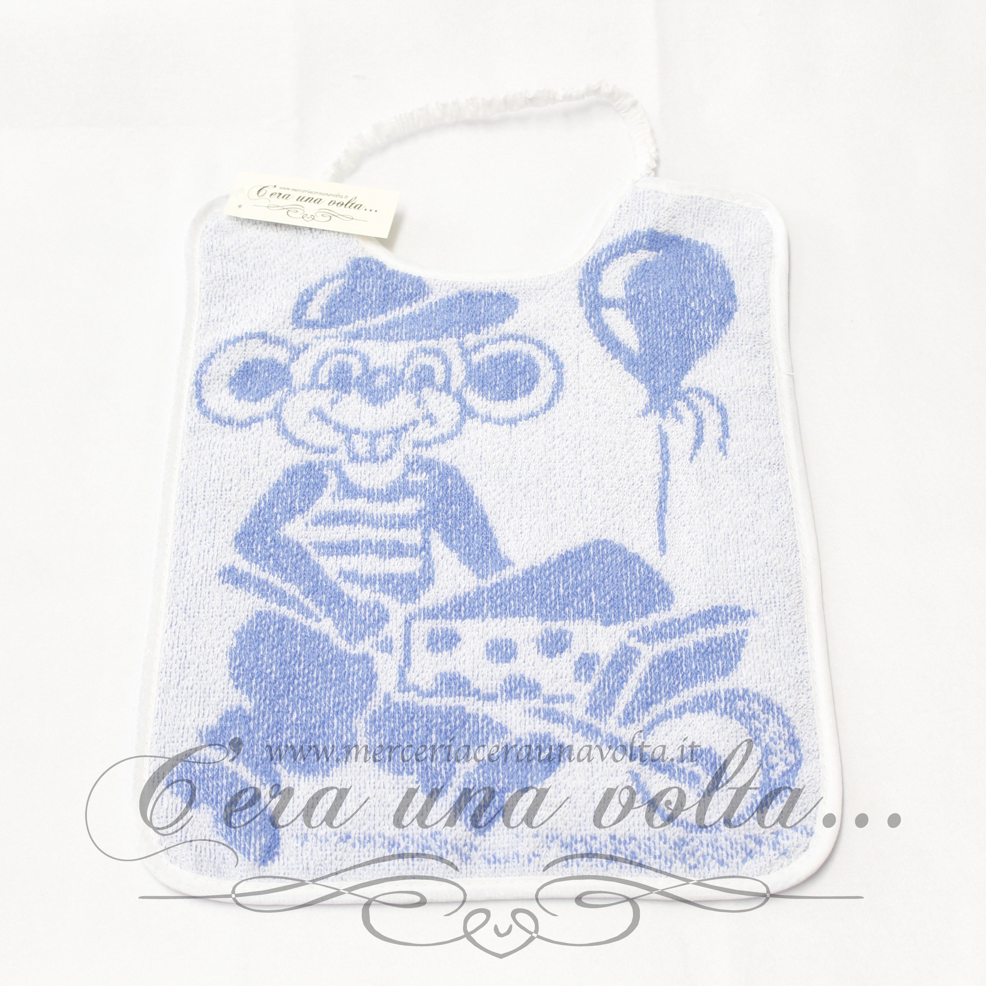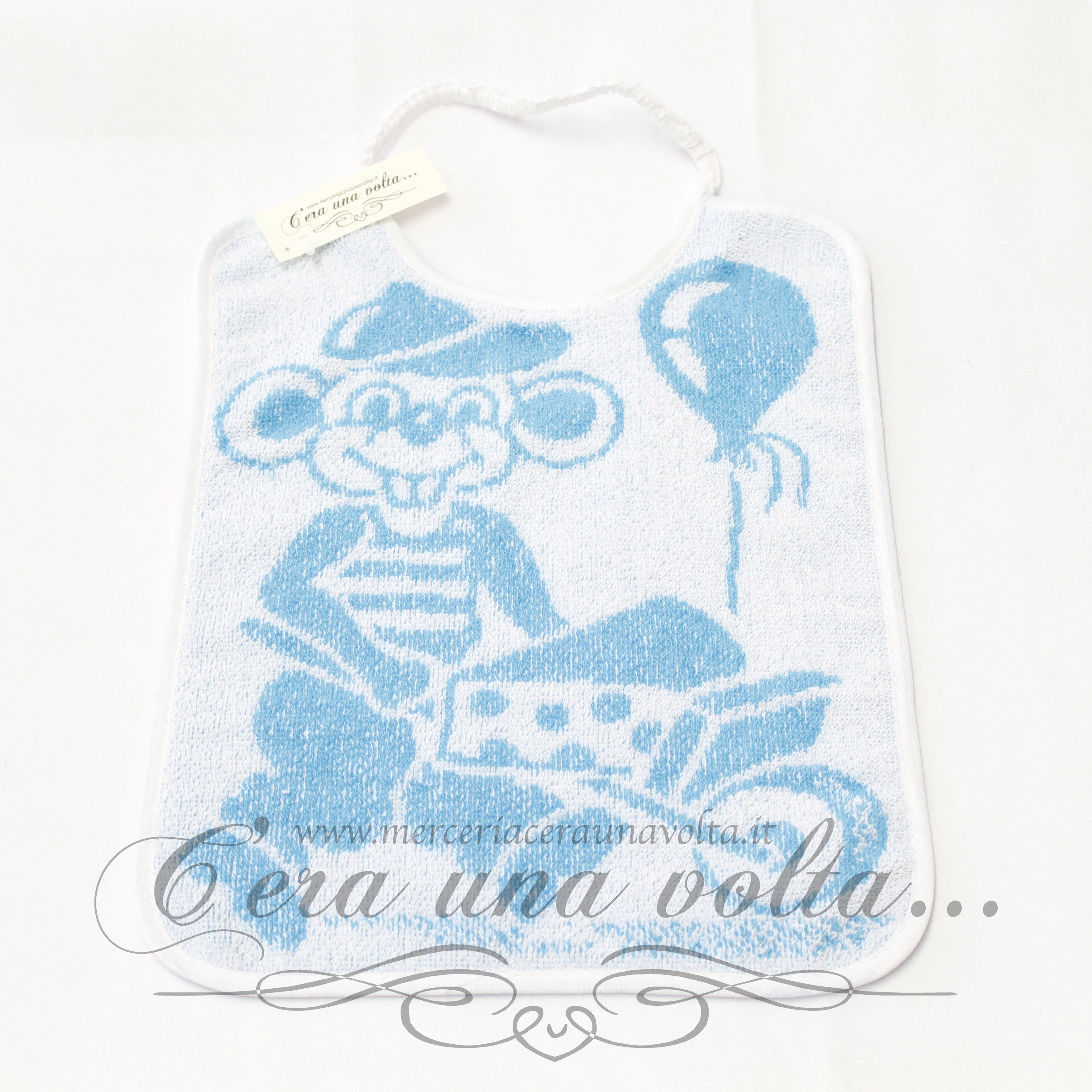 Bavaglino asilo con simpatica stampa, elastico sul collo e rifinitura con fettuccia in cotone su tutto il perimetro. Disponibile in due varianti: