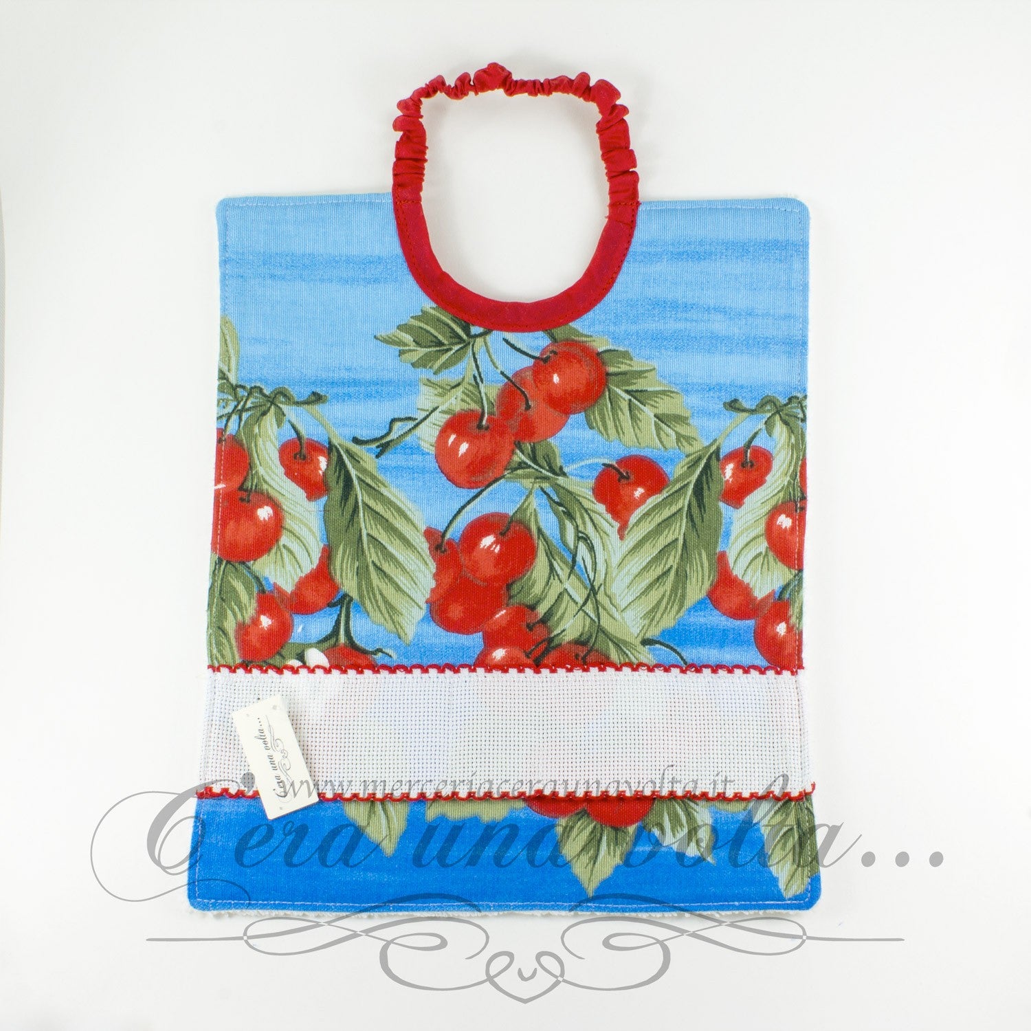 Bavaglino con elastico sul collo con bellissima stampa colorata raffigurante delle gustose ciliege; la tela di cotone sul davanti incontra un retro in spugna extra per una super protezione, inserto in tela aida 55 (altezza 23 quadretti)