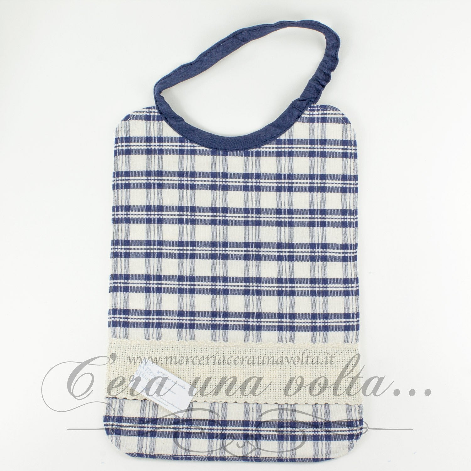Bavaglino con elastico sul collo su fondo in delicato tessuto tartan con fili di colori diversi che si ripetono con uno schema definito, uguale sia nell'ordito che nella trama, i blocchi di colore si ripetono verticalmente e orizzontalmente in un modello distintivo di quadrati e linee che, intrecciandosi, danno l'apparenza di nuovi colori miscelati da quelli originali; risalta un inserto in tela aida 55 (altezza 23 quadretti)