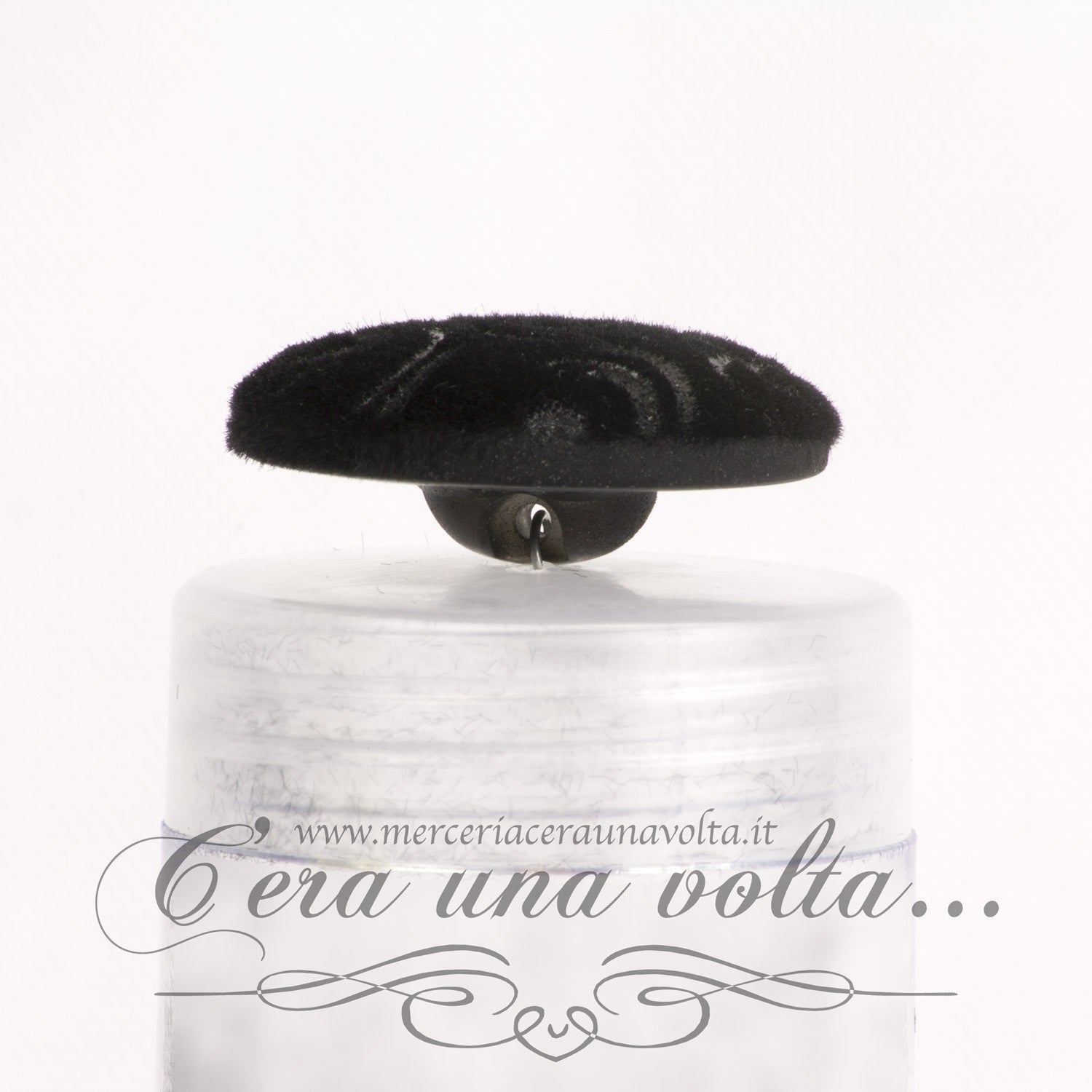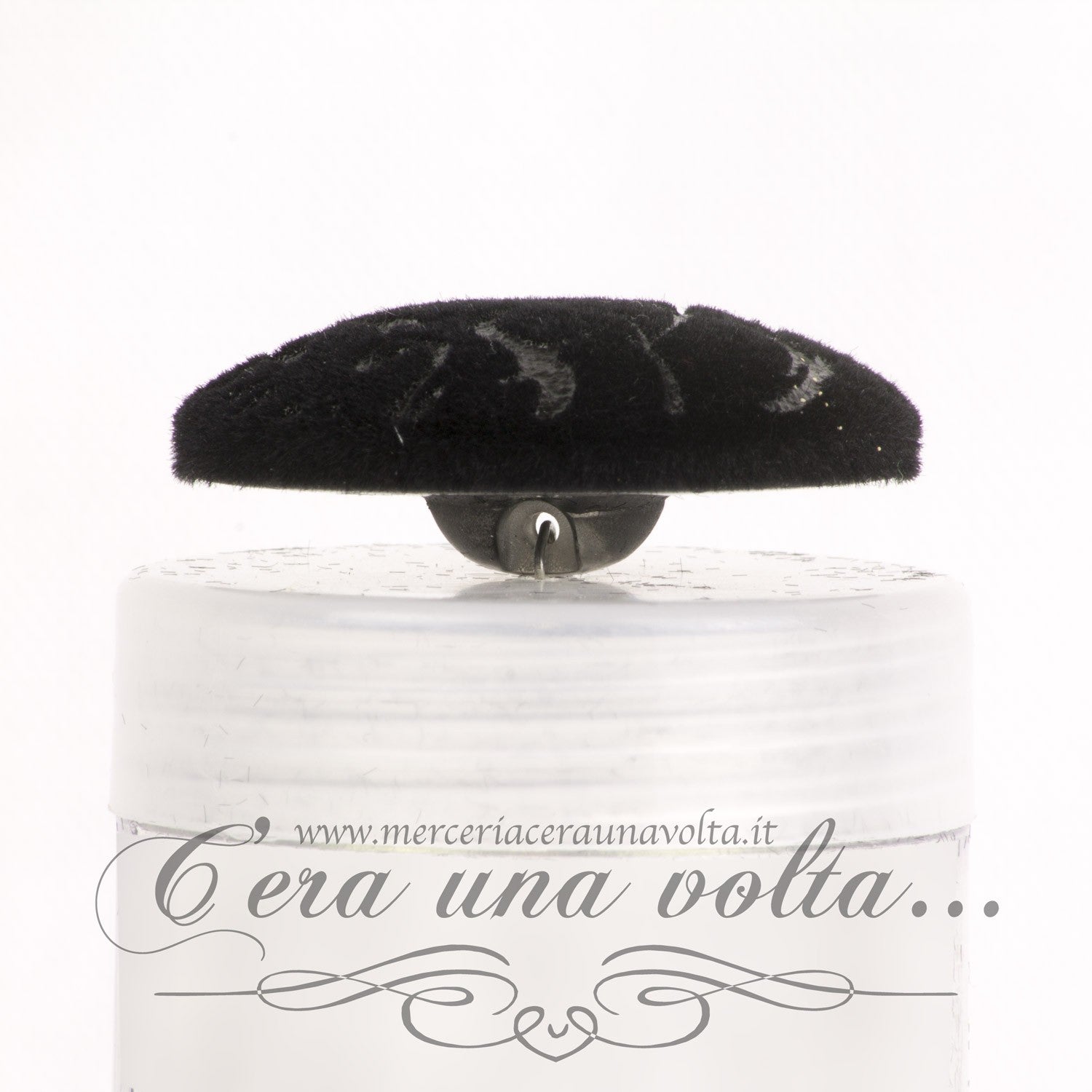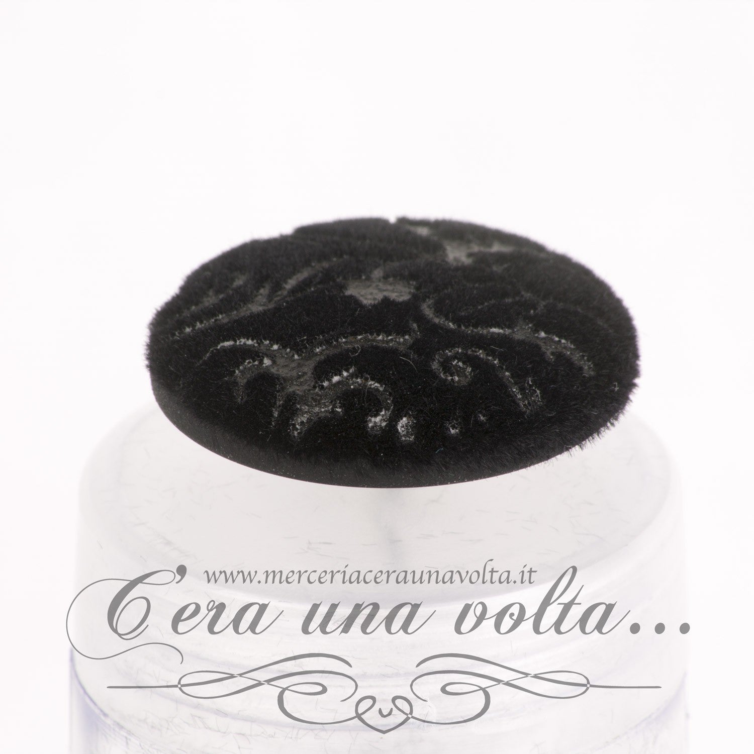 Bottone ricoperto con velluto serigrafato, elegantissimo.