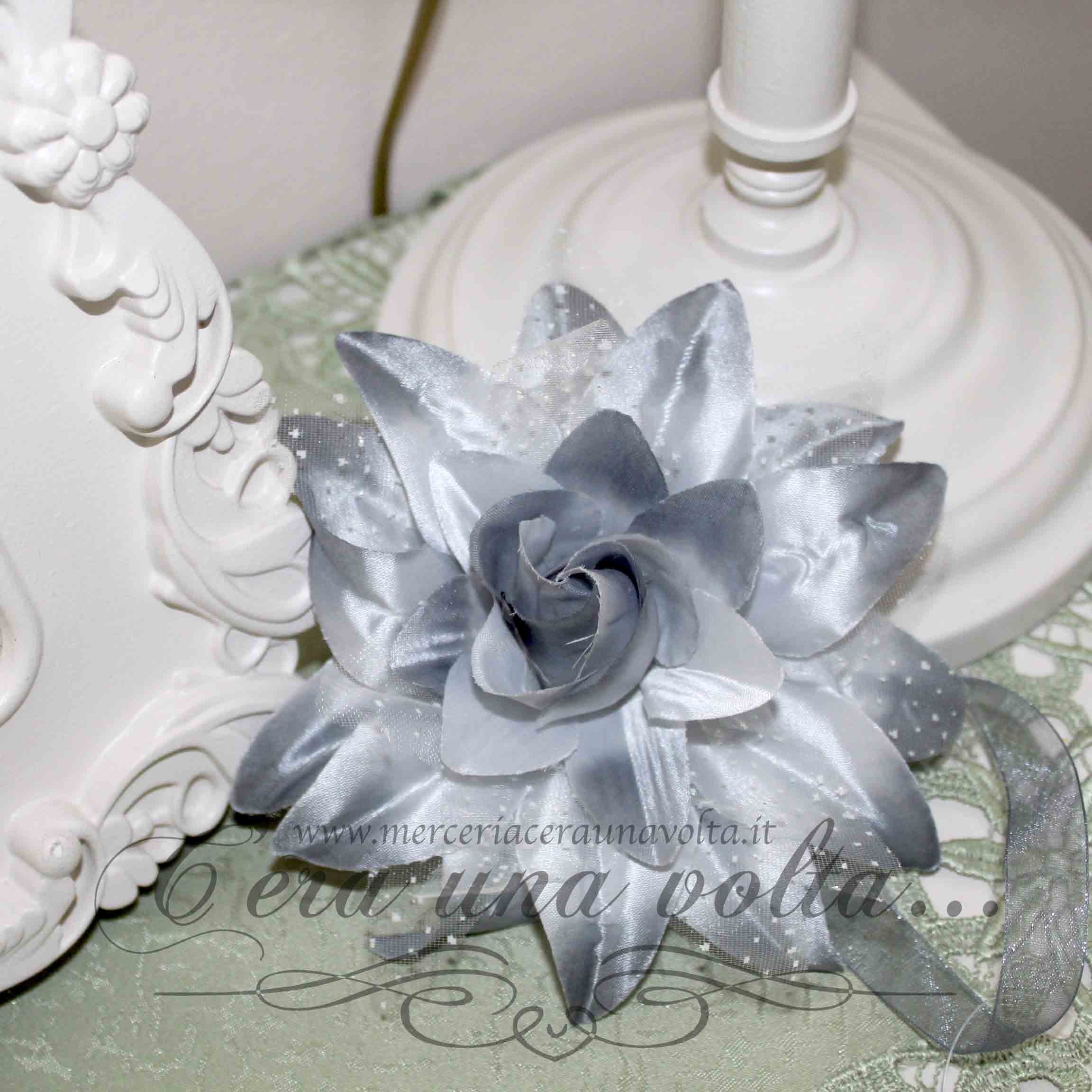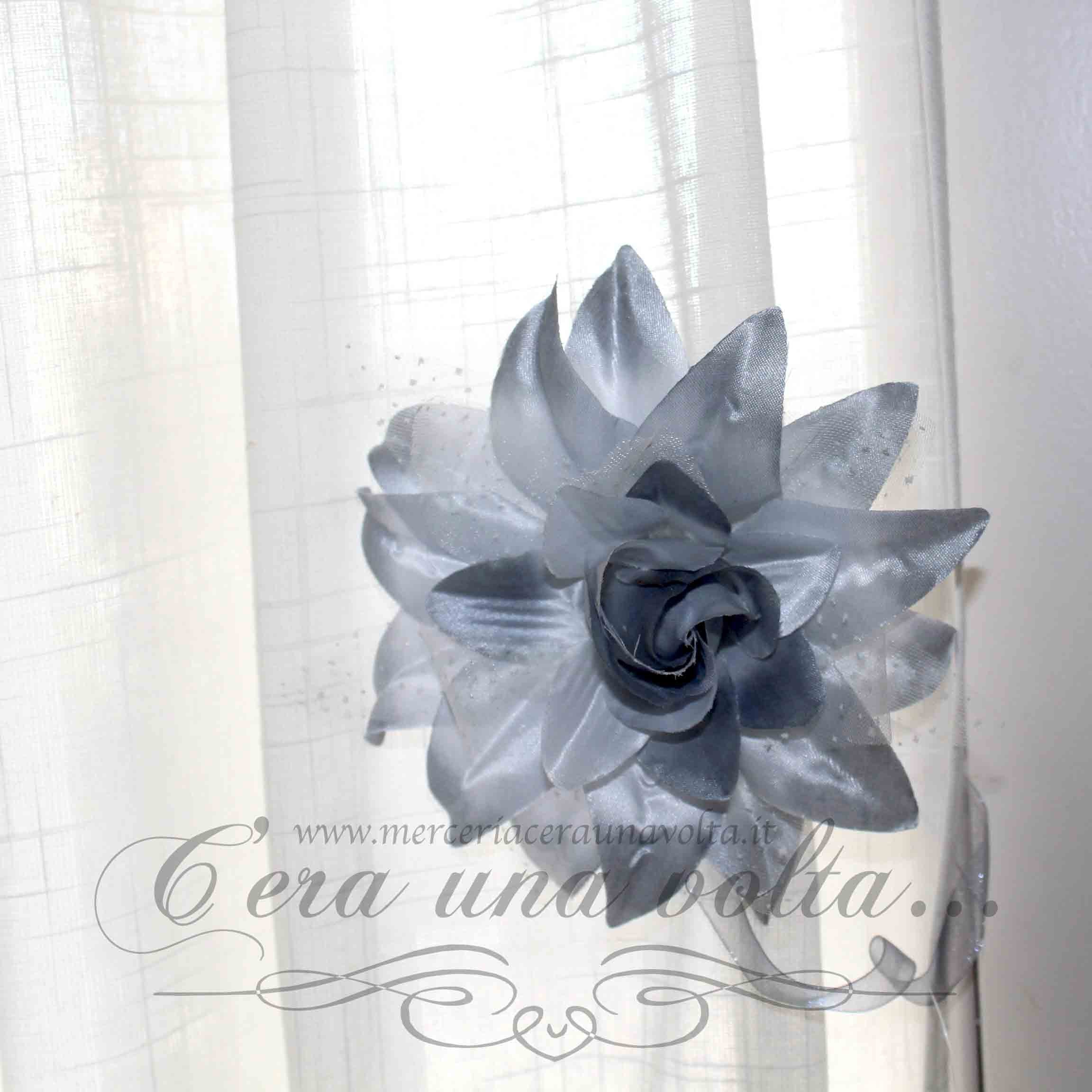 Calamita per tende con fiore, formata da due magneti: da una parte è applicato un bellissimo fiore Azzurro con petali in chiffon, dall'altra un bottone calamita, uniti tra loro da un nastro in organza lungo 25 cm