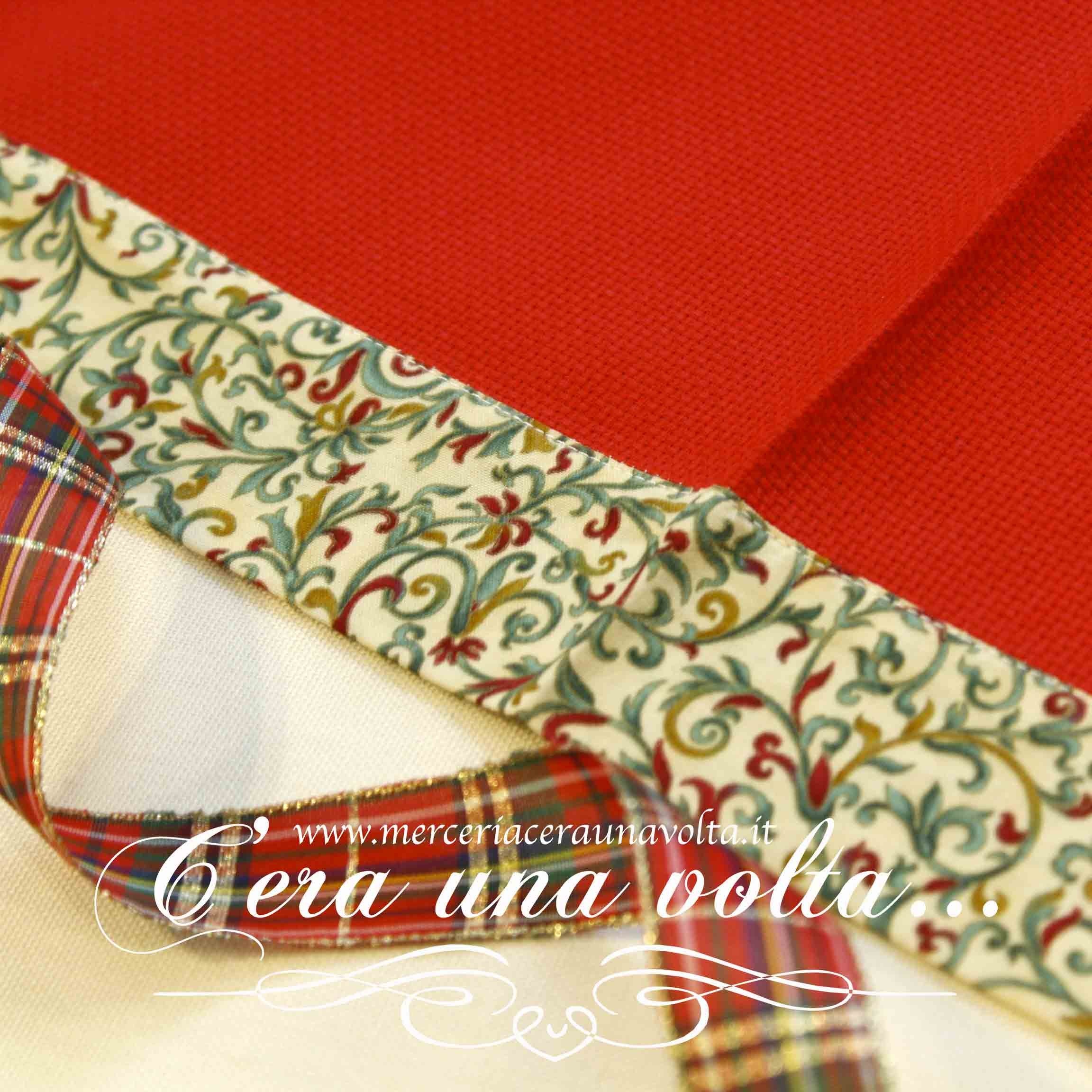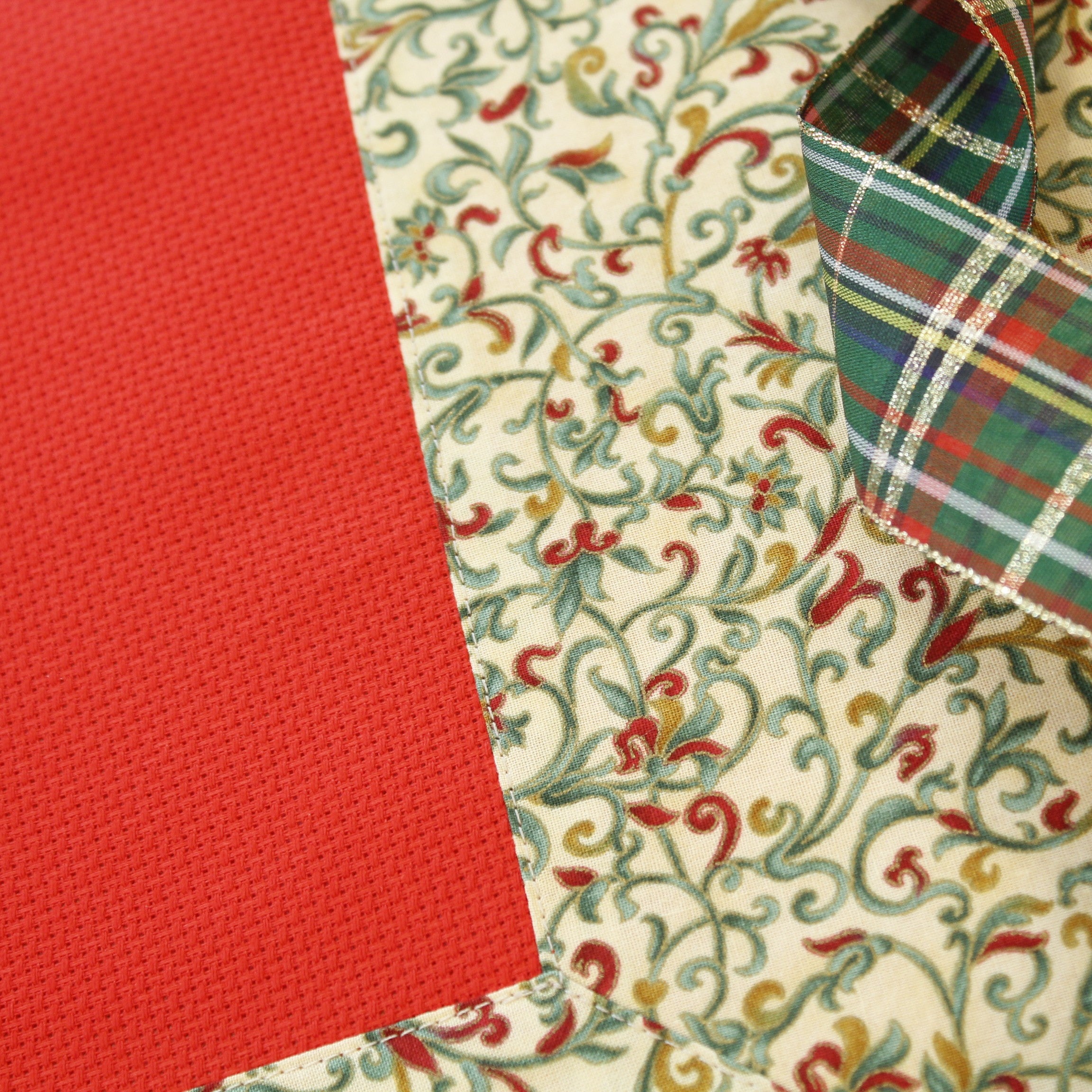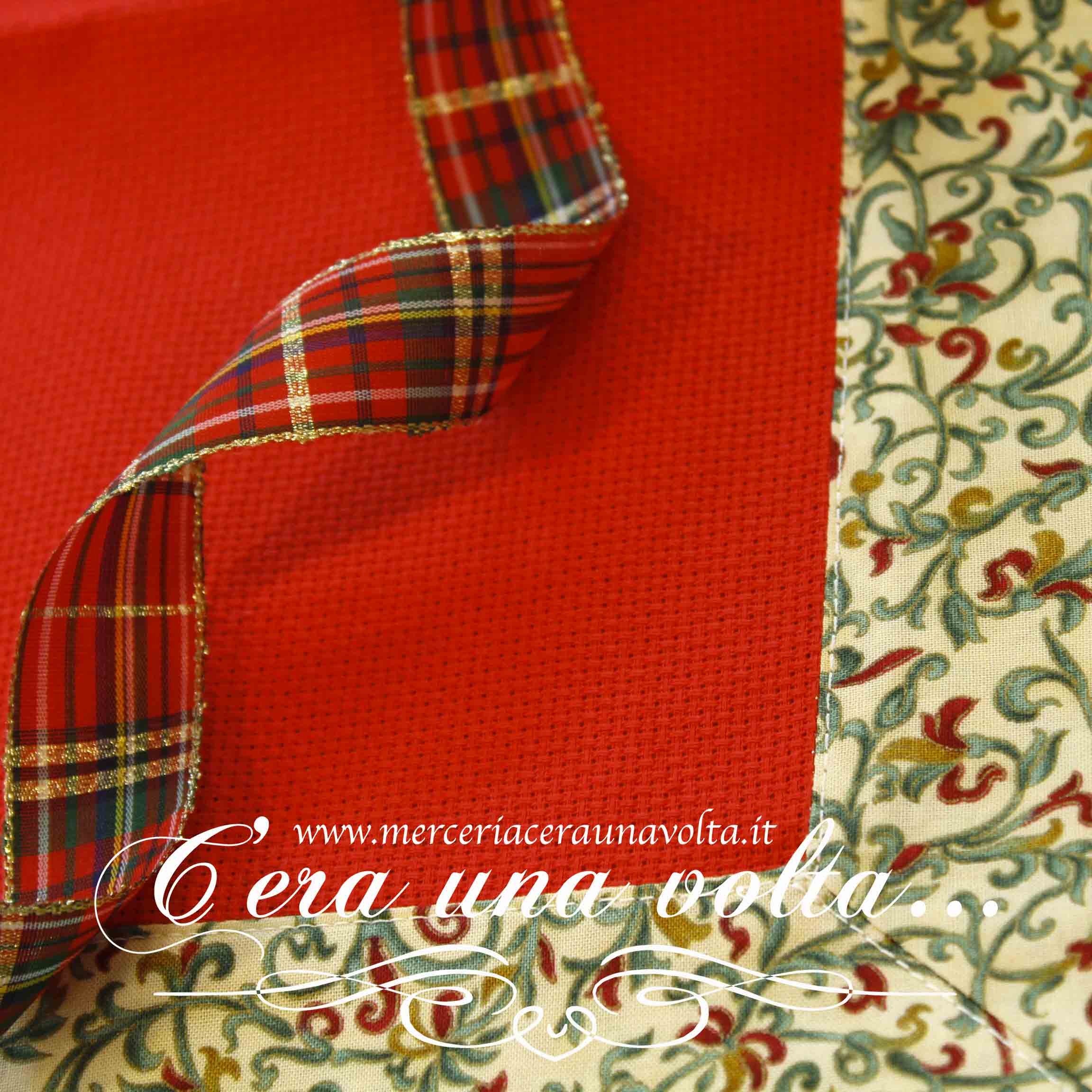 Centro rettangolare Elegant, personalizzabile grazie all'inserto in tela aida rossa ricamabile. Il perimetro è impreziosito da un bordo stampato a tema natalizio, un elegante disegno vettoriale che dona un'allure magica e ricercata