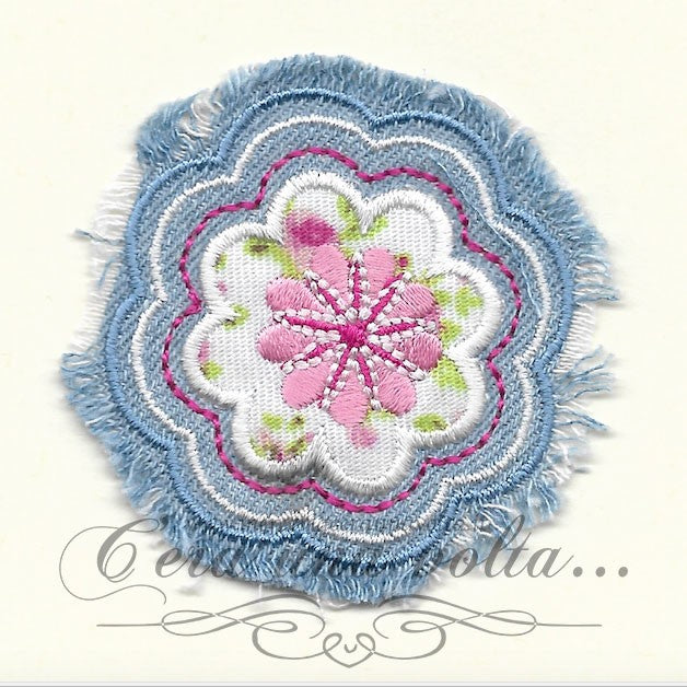 Etichetta termo adesiva fiore denim Colore Denim Chiaro, Rosa, Verde e BiancoDiametro: 5,5 cmForma: circolare a fioreComposizione: 100% CotoneUtilizzo:1. Fai scaldare il...