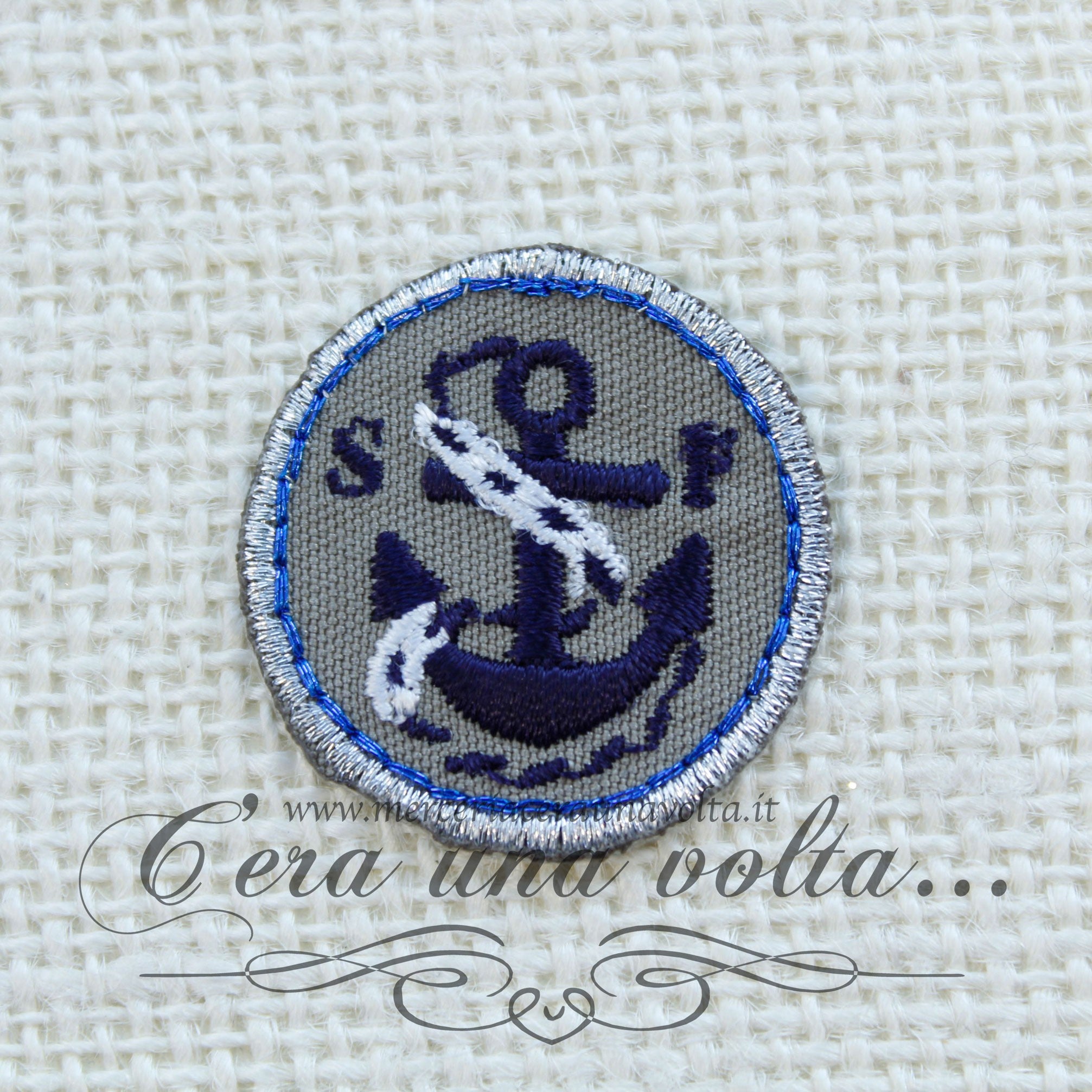 Etichetta termo adesiva rotonda ancora Colore Grigio, Blu, Bianco e Argento Diametro: 3 cmForma: circolareComposizione: 100% CotoneUtilizzo:1. Fai scaldare il ferro da stiro...