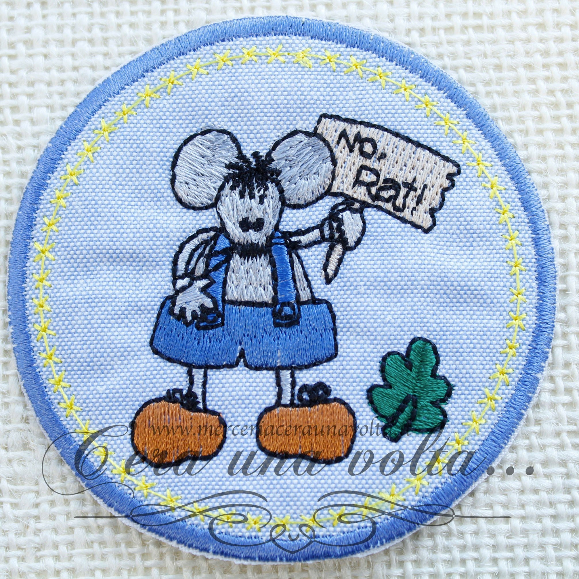 Etichetta termo adesiva rotonda RatColore Azzurro, Celeste, Blu, Grigio, Giallo e VerdeDiametro cm 7,5Composizione: 100% CotoneUtilizzo:1. Fai scaldare il ferro da...