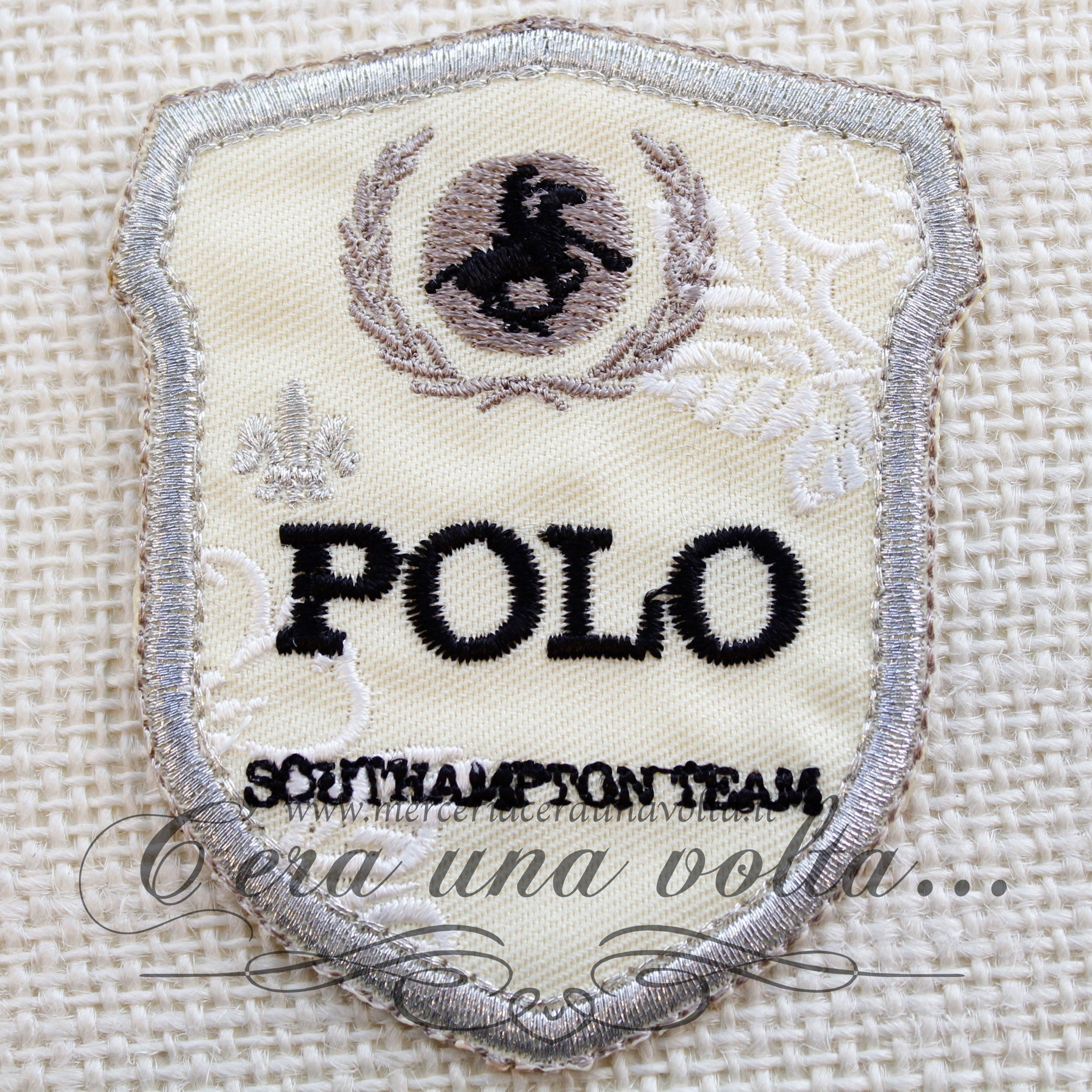 Etichetta termo adesiva stemma PoloColore Avorio, Nero, Tortora, Bianco e ArgentoScritta Polo sout hampton teamDimensione h cm 8 x L 6,7 cmComposizione:...