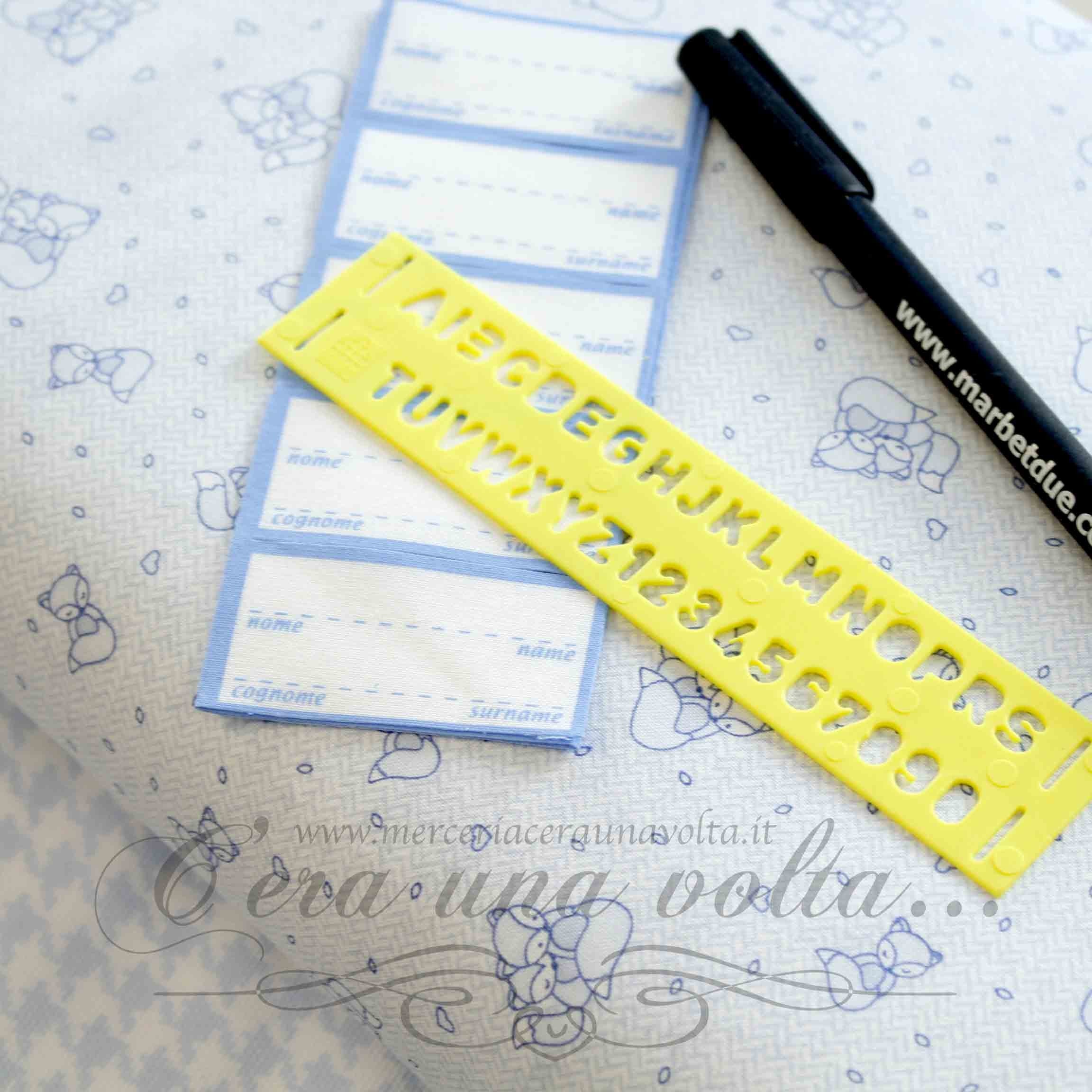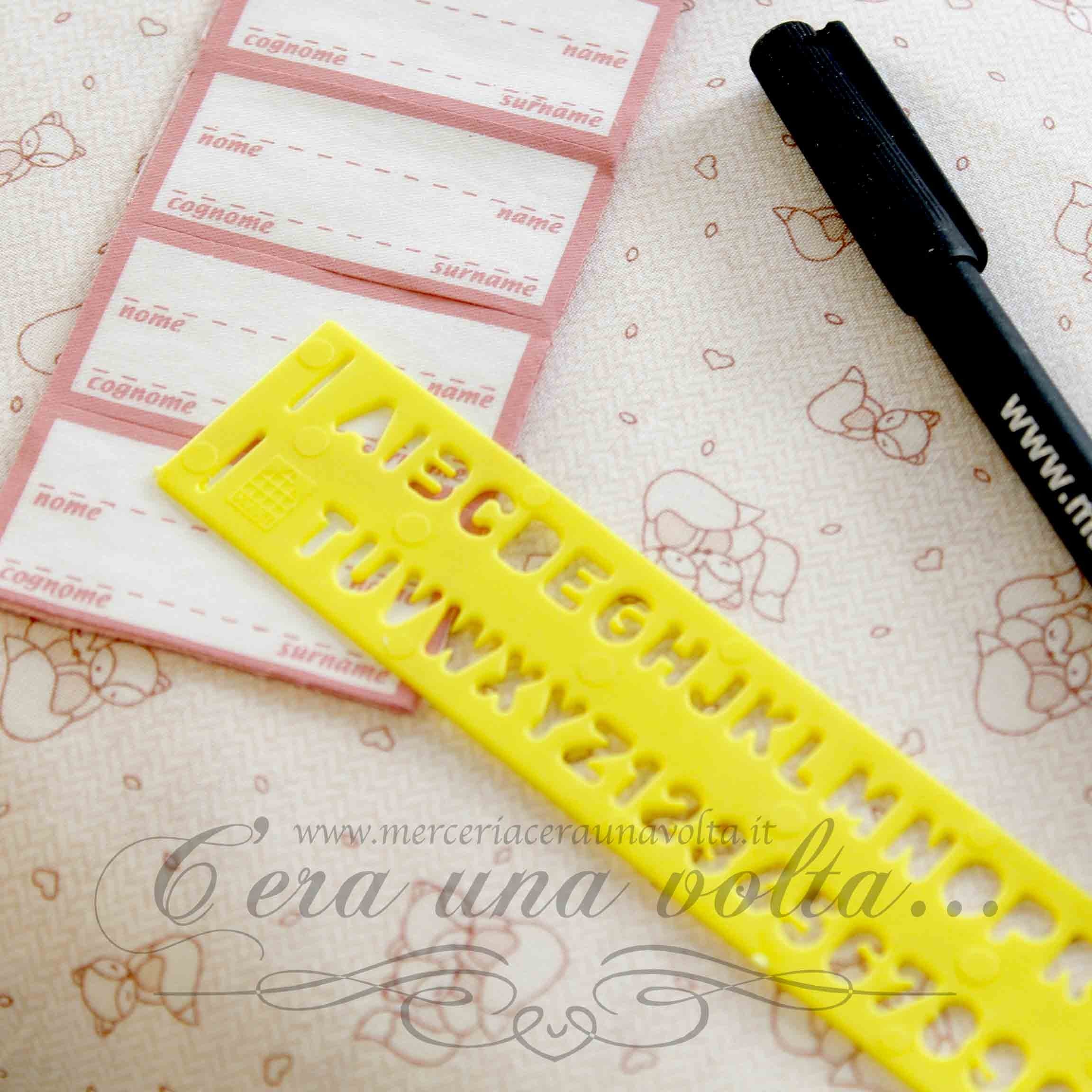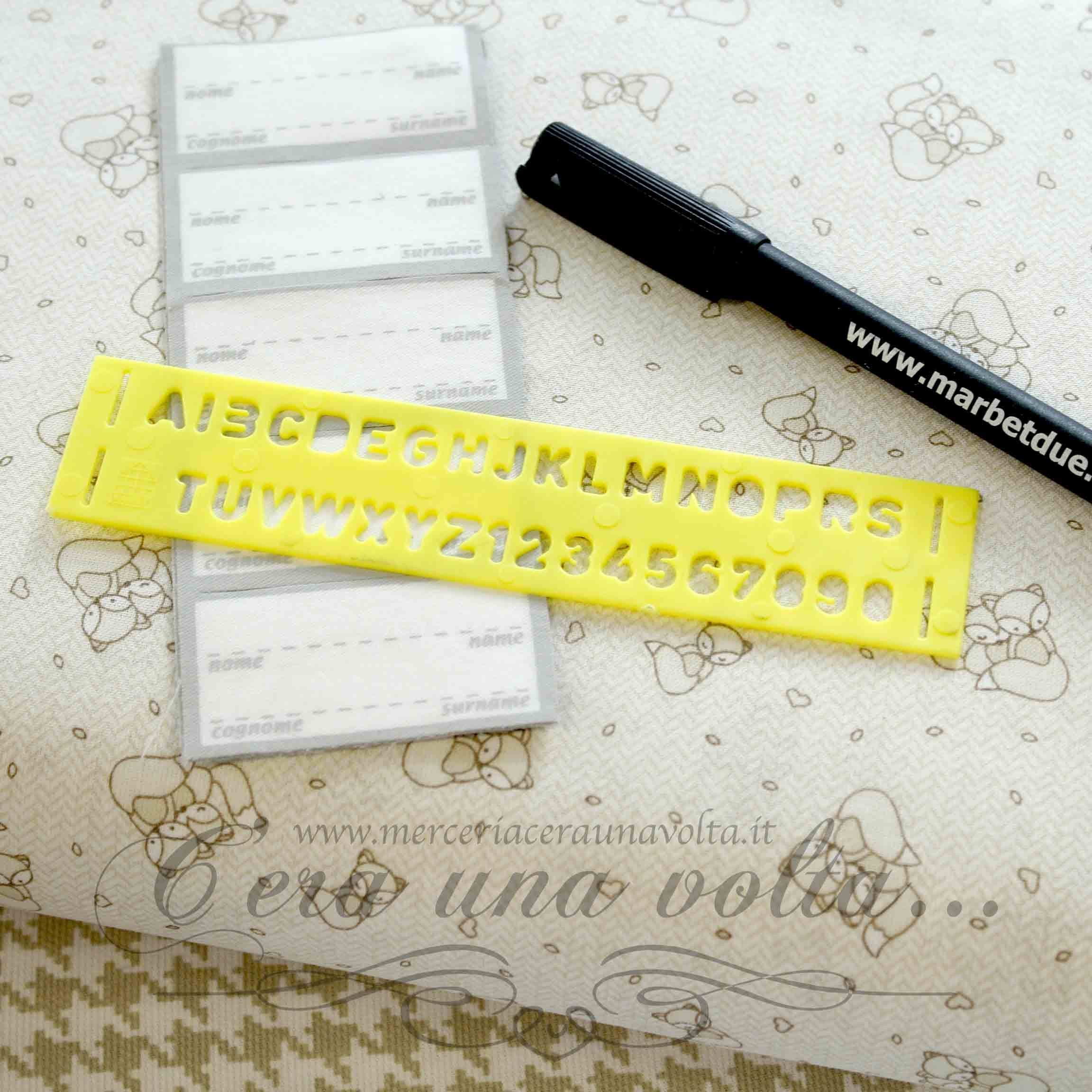 Set per personalizzare indumenti ed altro in modo pratico e veloce, composto da 15 etichette termoadesive, un pennarello indelebile ai lavaggi e un normografo. Si applicano semplicemente con il ferro da stiro. Disponibile in 3 varianti