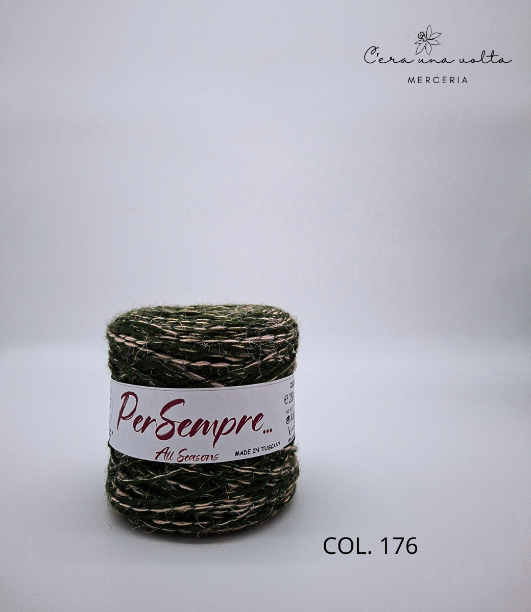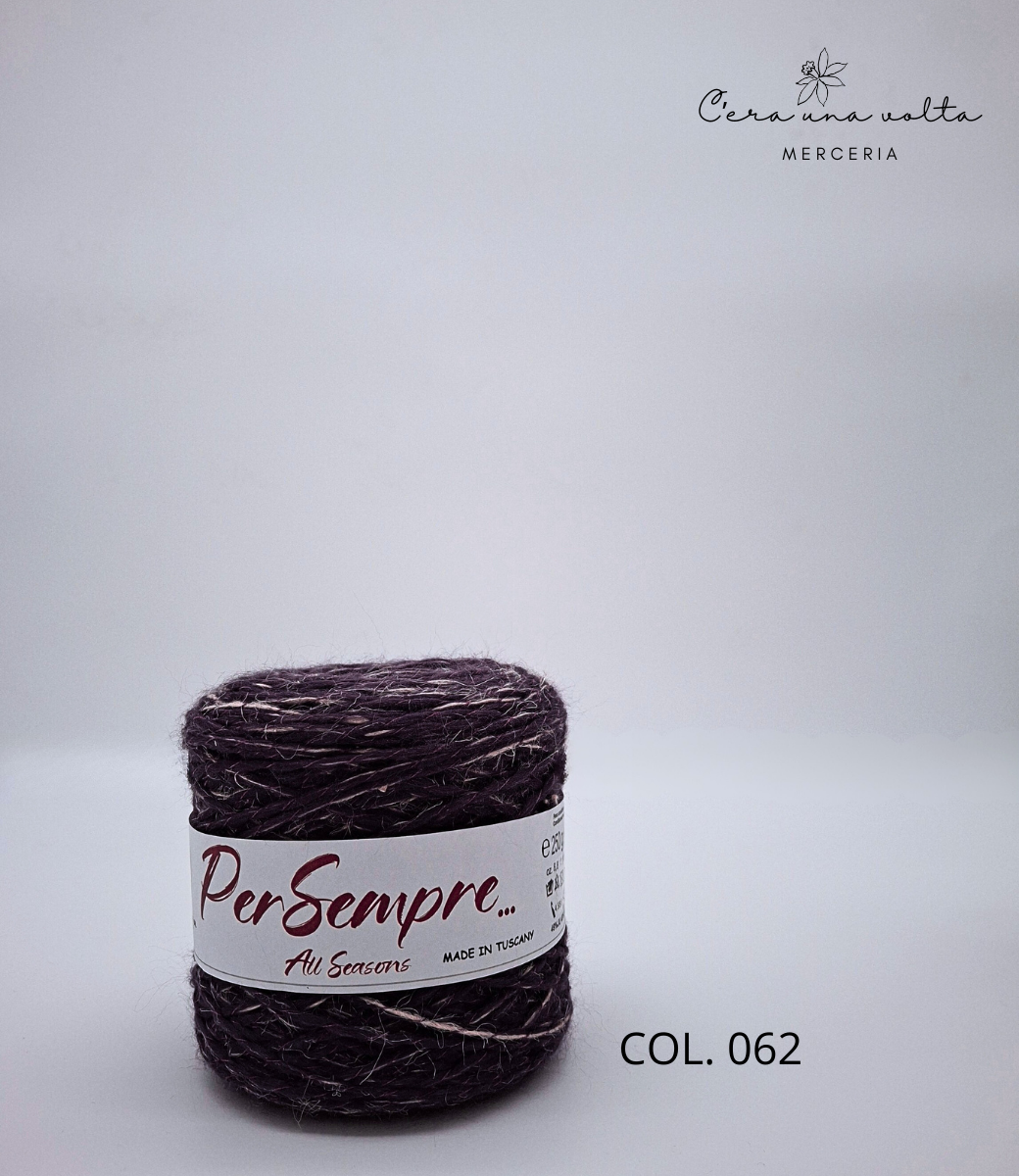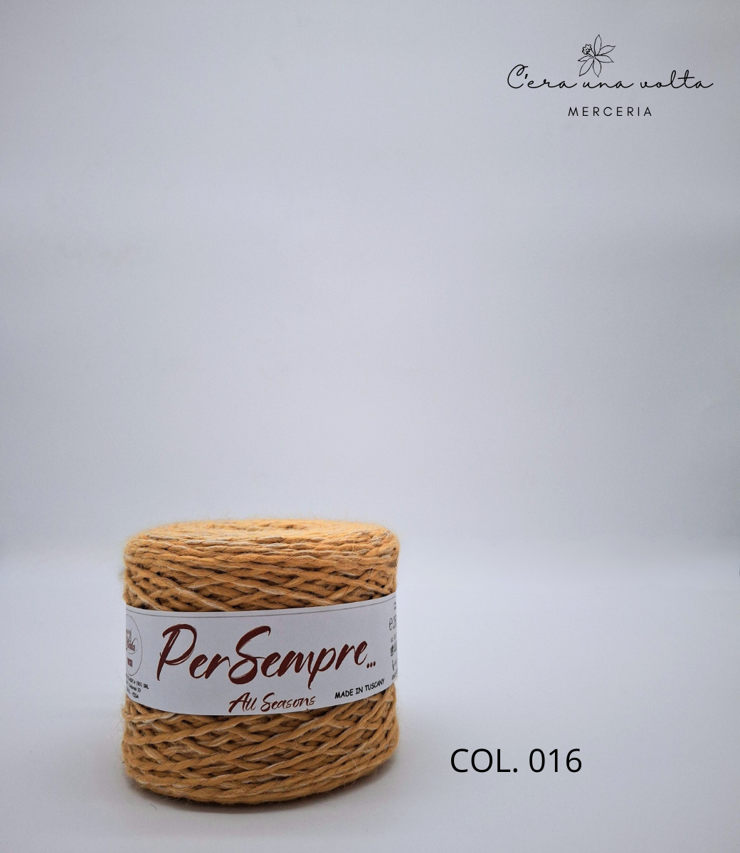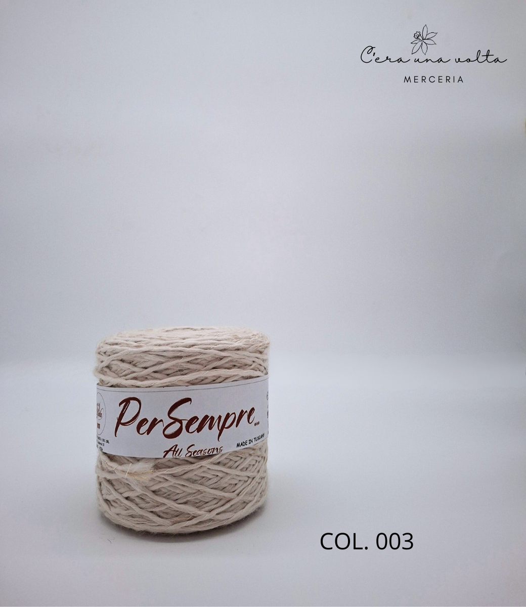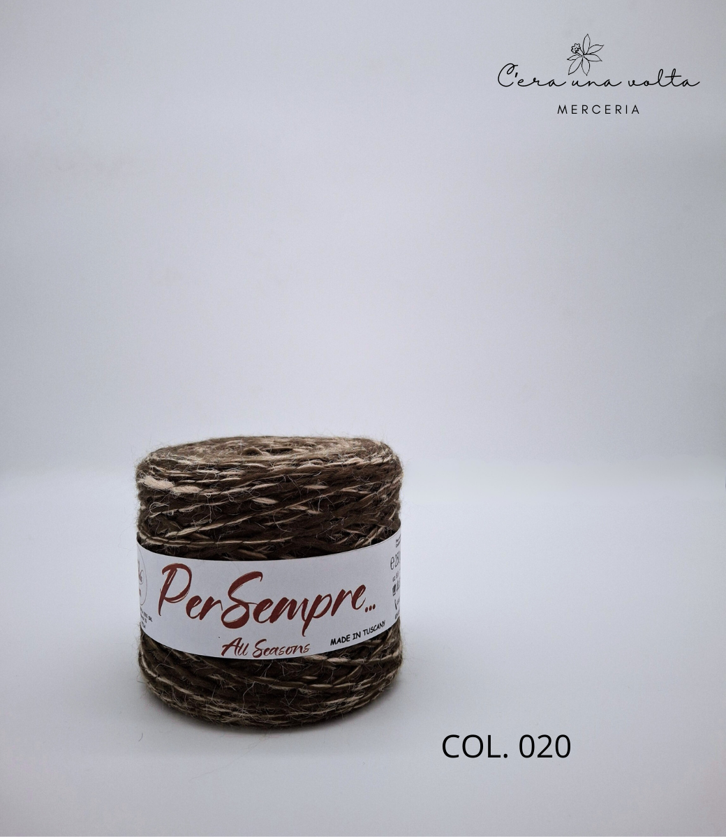 “Per Sempre” è un filato originale che unisce tradizione e innovazione, nato in Toscana dove la cultura del filato incontra la ricerca sui materiali. La sua particolare composizione combina la resistenza della juta con la morbidezza dell’acrilico, creando un filato versatile, naturale al tatto e piacevole da lavorare.