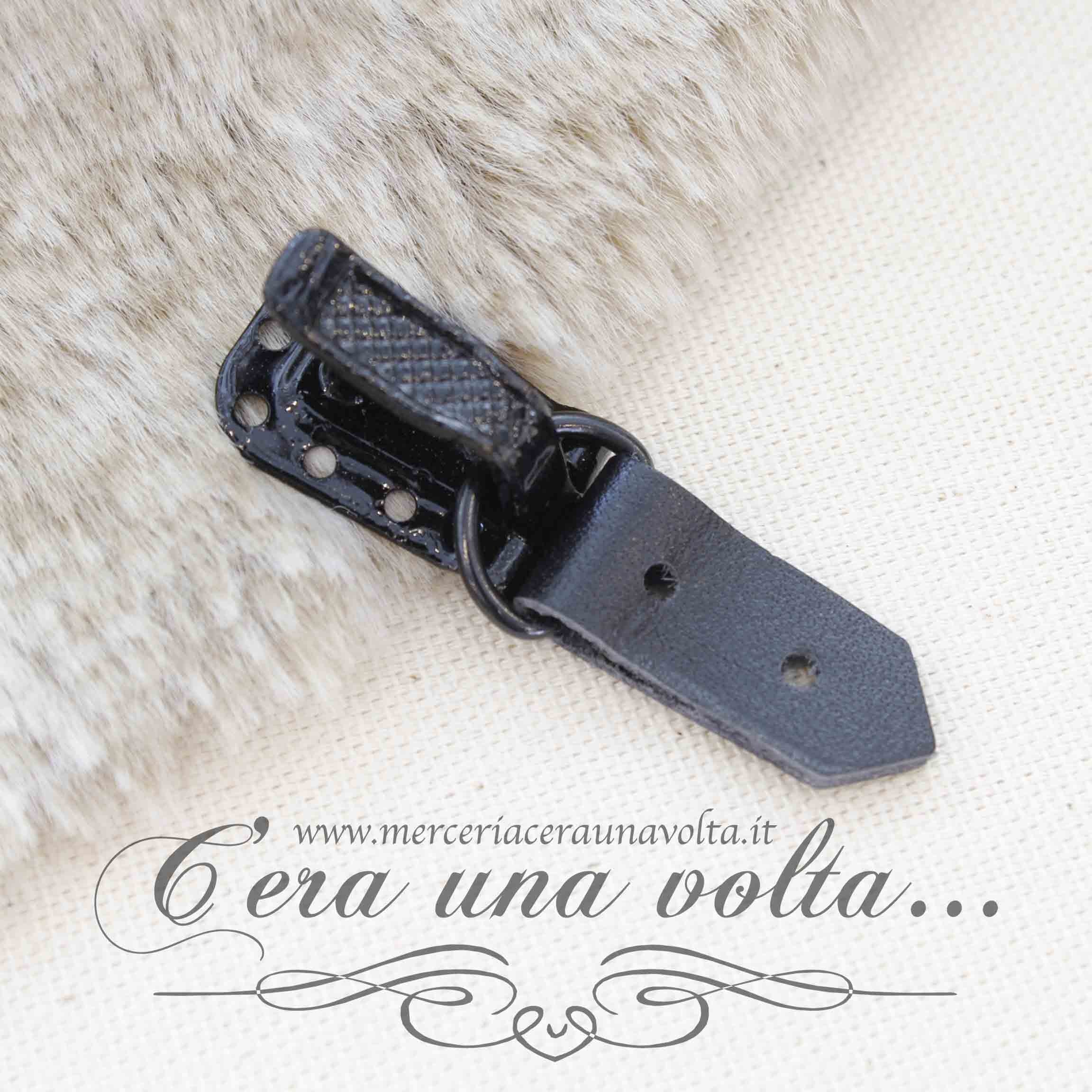 Gancio per pelliccia con clips composto da 2 elementi: gancio a scatto con molla integrata e controparte in cuoioColore NeroMateriale metallo...