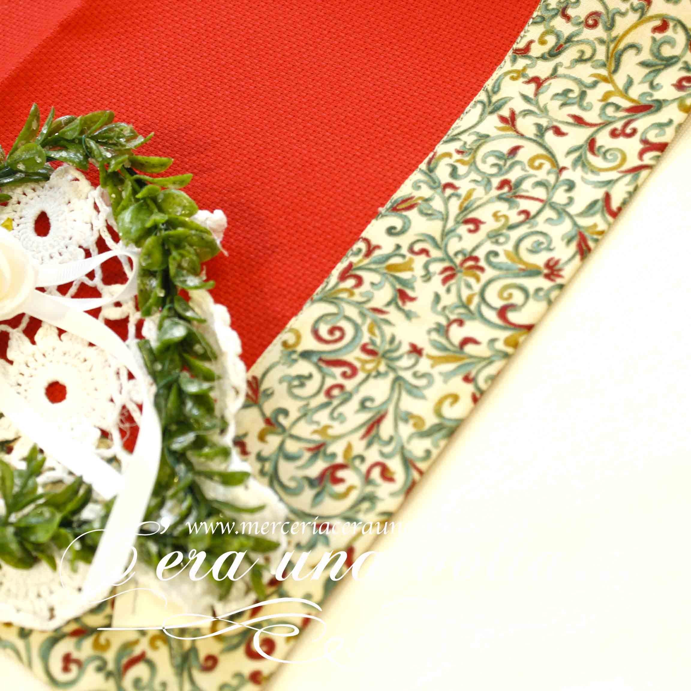 Lista rettangolare Elegant, personalizzabile grazie all'inserto in tela aida rossa ricamabile. Il perimetro è impreziosito da un bordo stampato a tema natalizio, un elegante disegno vettoriale che dona un'allure magica e ricercata