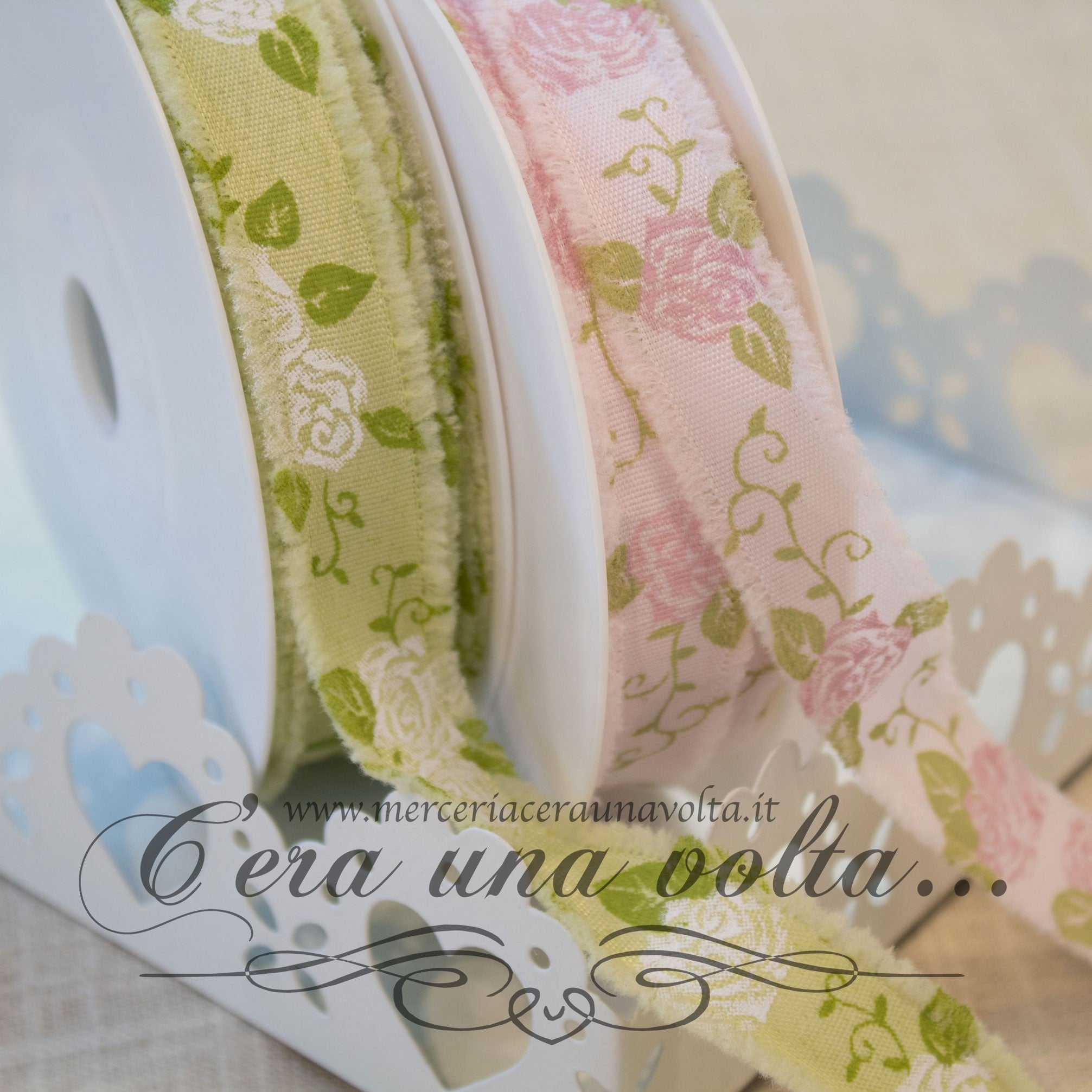 Delicate tinte pastello fanno da sfondo al fiore più amato del mondo, grazia e stile senza tempo si incontrano in questo nastro dall'aspetto vissuto, sfrangiato da entrambi i lati.