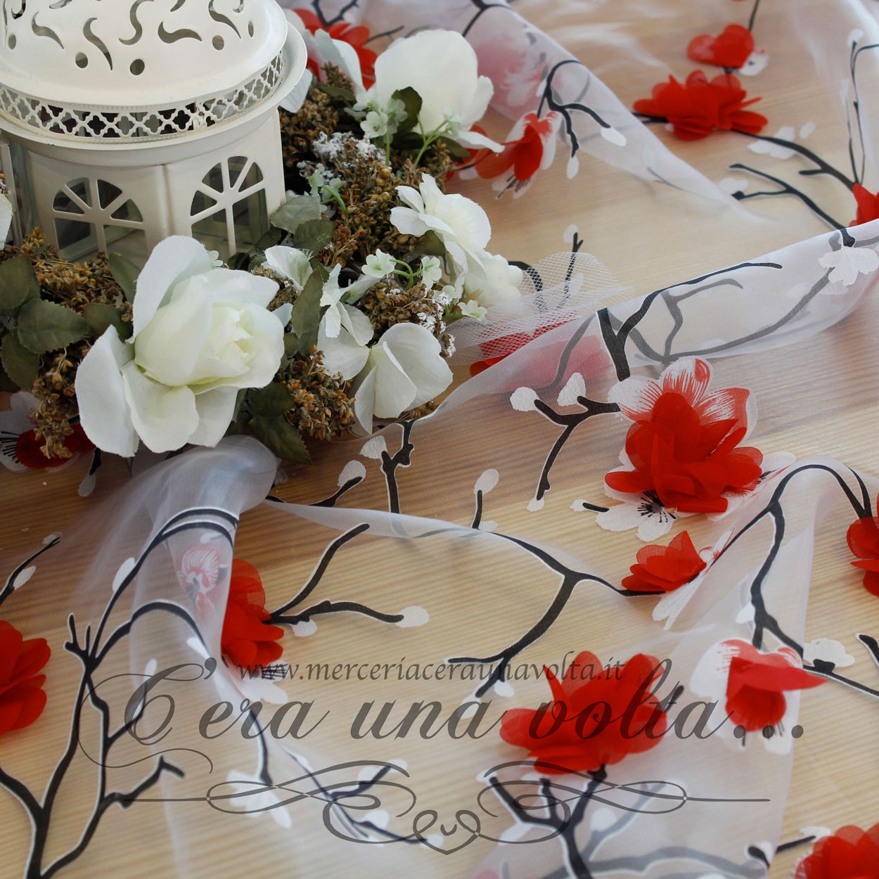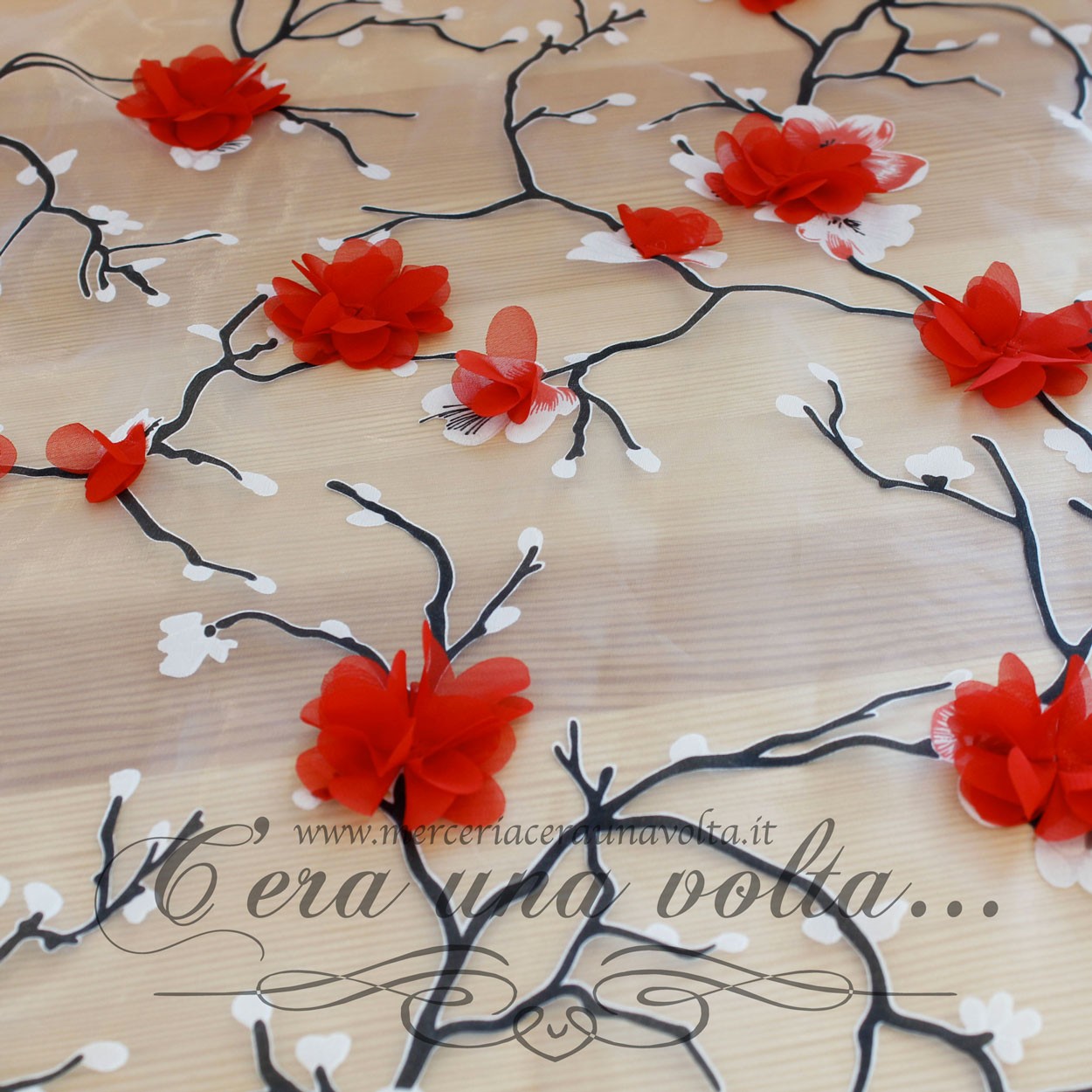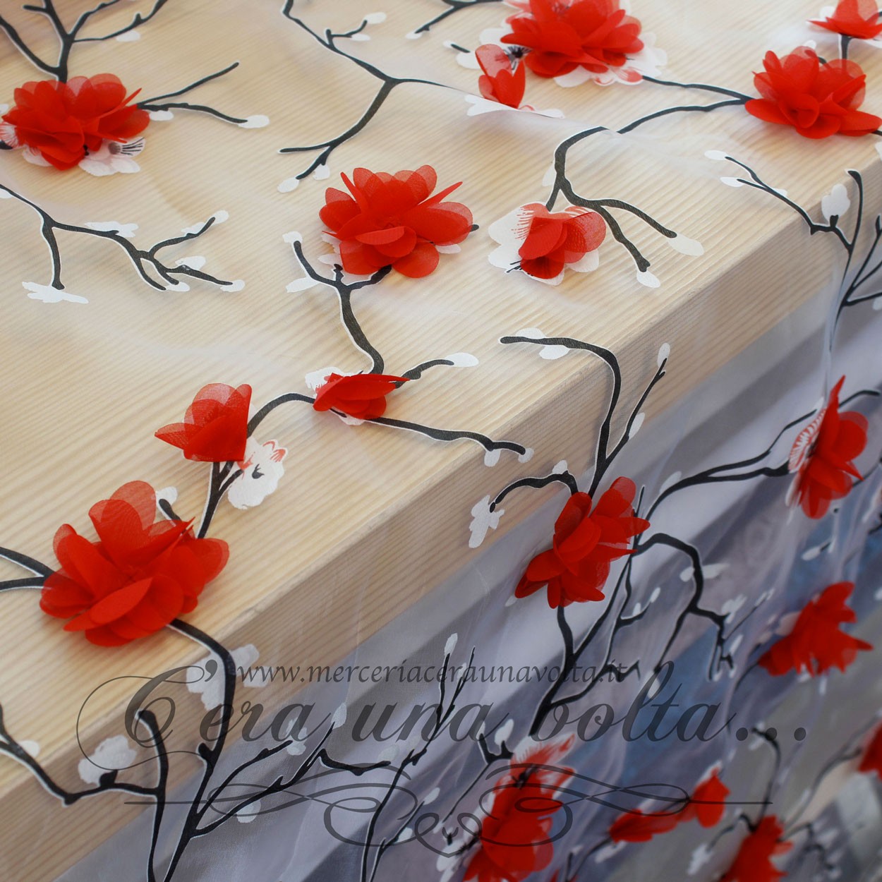 Tessuto in organza con stampa di fiori tridimensionali, sottile, trasparente, morbido e vaporoso, ispirato all'eleganza della natura, capace di evocare un'atmosfera incantata e sospesa nel tempo, perfetto per abiti da cerimonia, abiti da sposa, camicette.