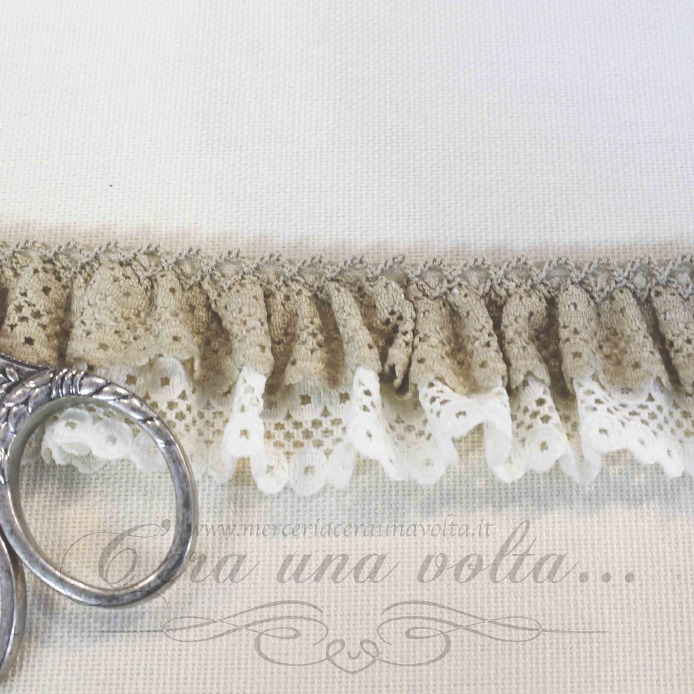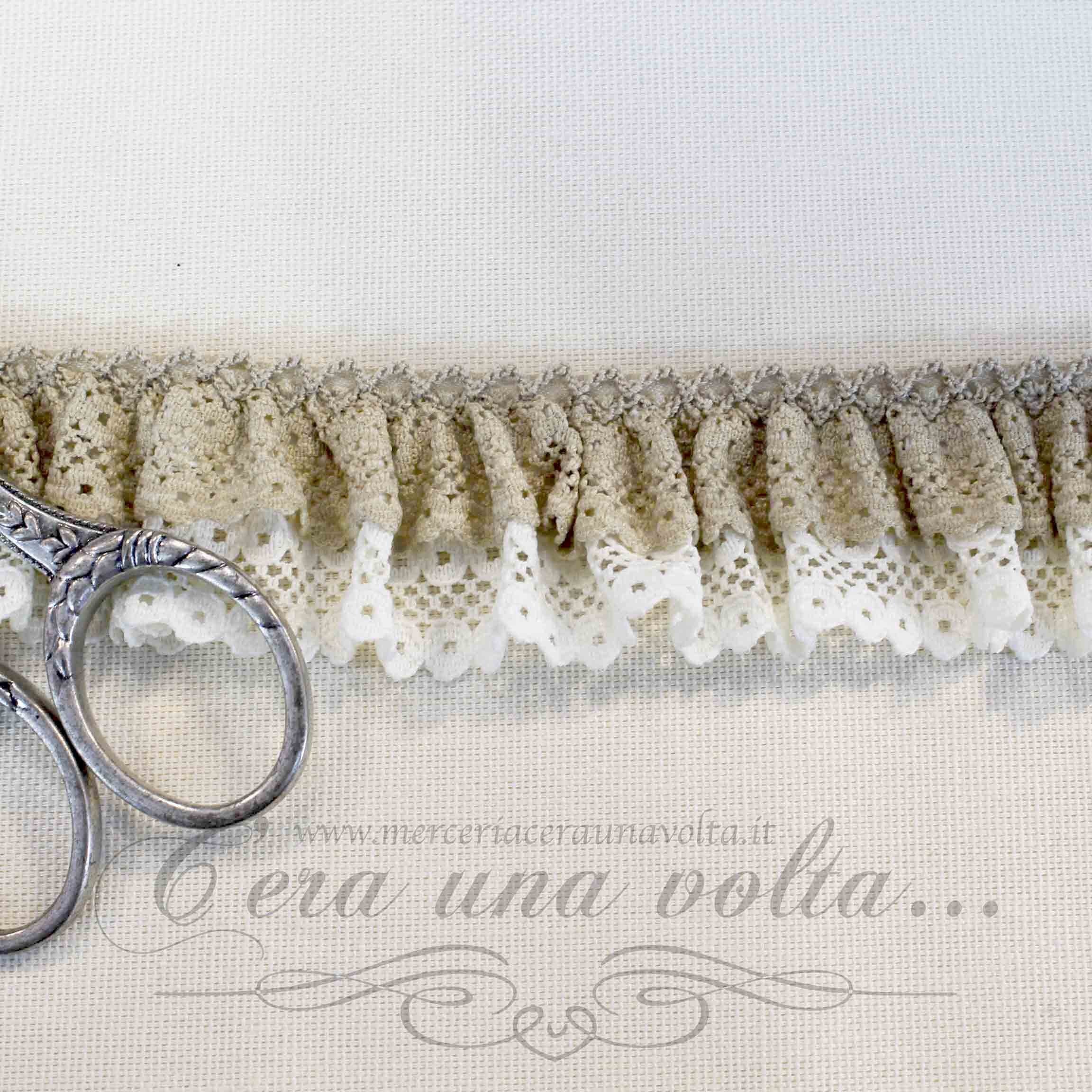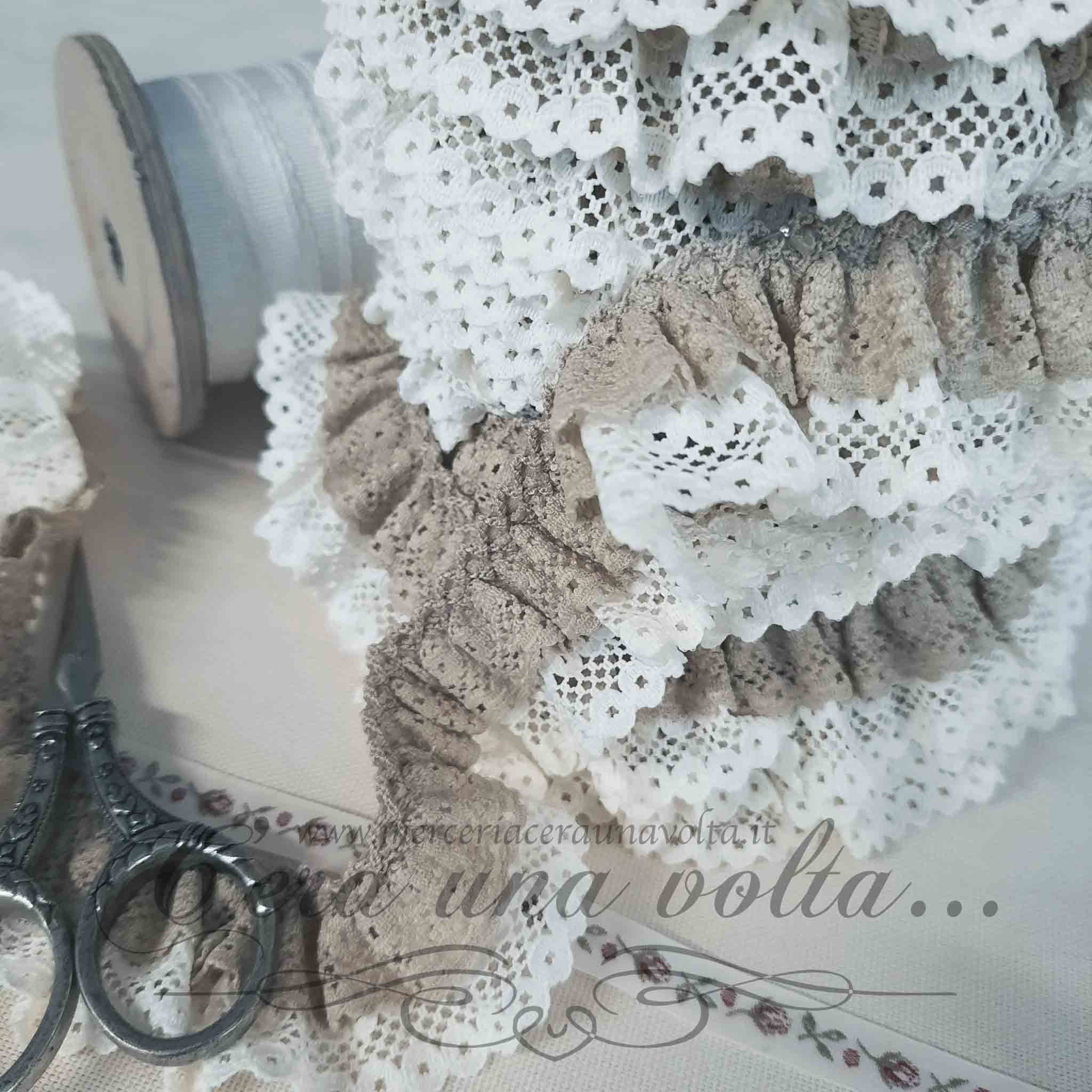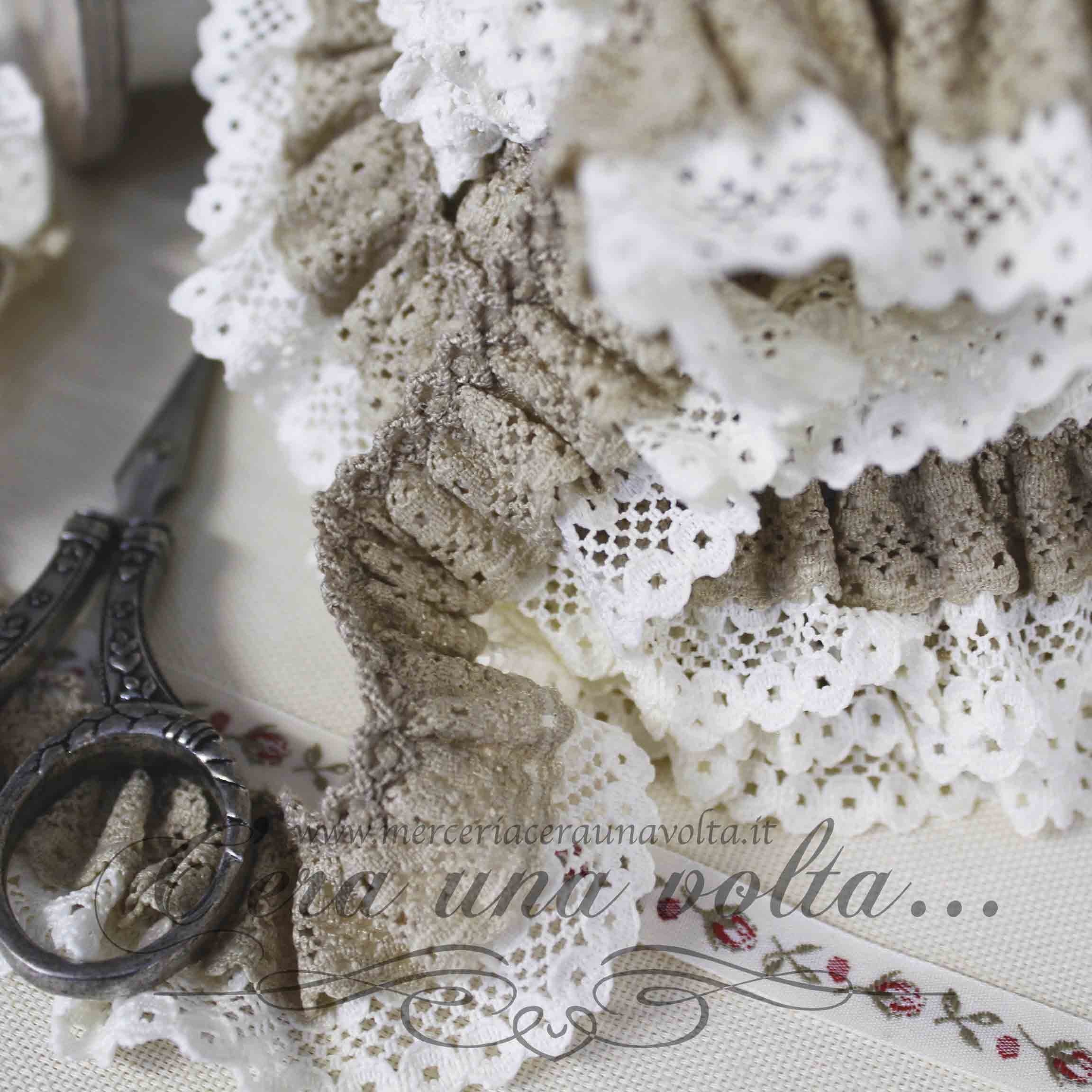 Pizzo colorato doppio, già arricciato e cucito su fettuccia comoda da applicare, un mix di candore e poesia che regala una patina romantica ricca di charme ai tuoi progetti