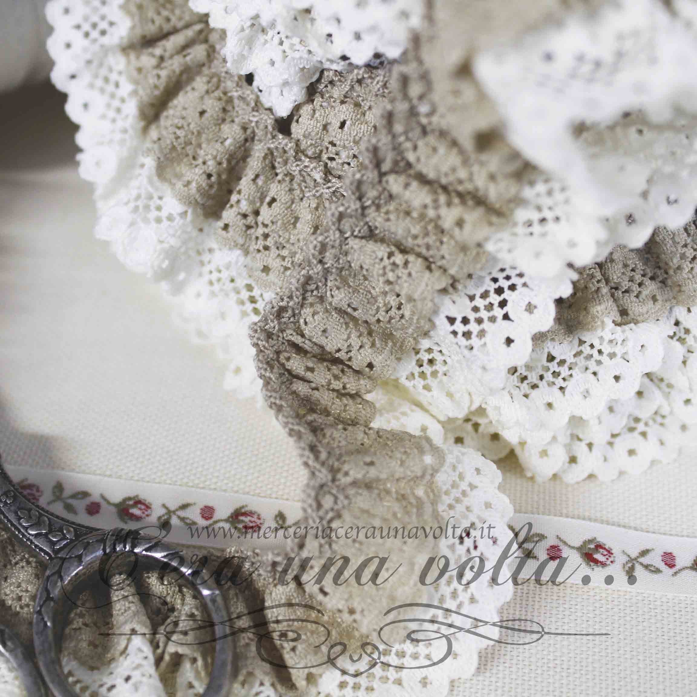 Pizzo colorato doppio, già arricciato e cucito su fettuccia comoda da applicare, un mix di candore e poesia che regala...