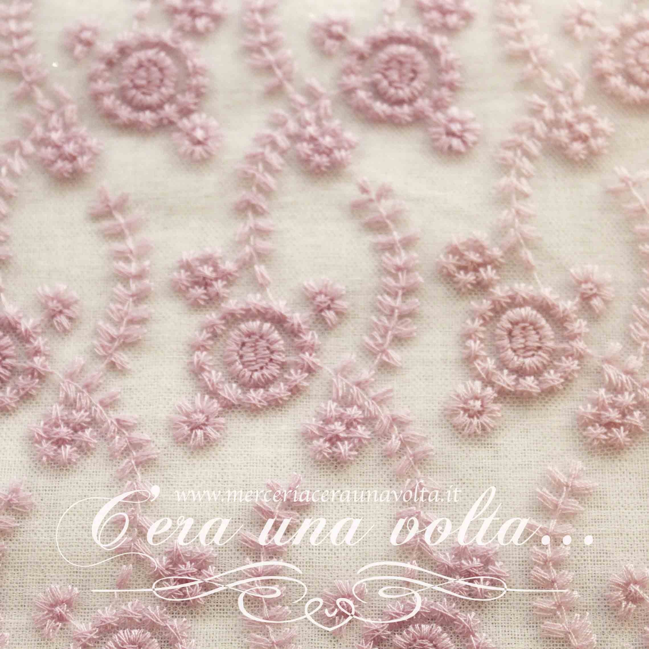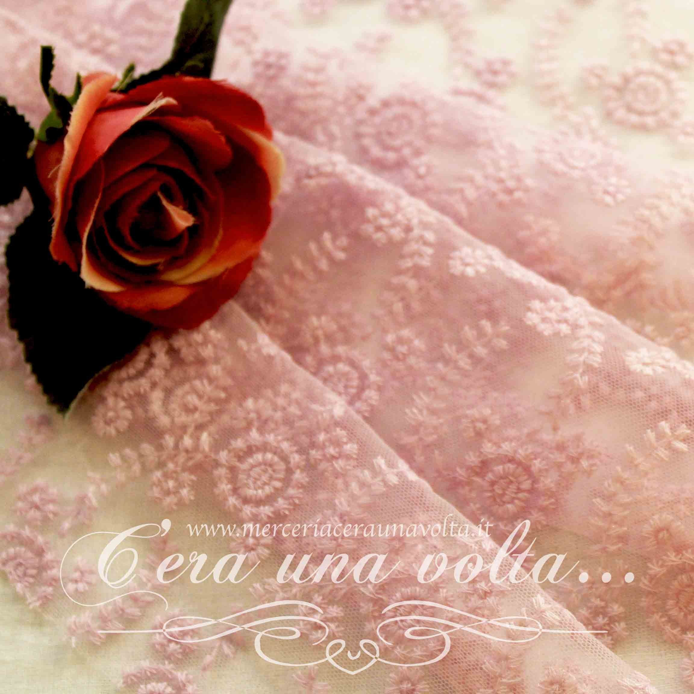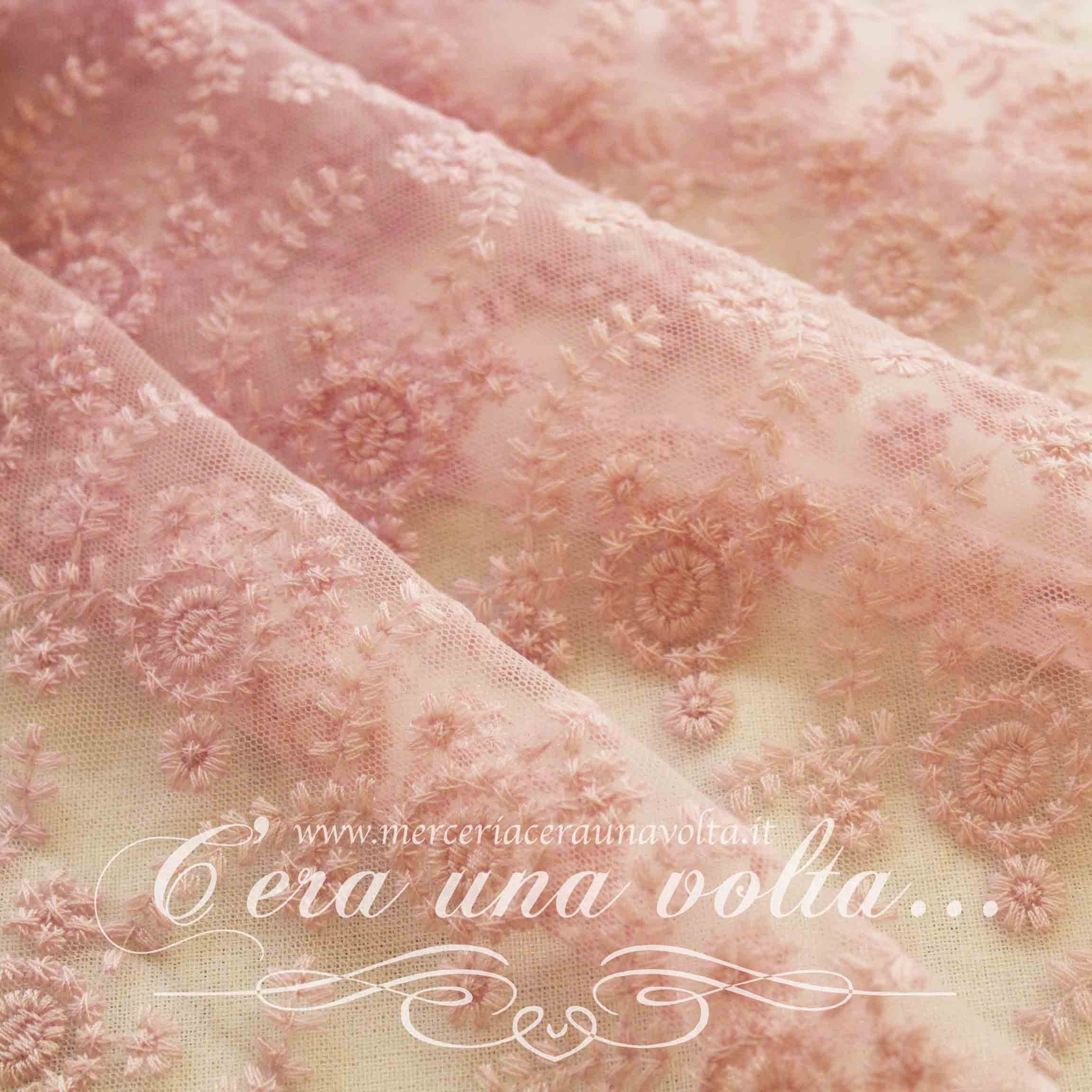 Un delicato ricamo su una base in tulle crea raffinati motivi floreali, un design romantico ed evocativo, dal fascino antico e provenzale.