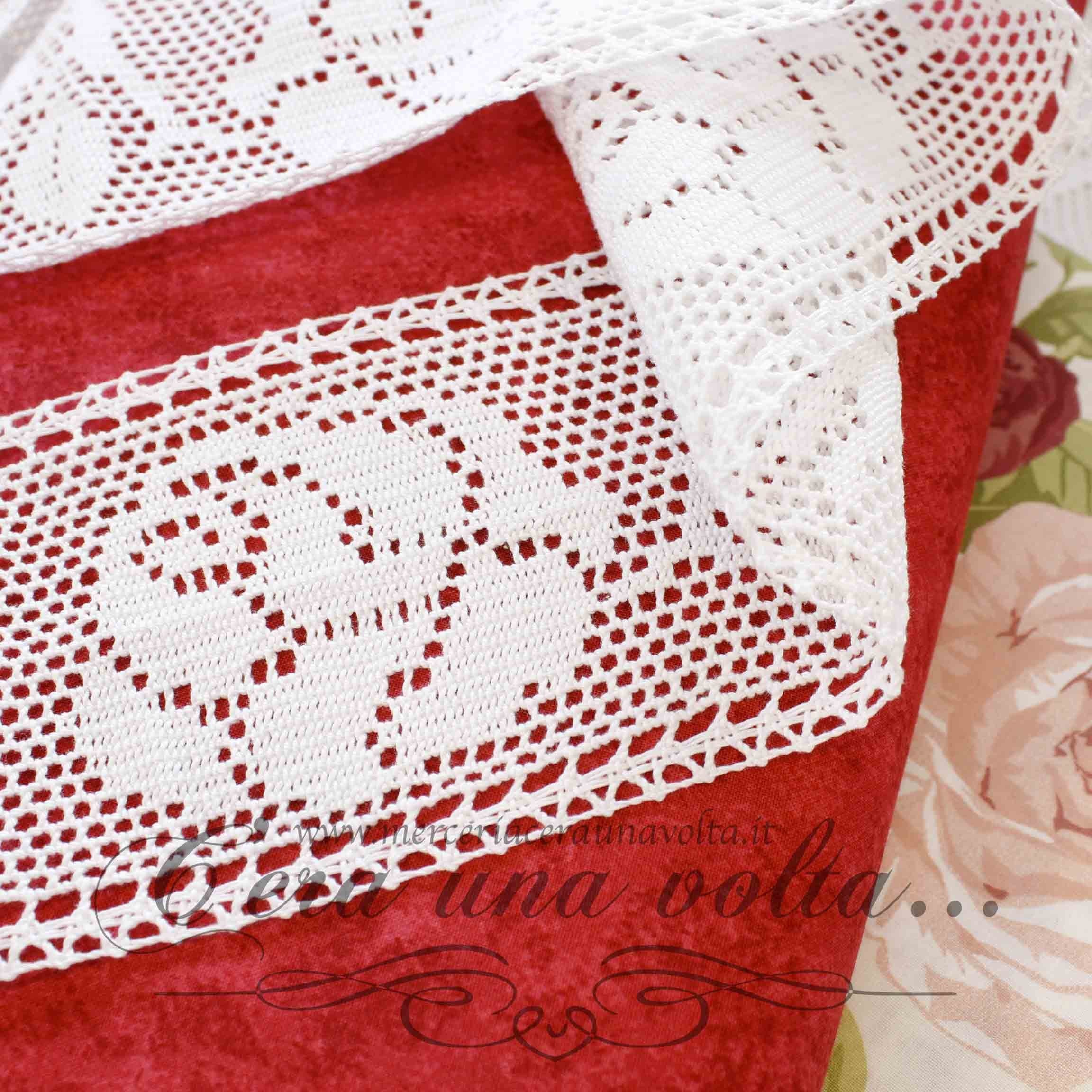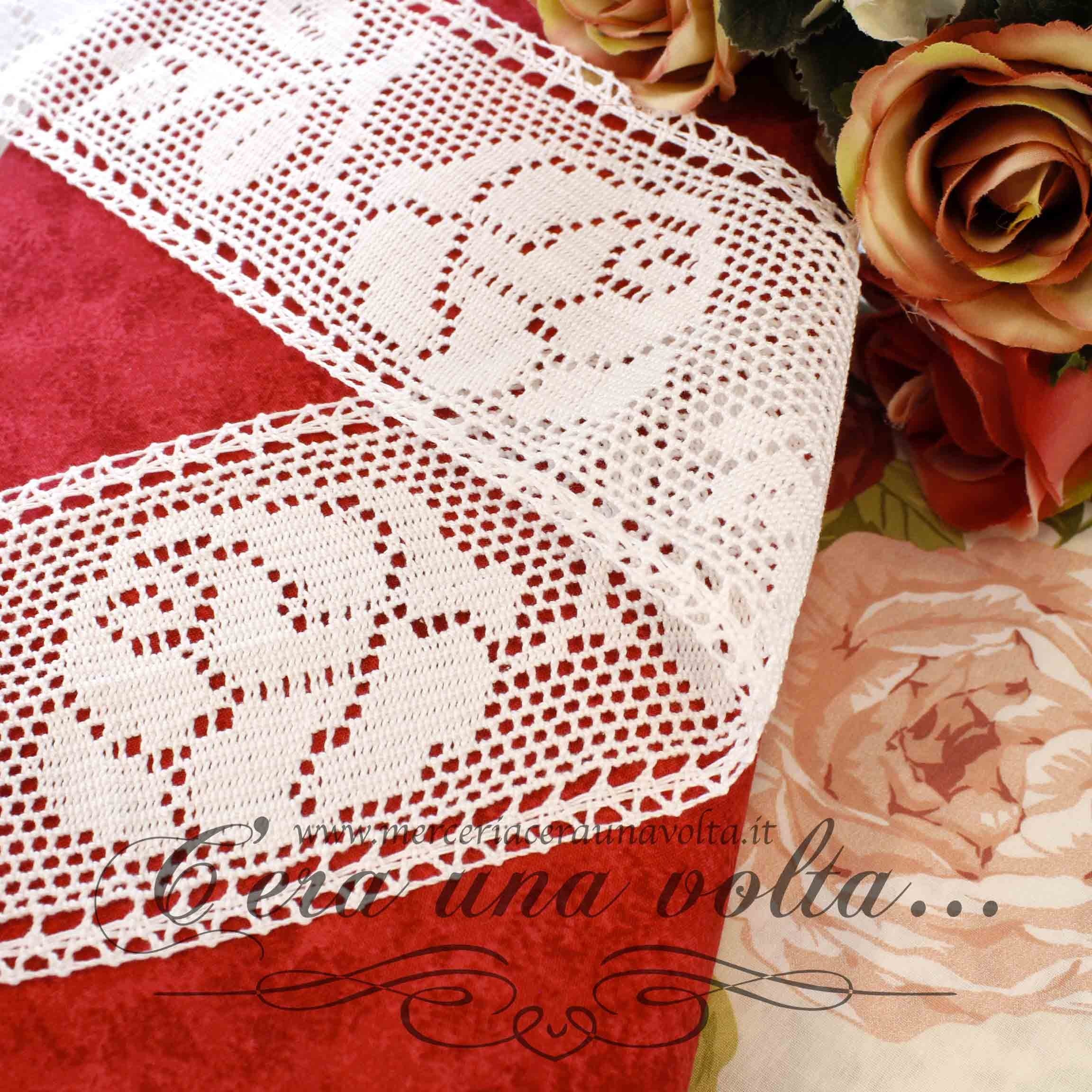 Pizzo dalla caratteristica quadrettatura a rete meglio conosciuta come filet, ricami a punto tela danno vita a questa meravigliosa rosa, rifinita da entrambi i lati. Un pizzo romantico ed evocativo dal fascino antico.
