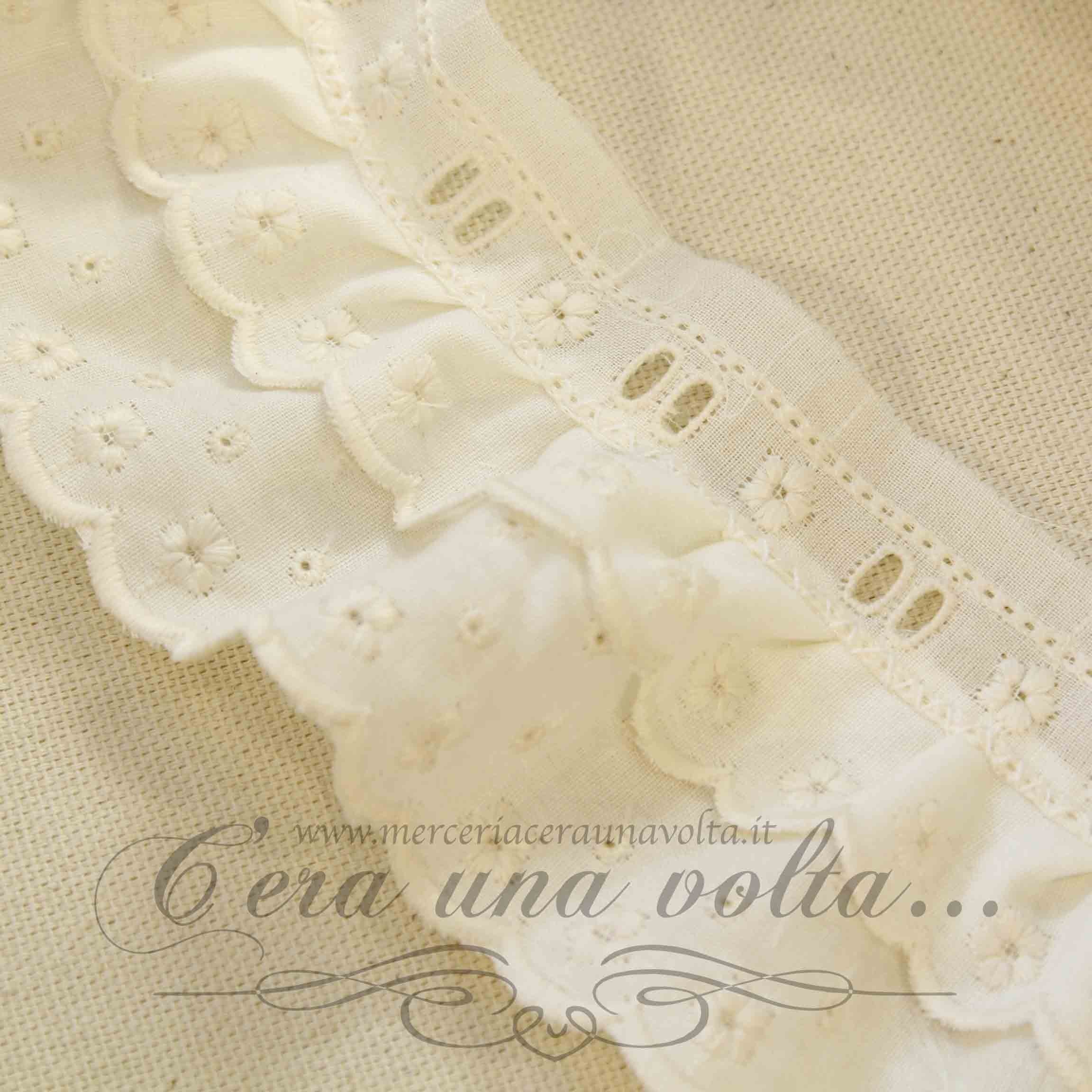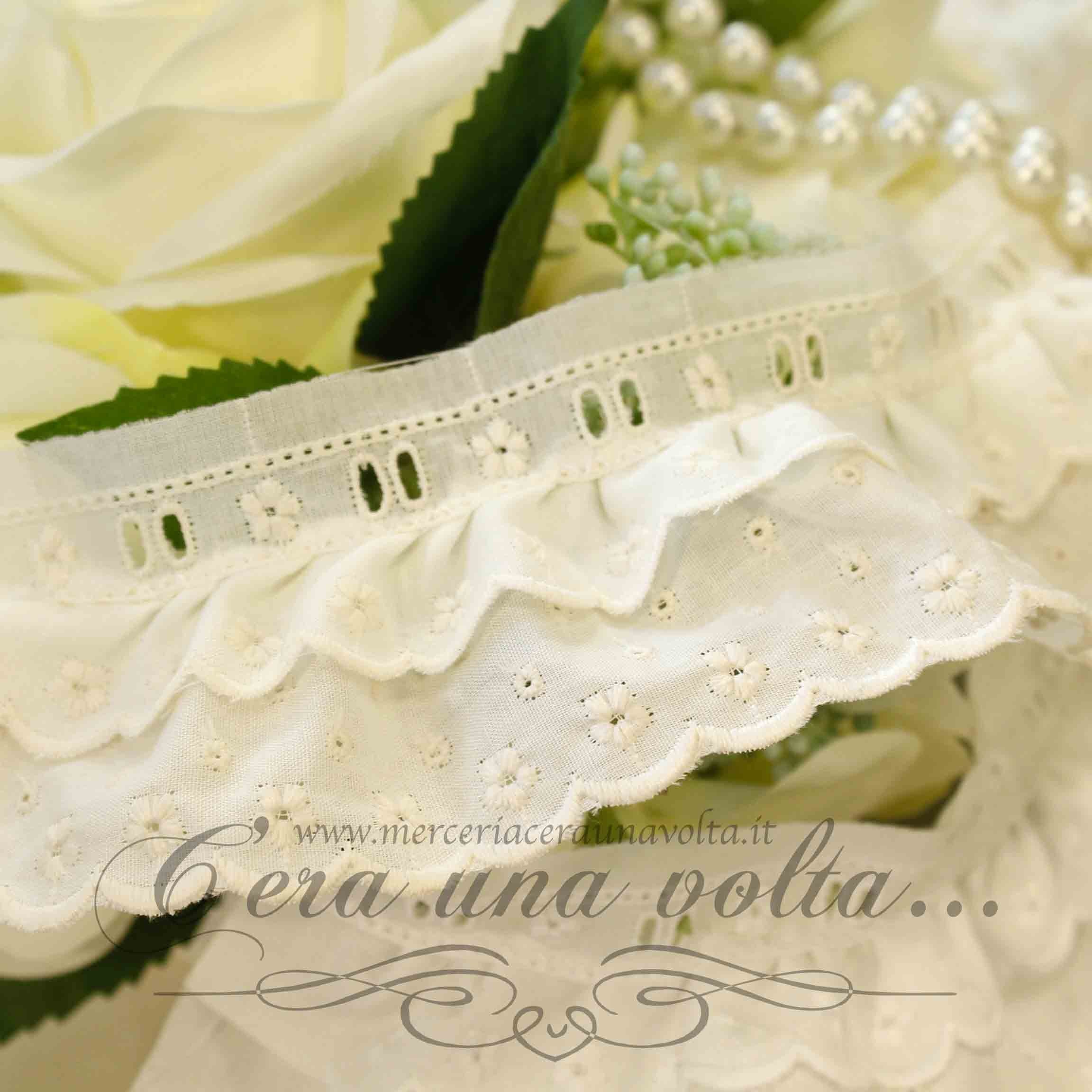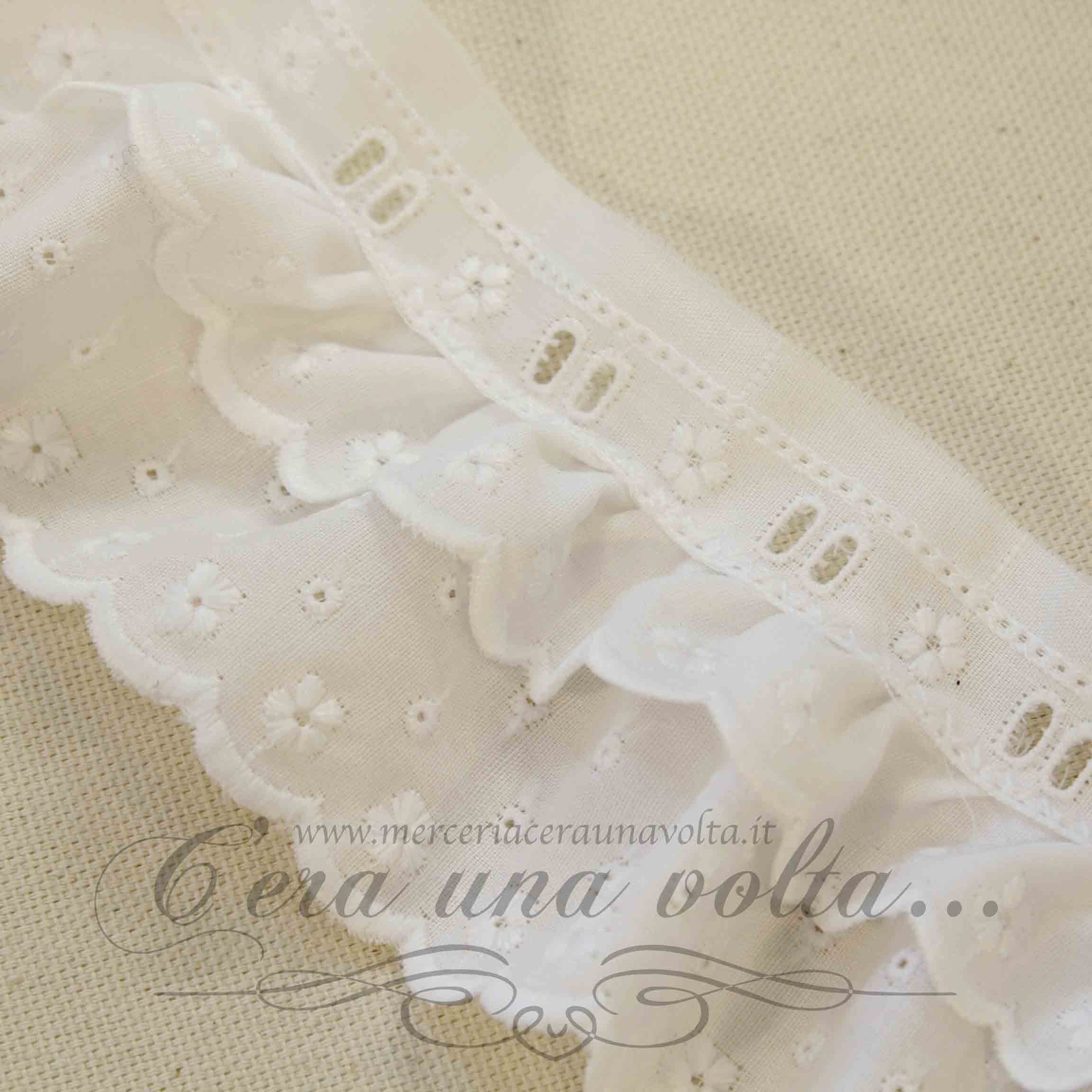 Pizzo Sangallo con passanastro e doppia rouches, ricamo traforato a rilievo, fondo eseguito con punto festone a smerlo, fiori a...