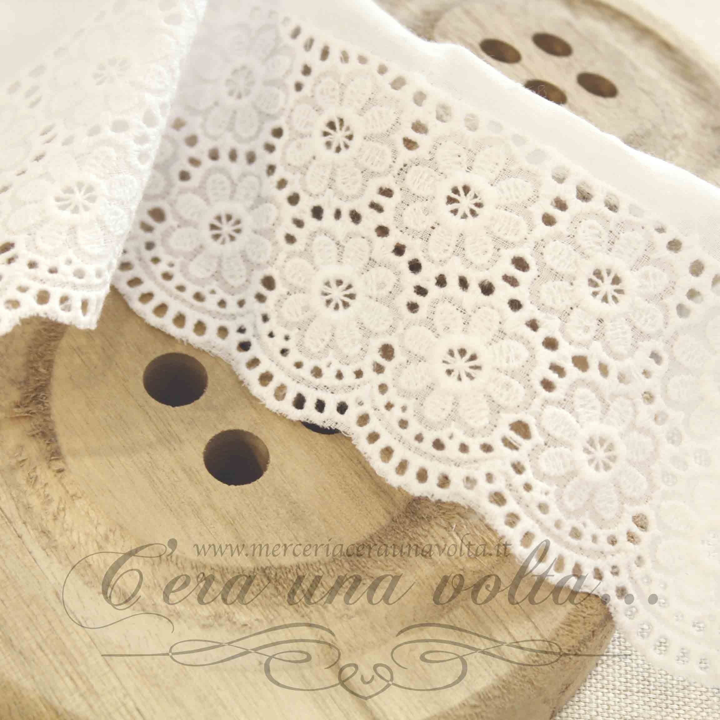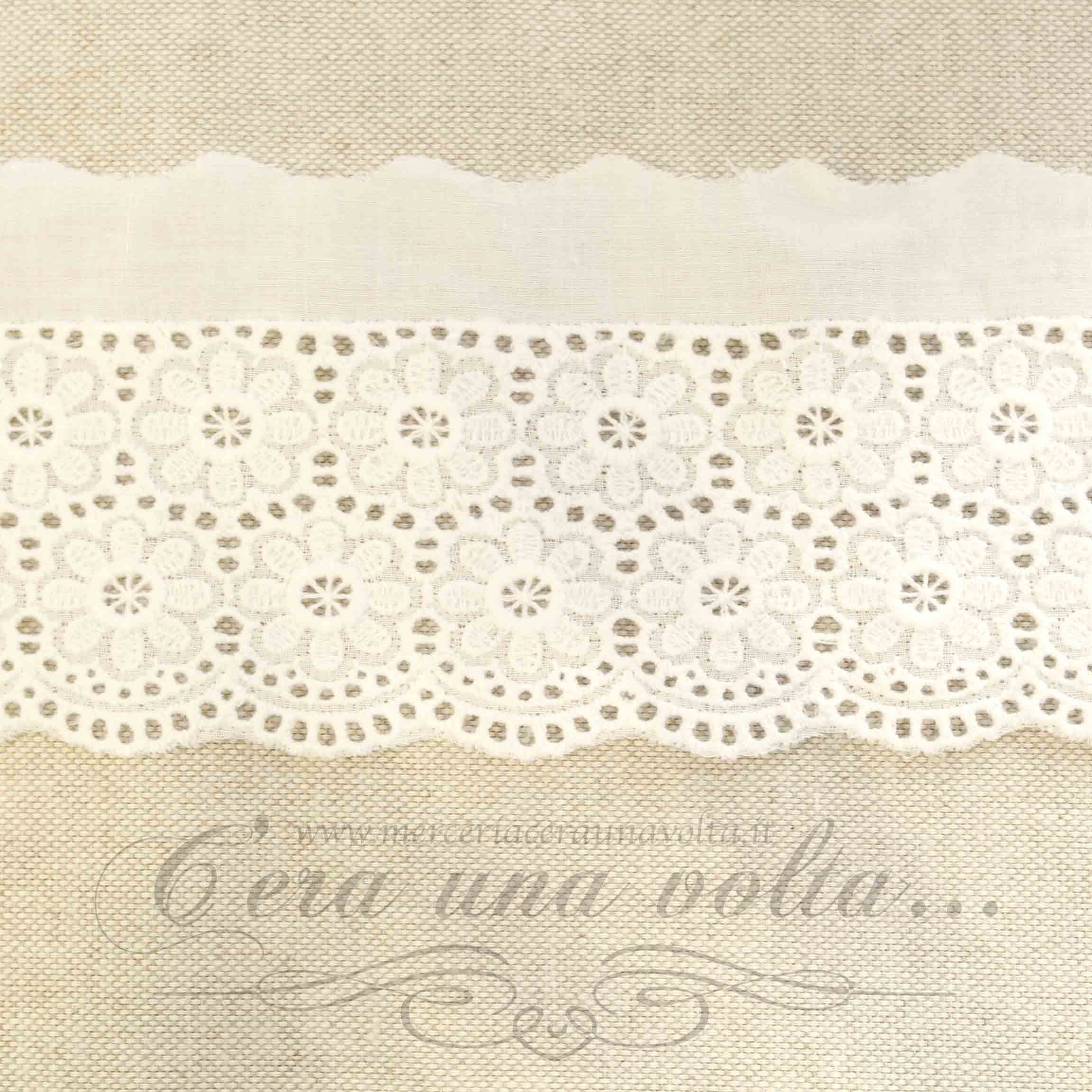 Pizzo Sangallo, su tela di cotone e ricamo traforato a rilievo, fondo smerlato, fiori a punto cordoncino e punto inglese,...