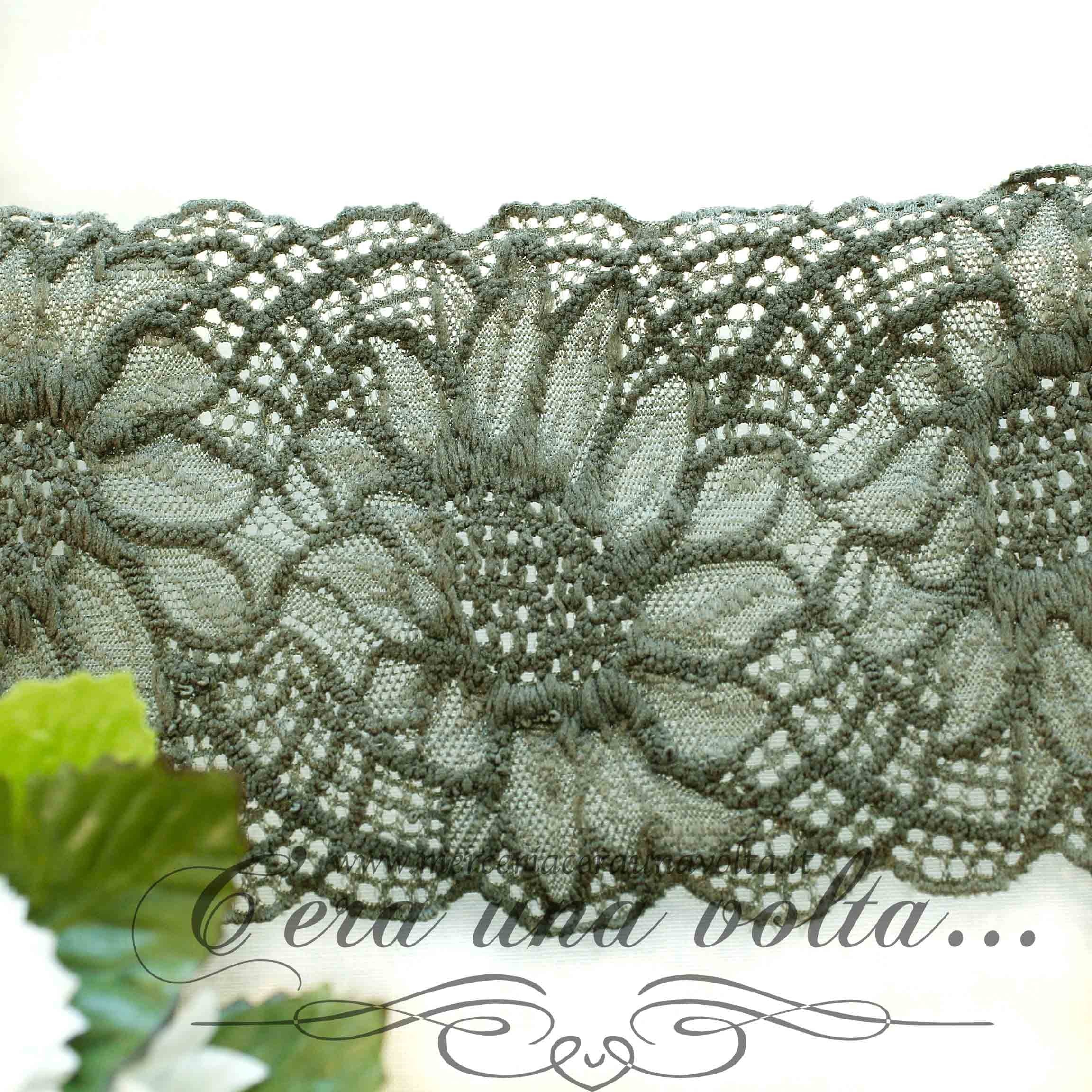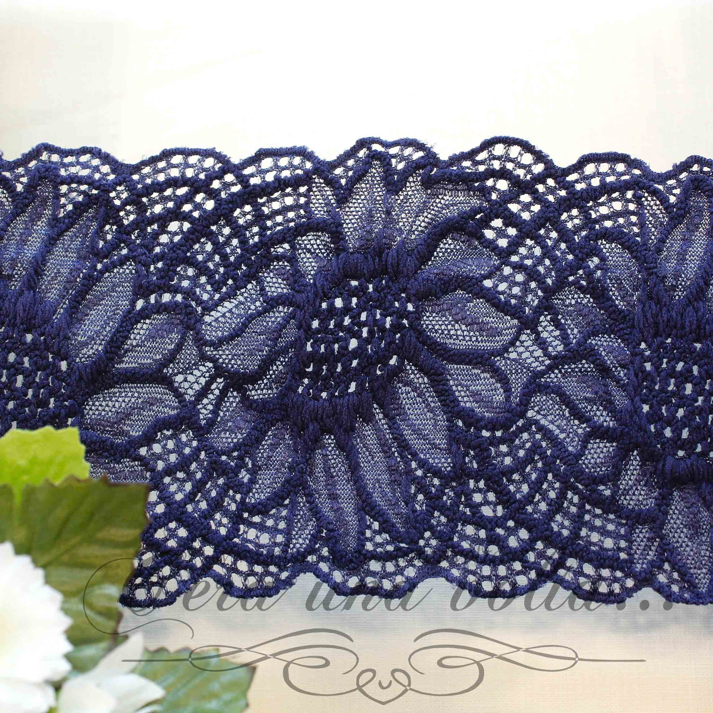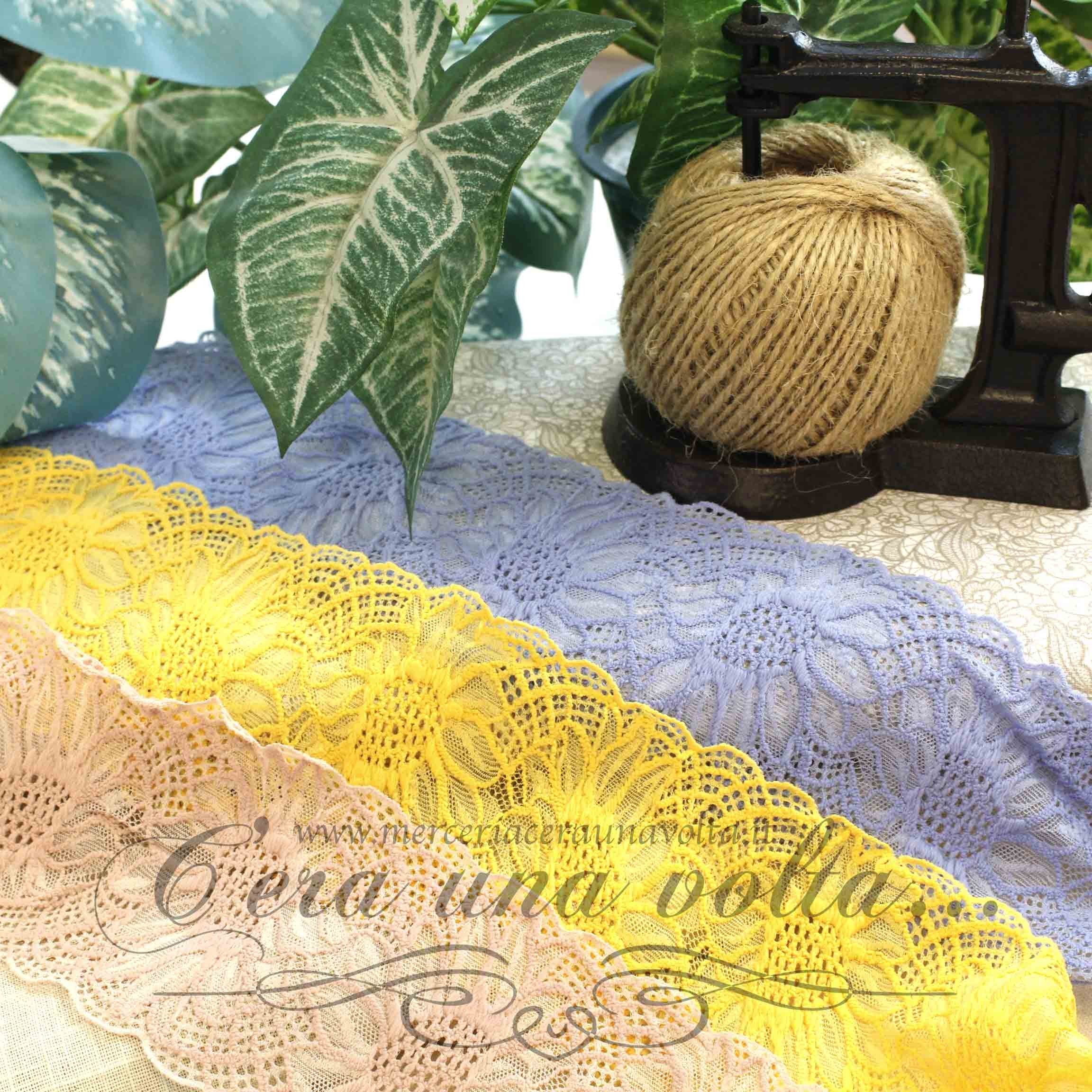 Pizzo tramezzo Sunflowers elasticizzato con base in tulle, ispirato all'eleganza della natura, motivi floreali, venature delicate, linee curve morbide. Smerlato da entrambi i lati. Disponibile in 7 varianti