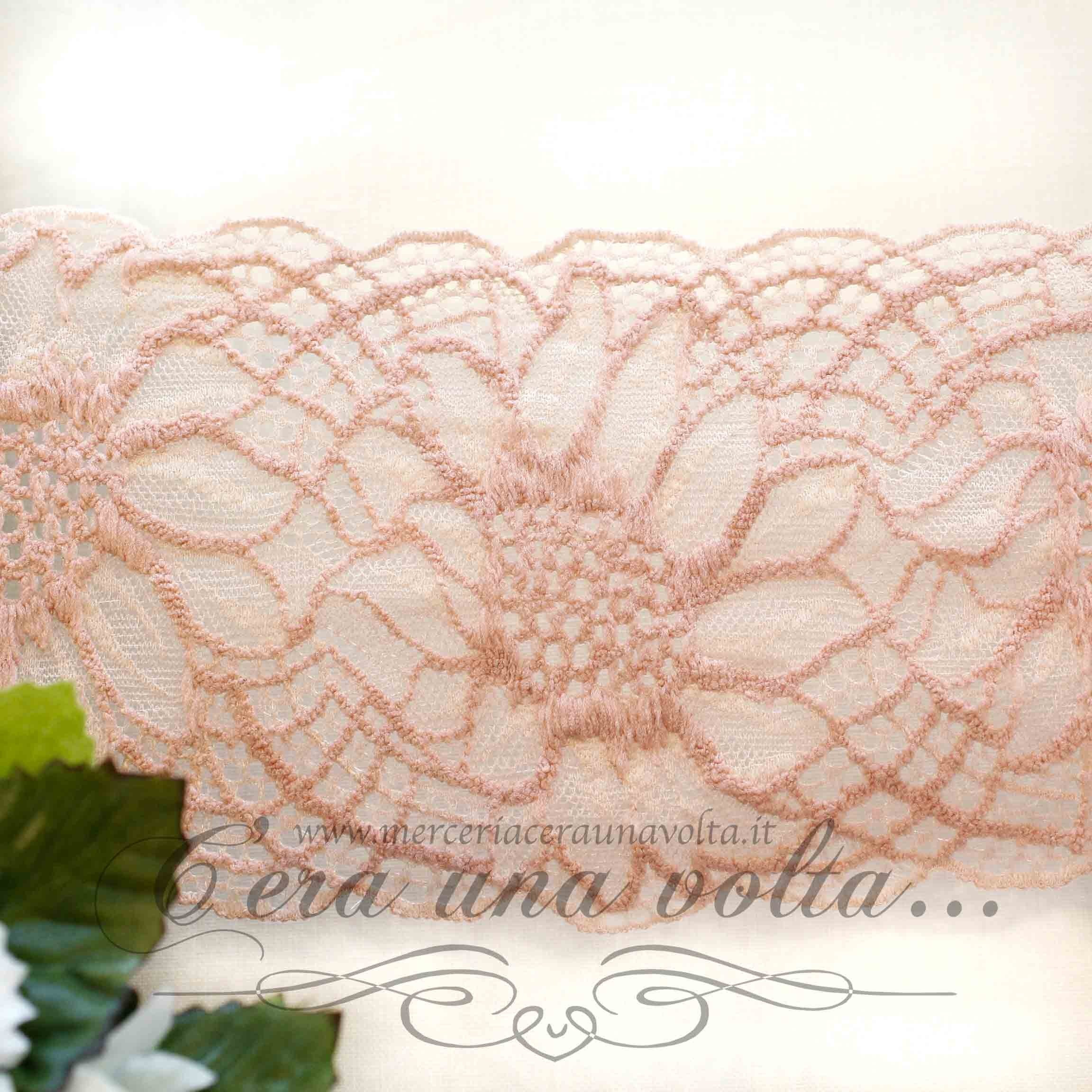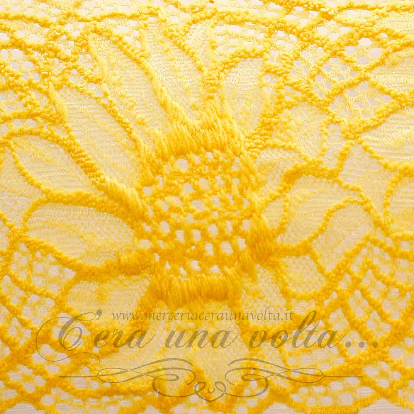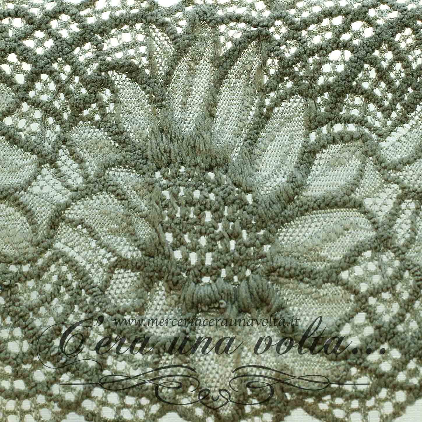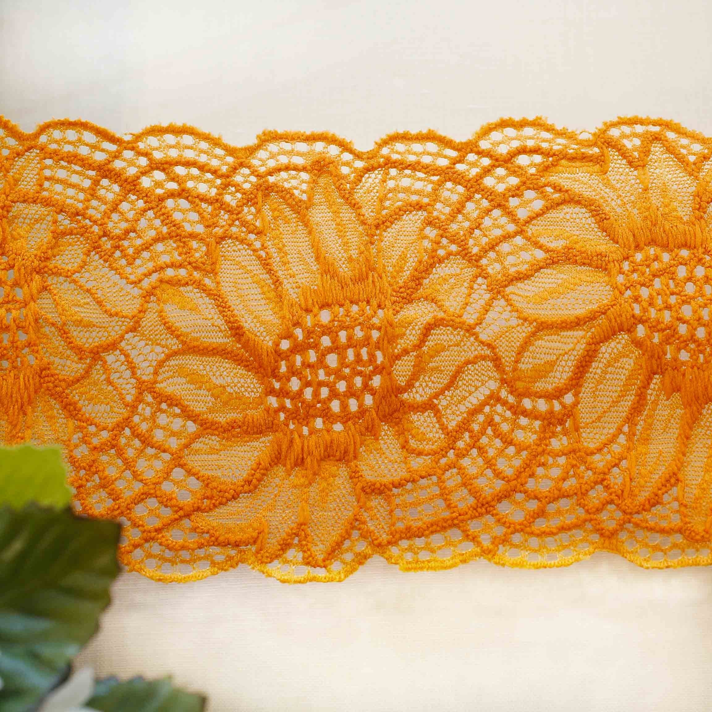Pizzo tramezzo Sunflowers elasticizzato con base in tulle, ispirato all'eleganza della natura, motivi floreali, venature delicate, linee curve morbide. Smerlato...