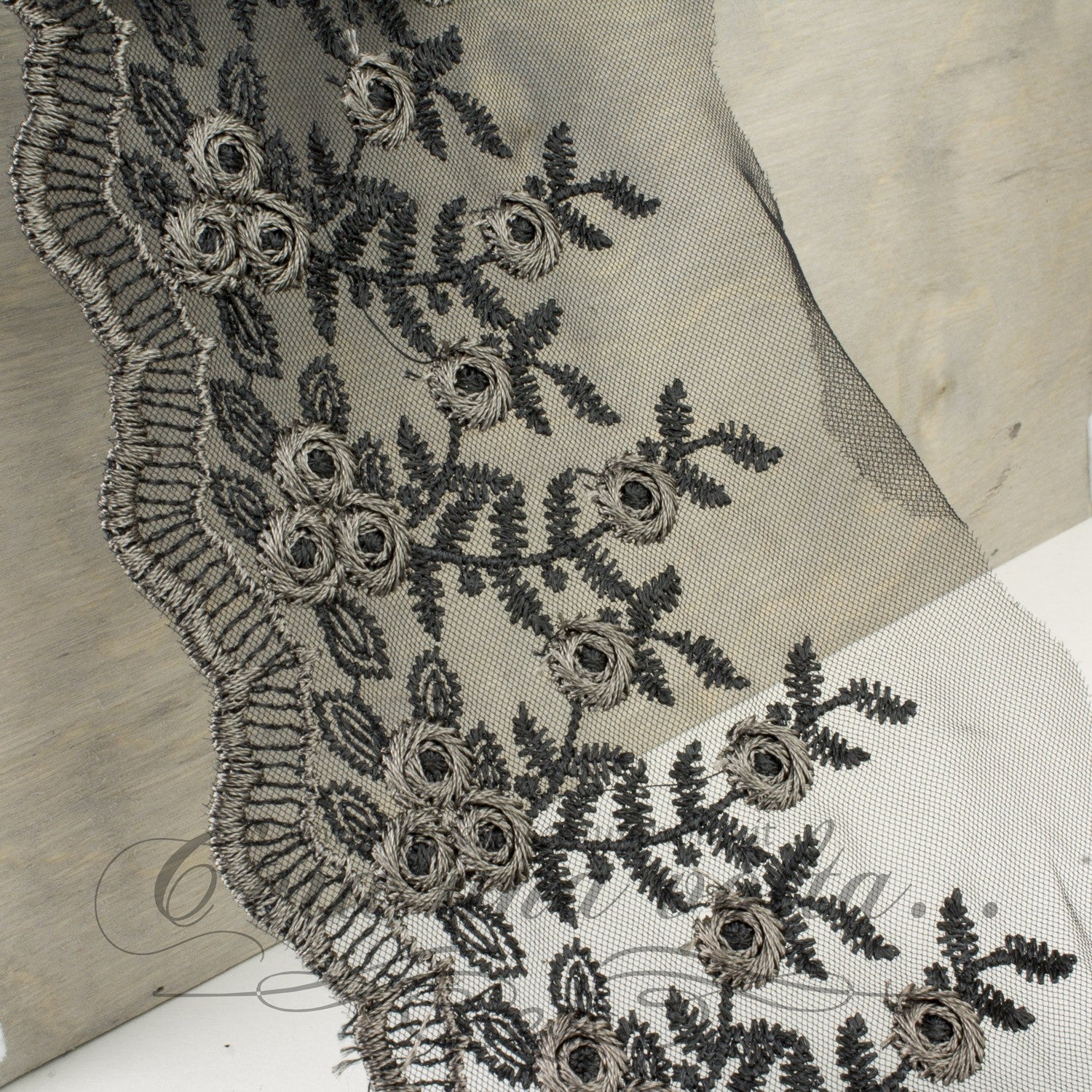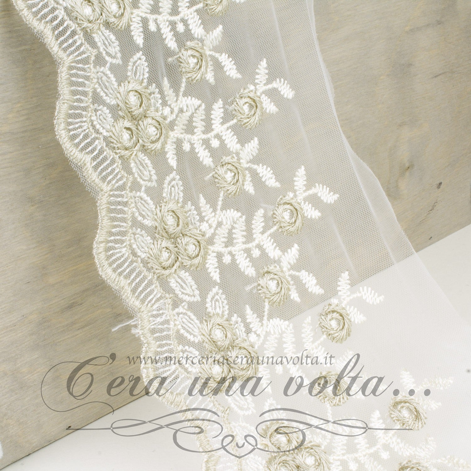 Il pizzo Valenciennes é particolarmente privilegiato in quanto è leggero e ha un aspetto velato, e ricorda il tulle, ma senza la sua ruvidità. Questo modello presenta un ricamo con filo di seta in contrasto con la sua tramatura