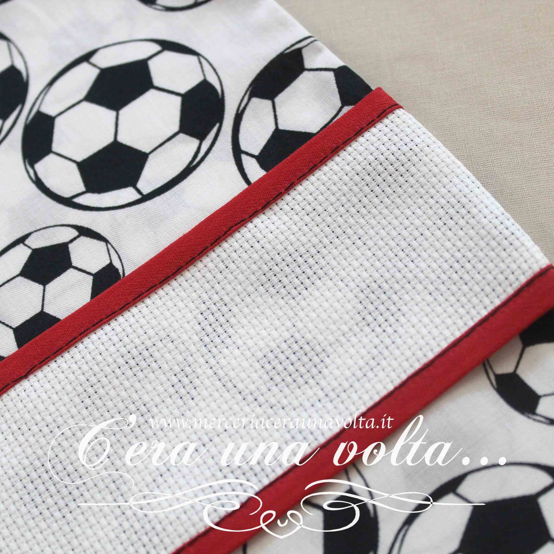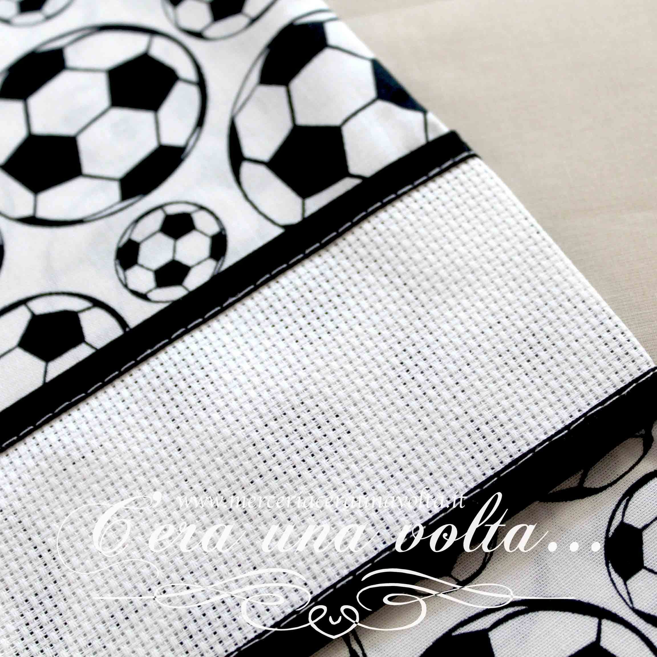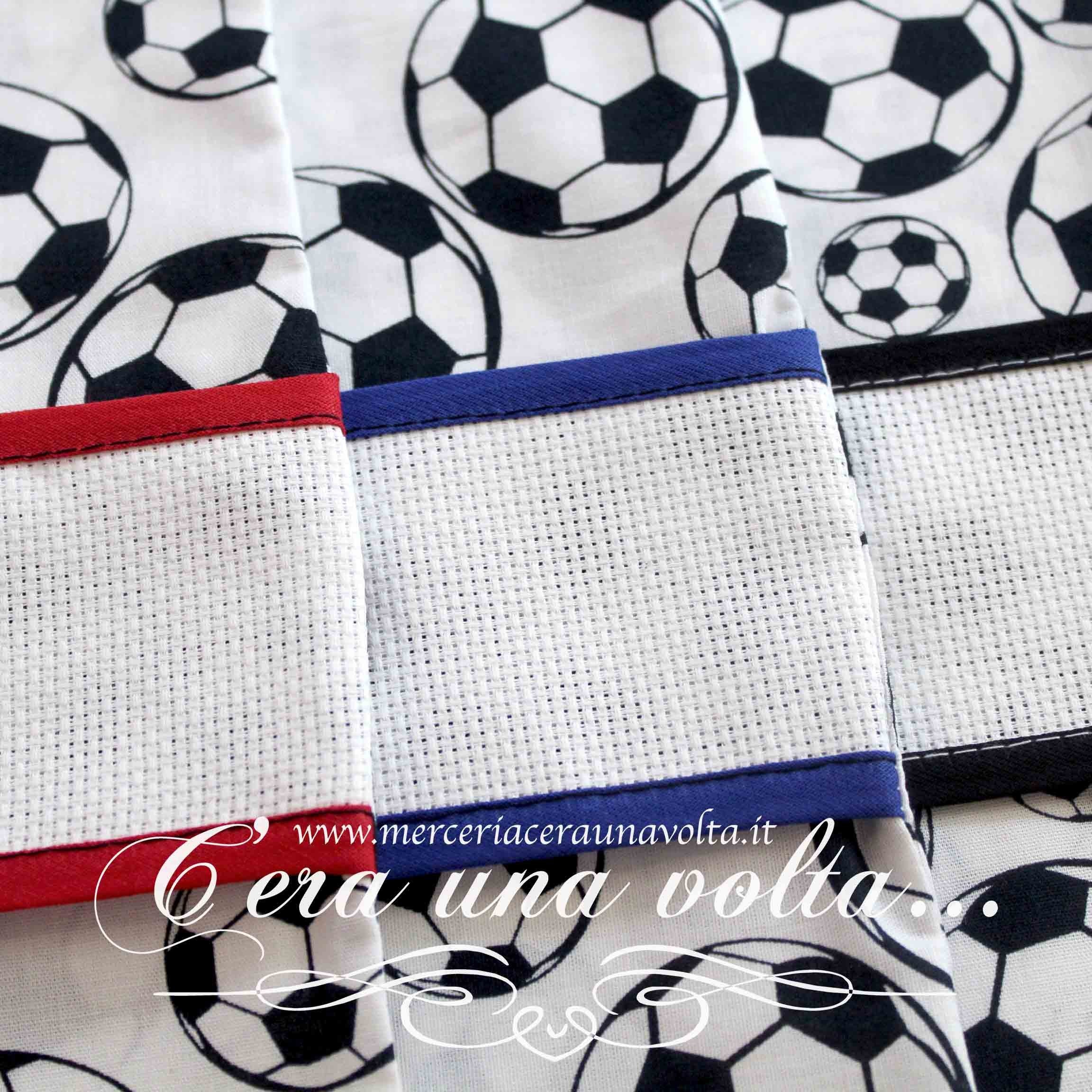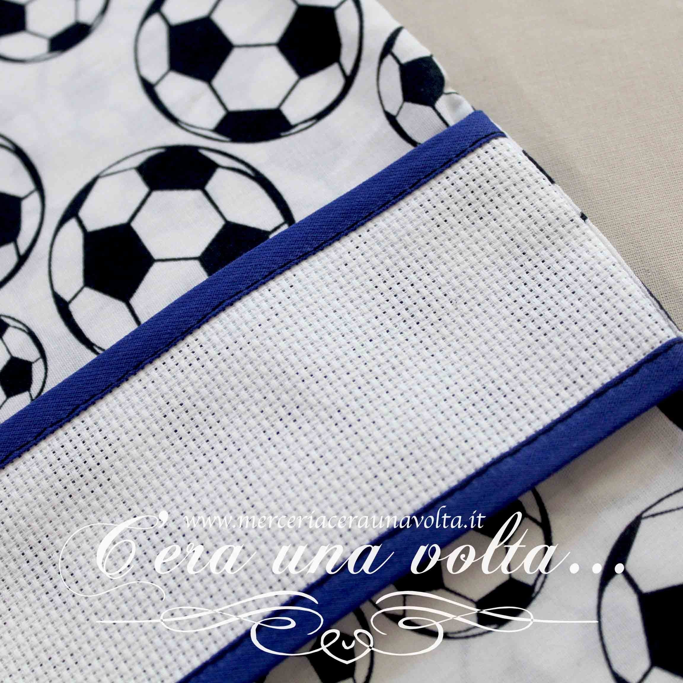 Sacchettino per inserire tutto l'occorrente per l'asilo, con la più classica e preferita stampa sportiva dei maschietti, con inserto in tela aida 55 (Altezza 30 quadretti), chiusura a coulisse doppia