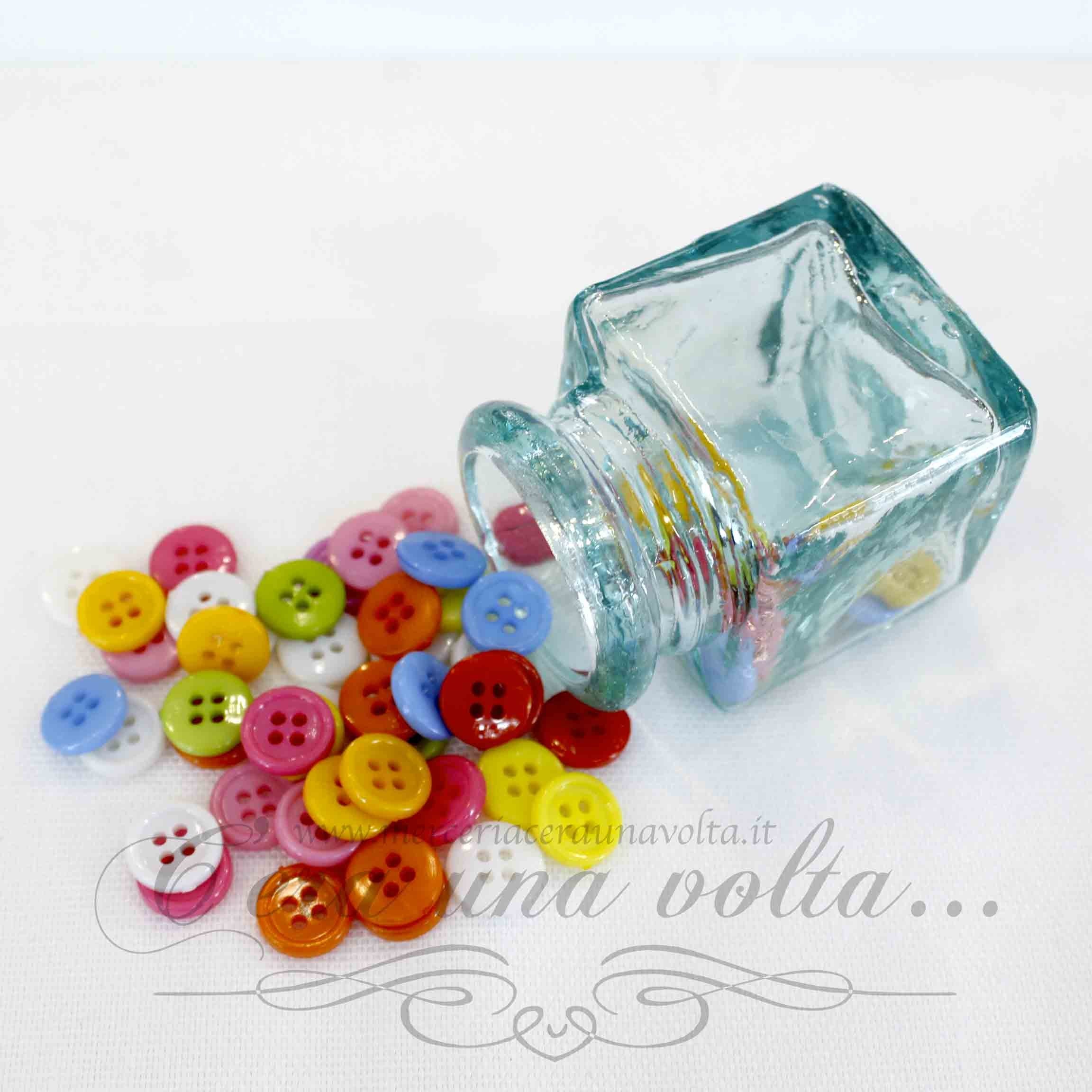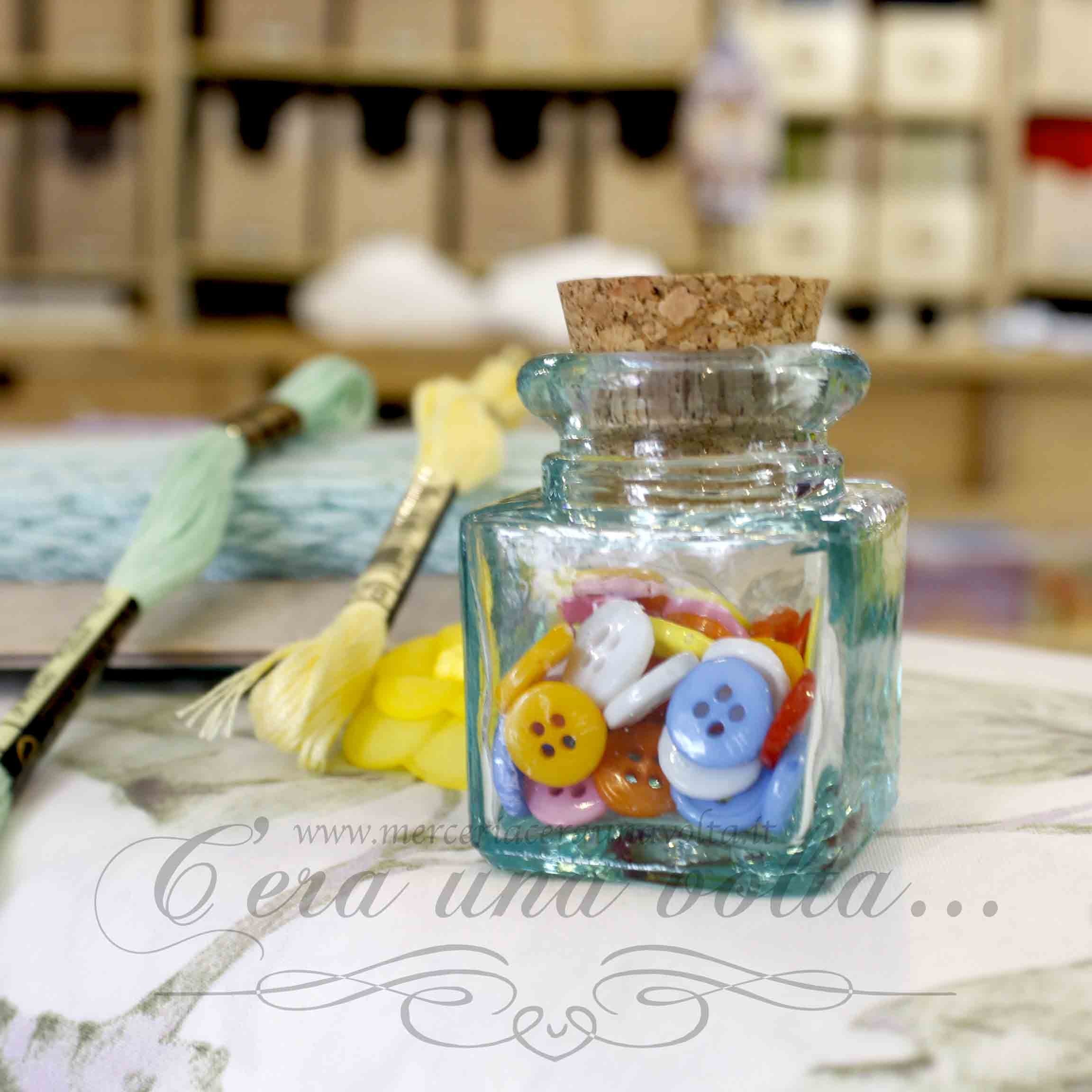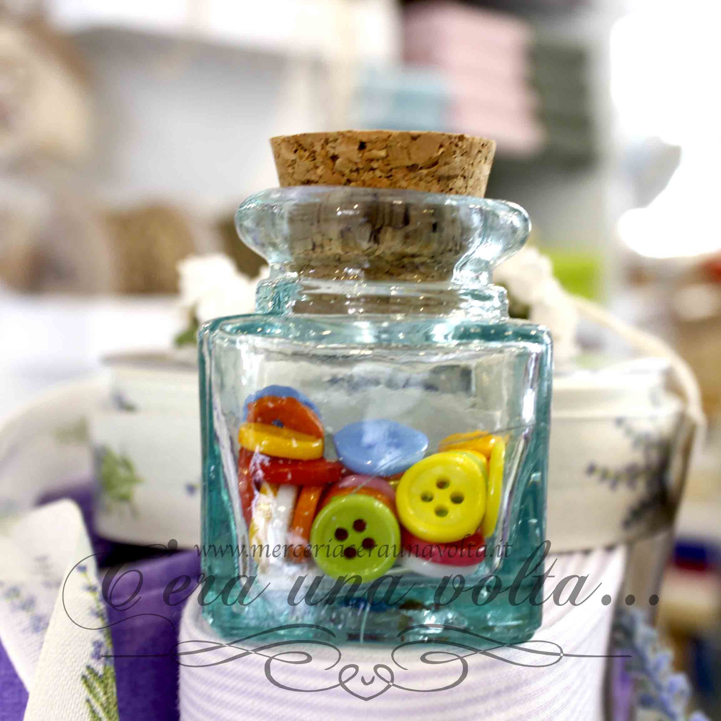 Per esaltare ed aggiungere dettagli di stile alle tue creazioni, una bella bottiglietta in vetro con tappo in sughero, racchiude 62 bottoni colorati, ideali per abbigliamento, tessuti, accessori