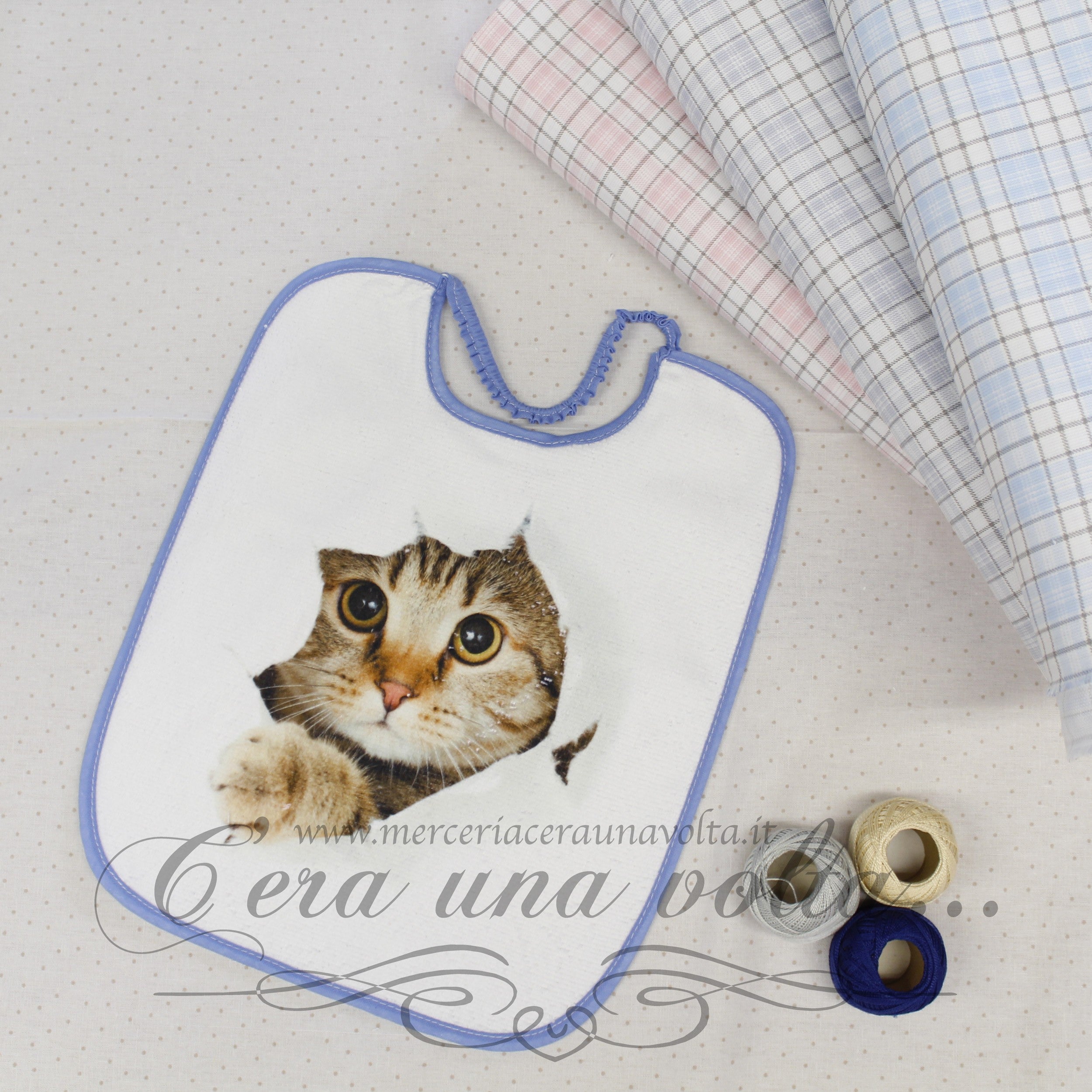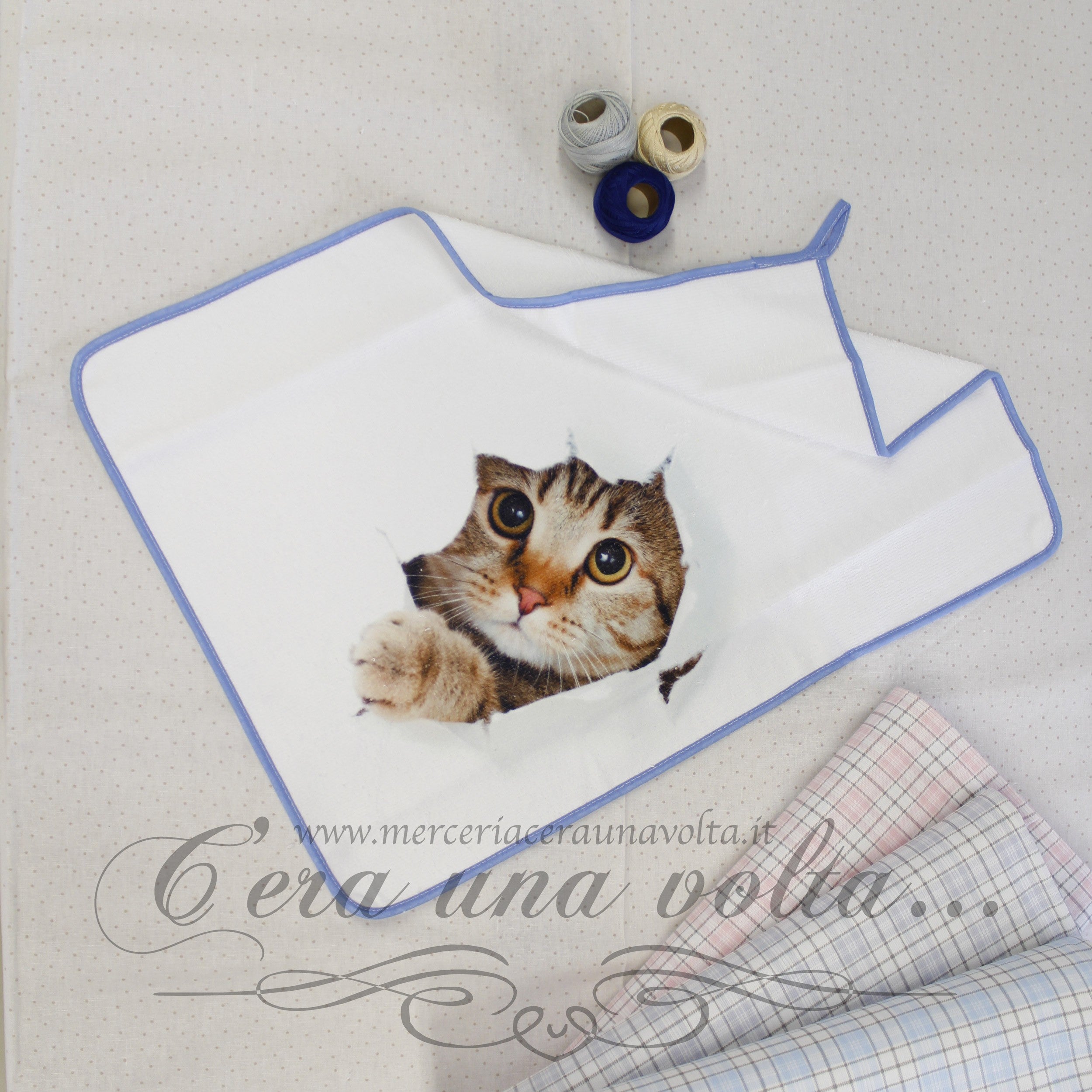 Set asilo, con stampa di un gattino composto da: 1 bavaglino con elastico , 1 asciugamani con asola per appenderlo, rifinitura con fettuccia in cotone su tutto il perimetro.