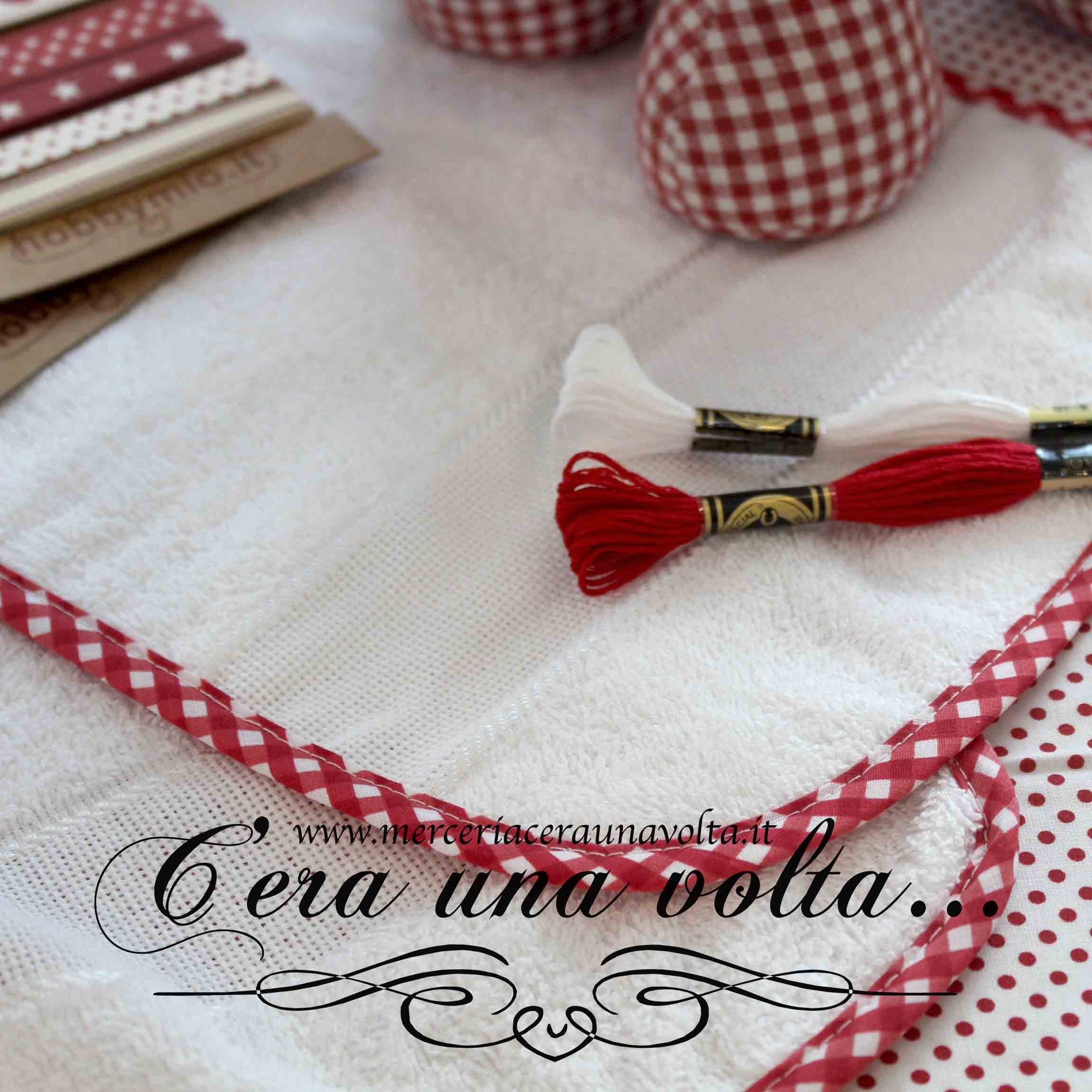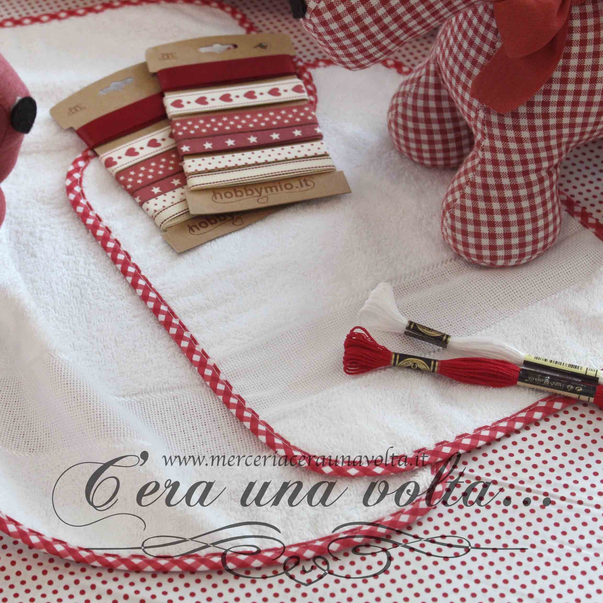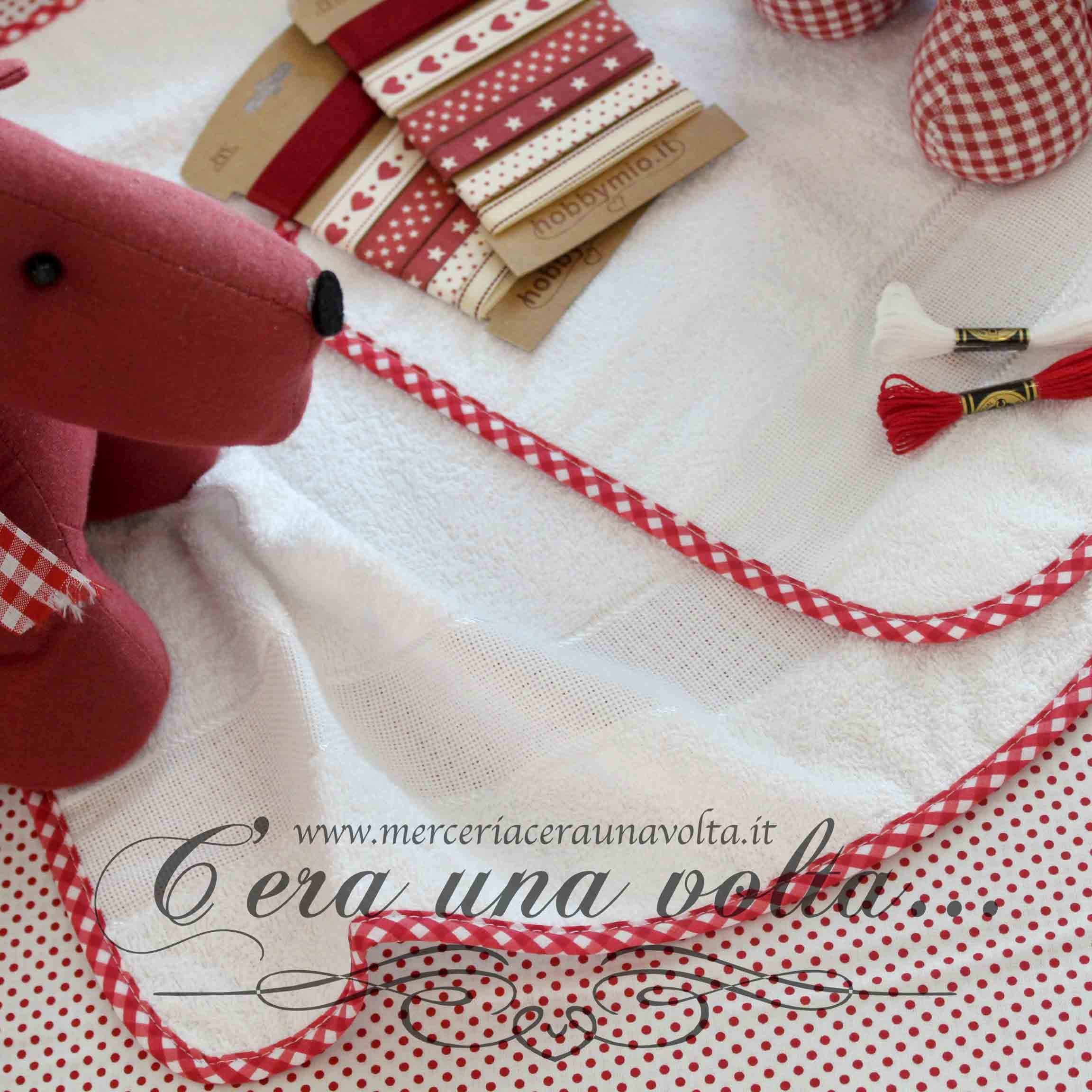Set asilo 2 pz da ricamare Vicky Rosso, composto da: 1 bavaglino con elastico, 1 asciugamani con asola per appenderlo,...
