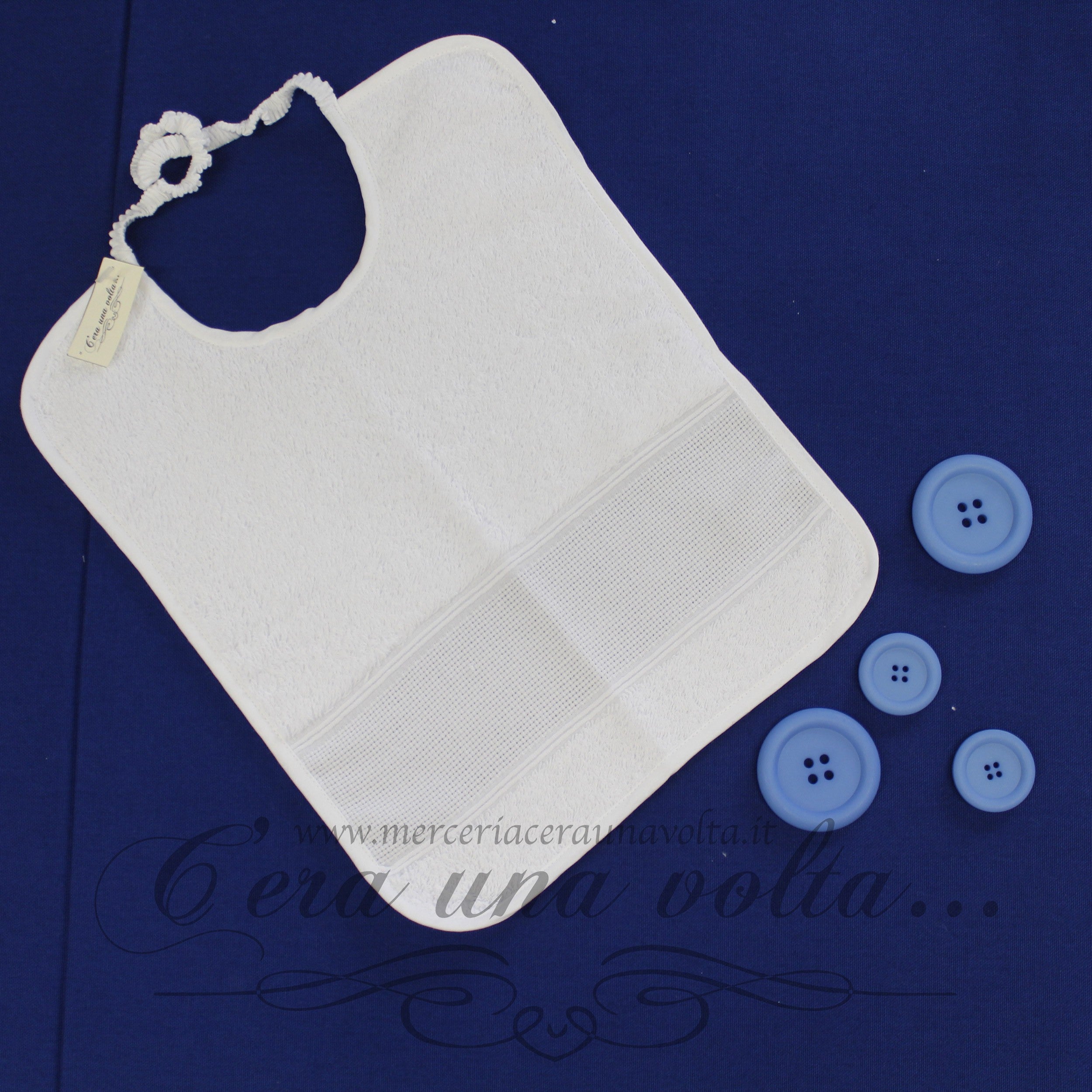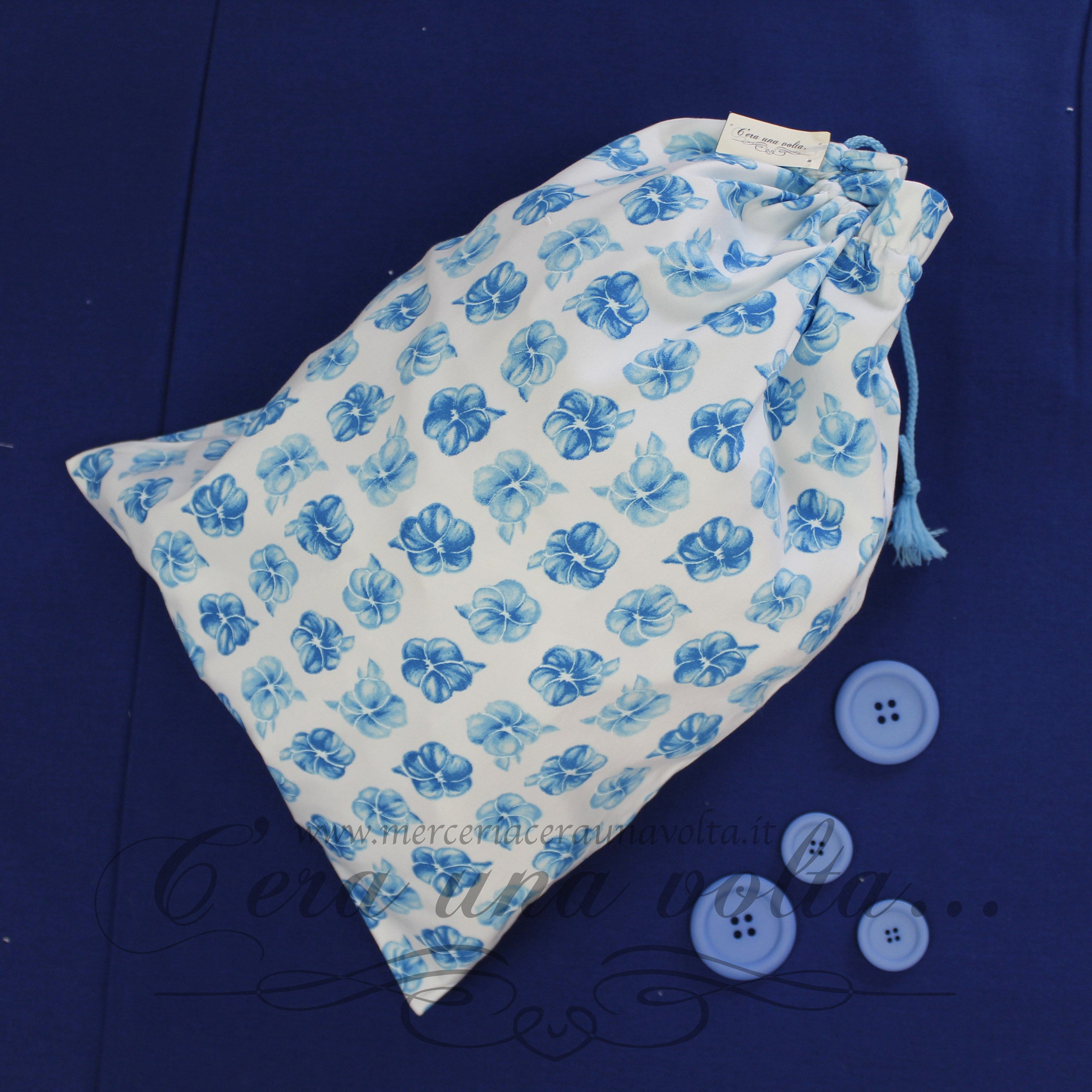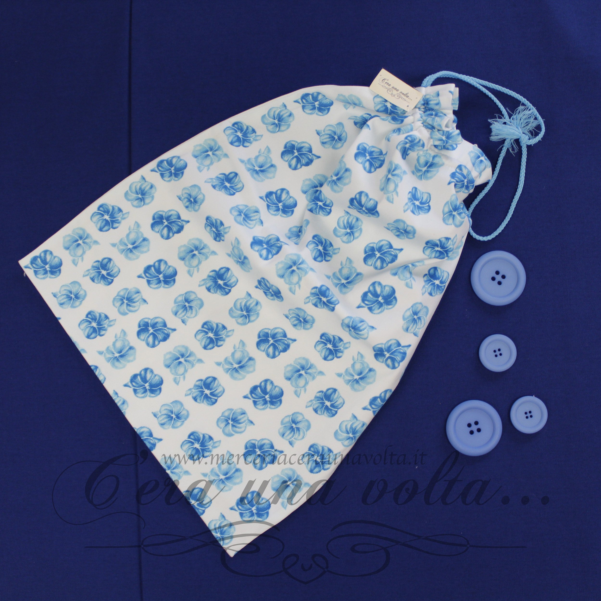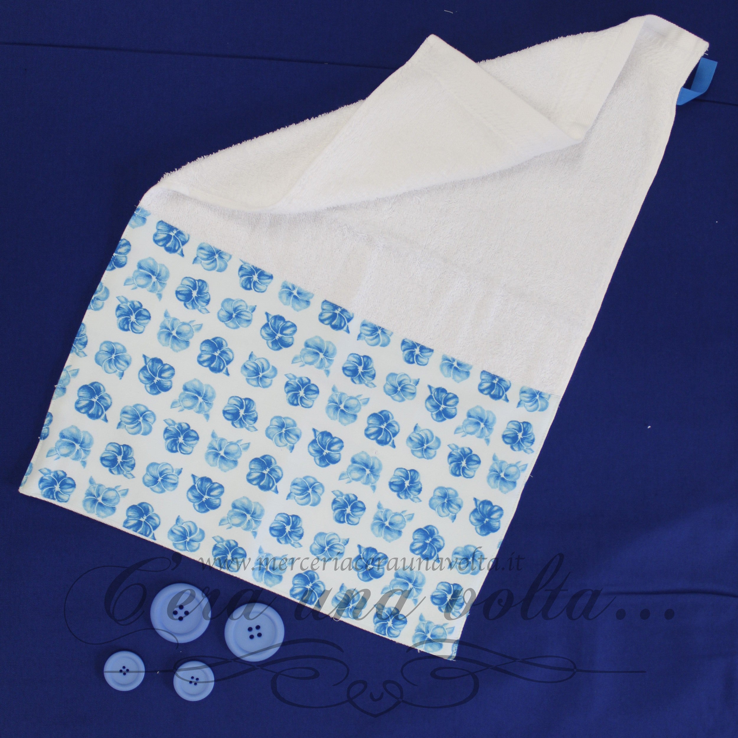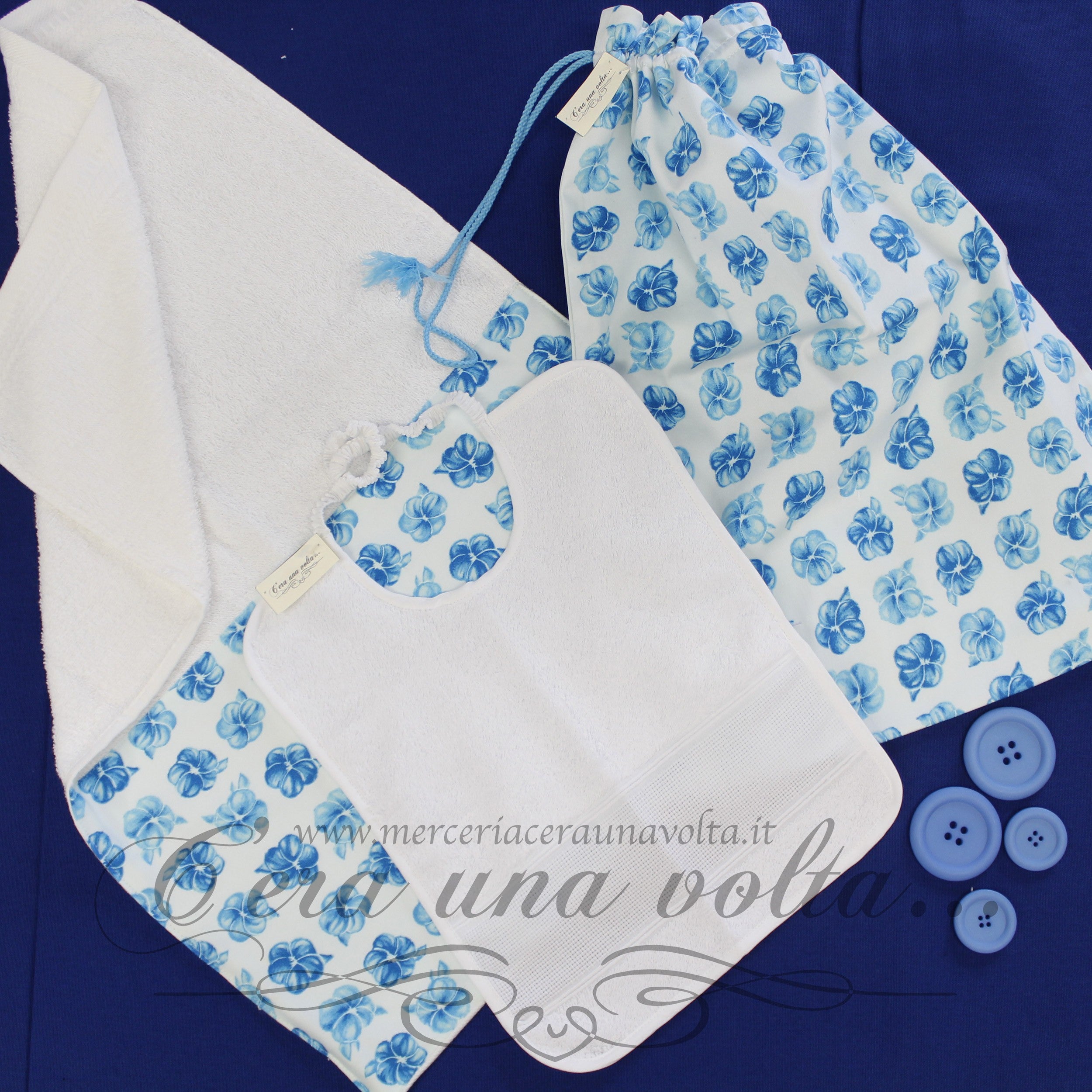 Set asilo Blue flowers, in spugna extra e cotone modal composto da: 1 bavaglino con elastico , 1 asciugamani, 1 sacchettino con comoda coulisse.
