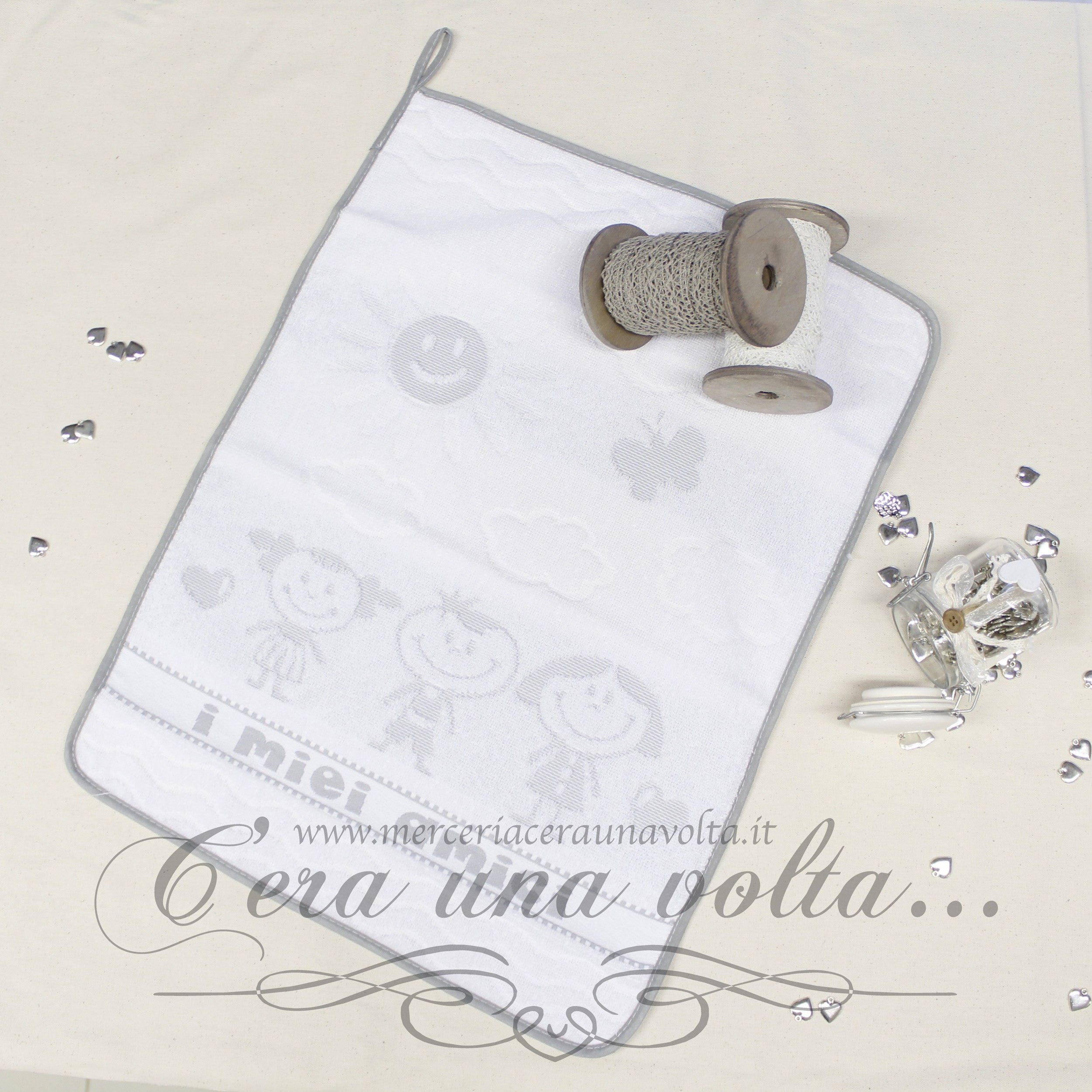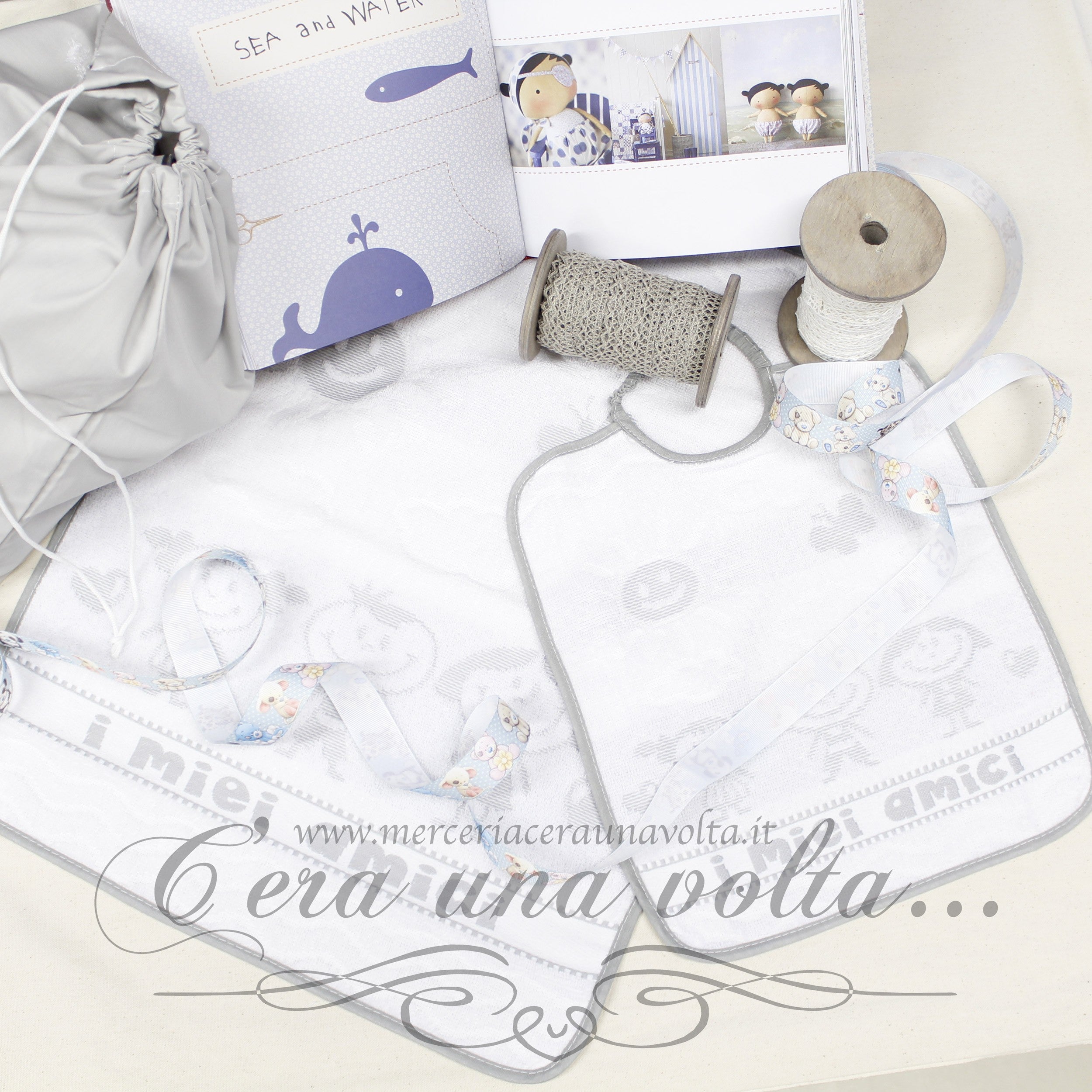 Set asilo Grigio Tortora, con stampa a rilievo composto da: 1 bavaglino con elastico , 1 asciugamani con asola per appenderlo, 1 sacchettino con comoda coulisse, rifinitura con fettuccia in cotone su tutto il perimetro.