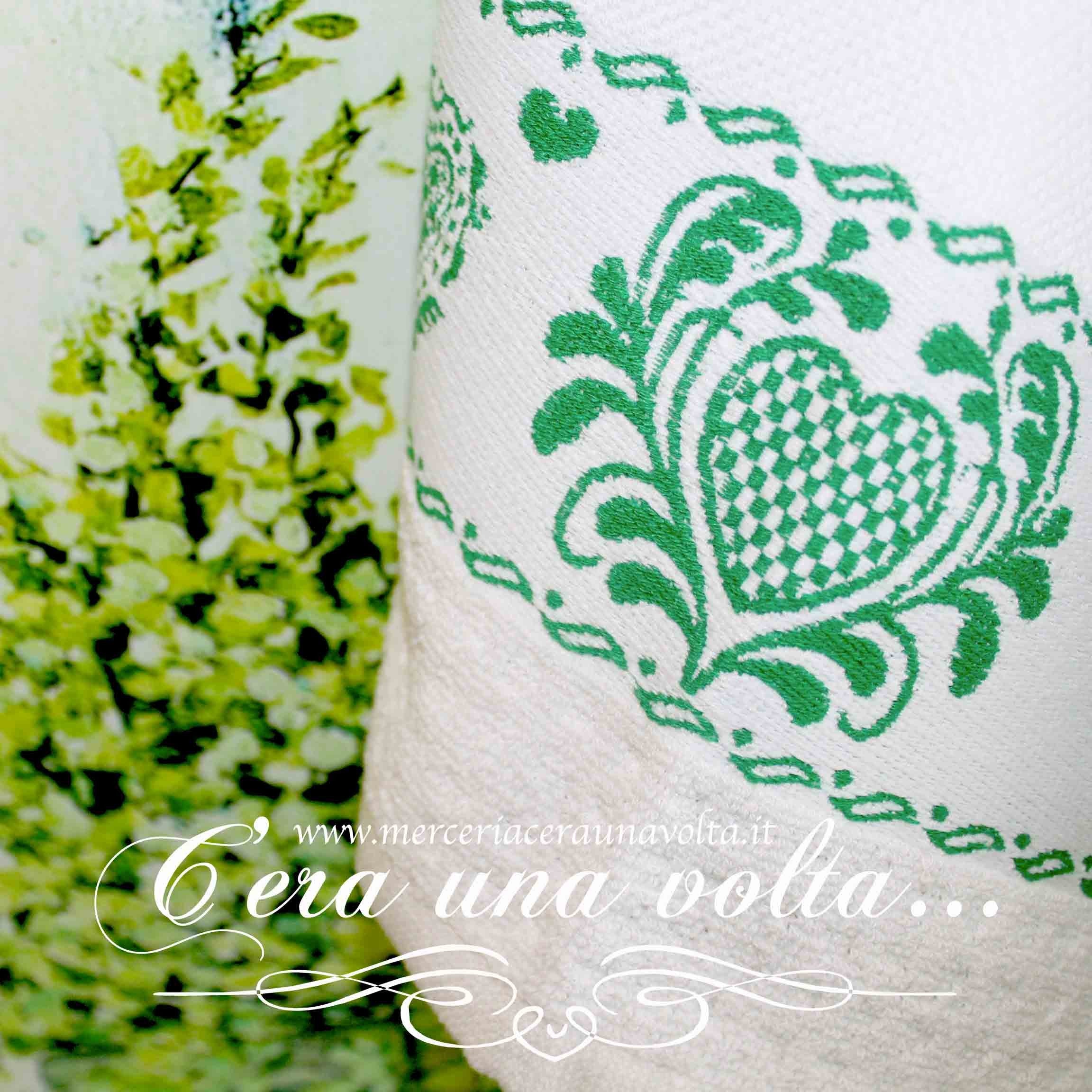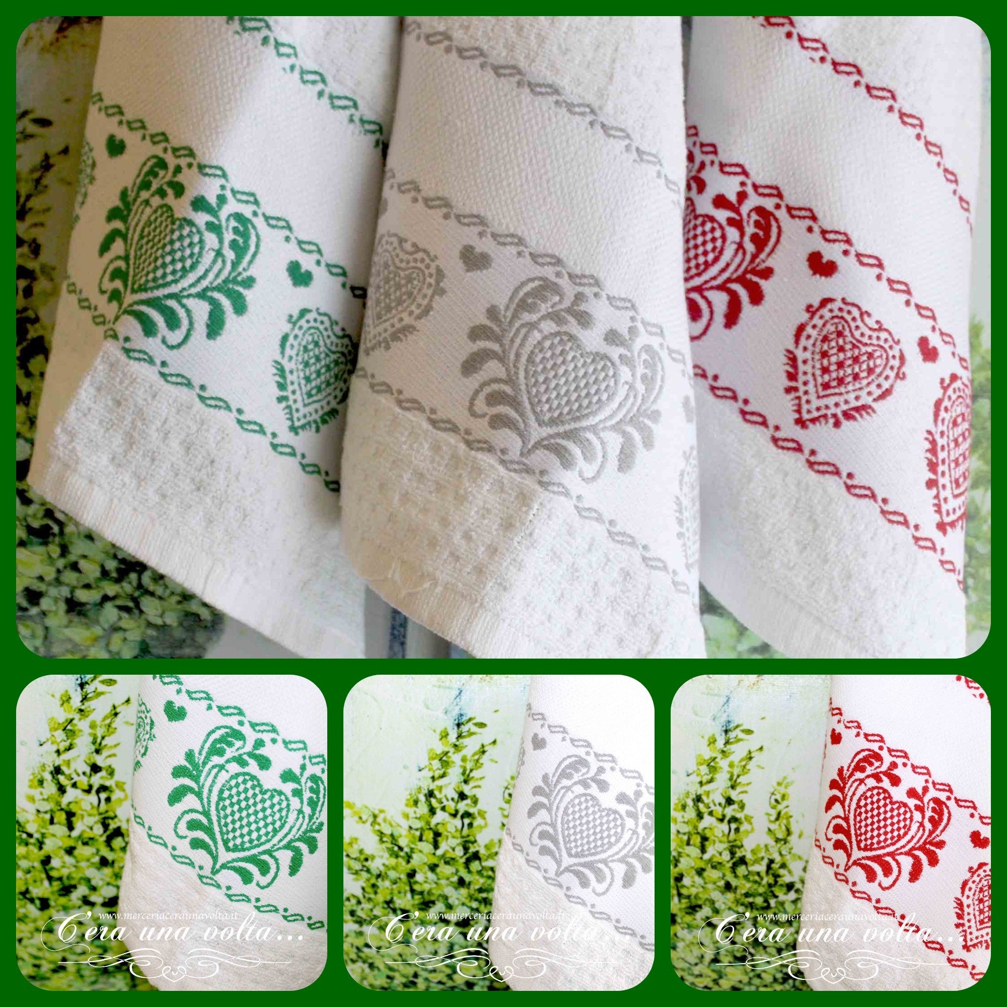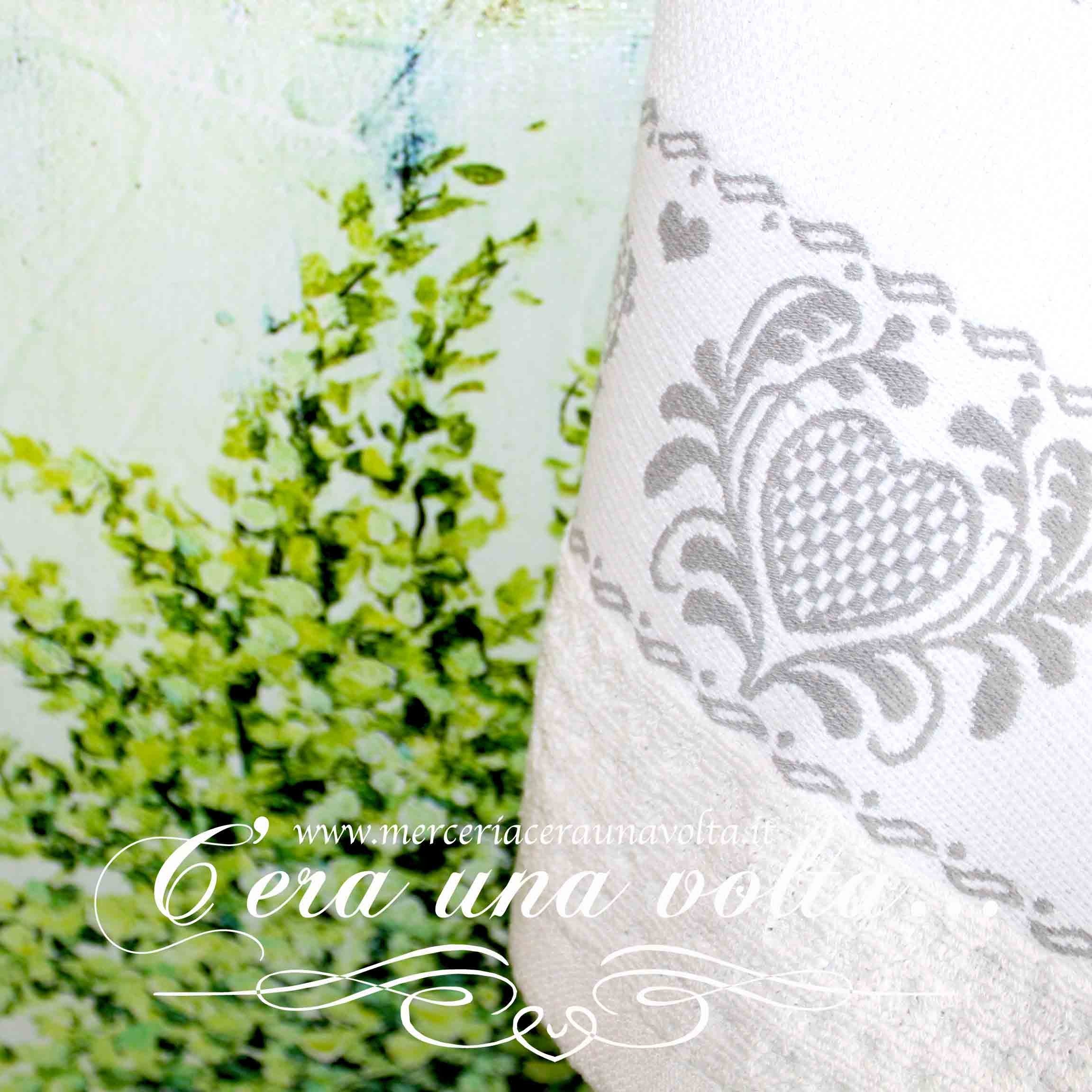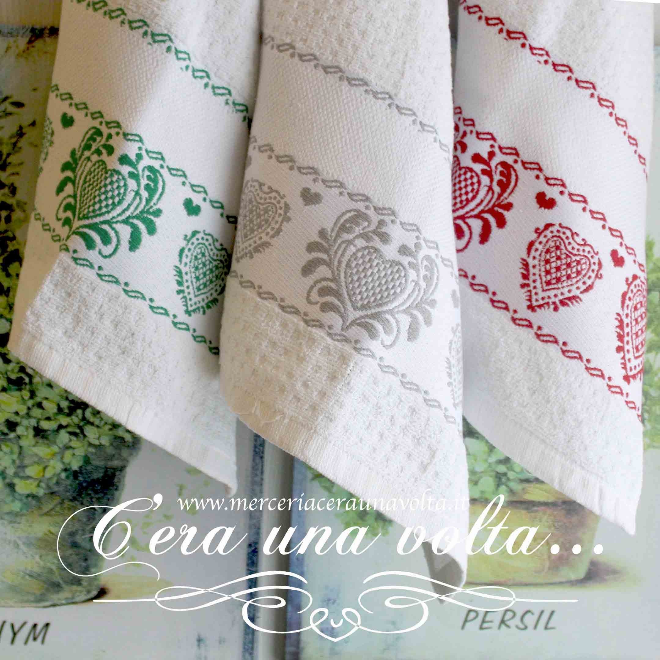 Uno stile rustico per questi strofinacci in spugna stile country, personalizzabile grazie all'inserto in tela aida 55 (Altezza 27 quadretti) La base è bianca con una stampa ornamentale a cuori. Disponibile in 4 varianti3 di colore