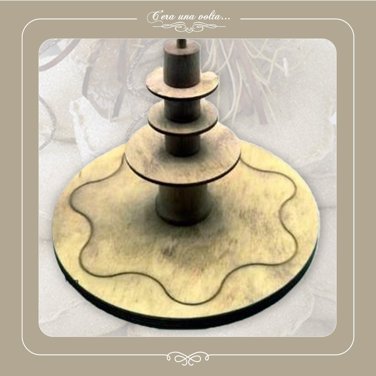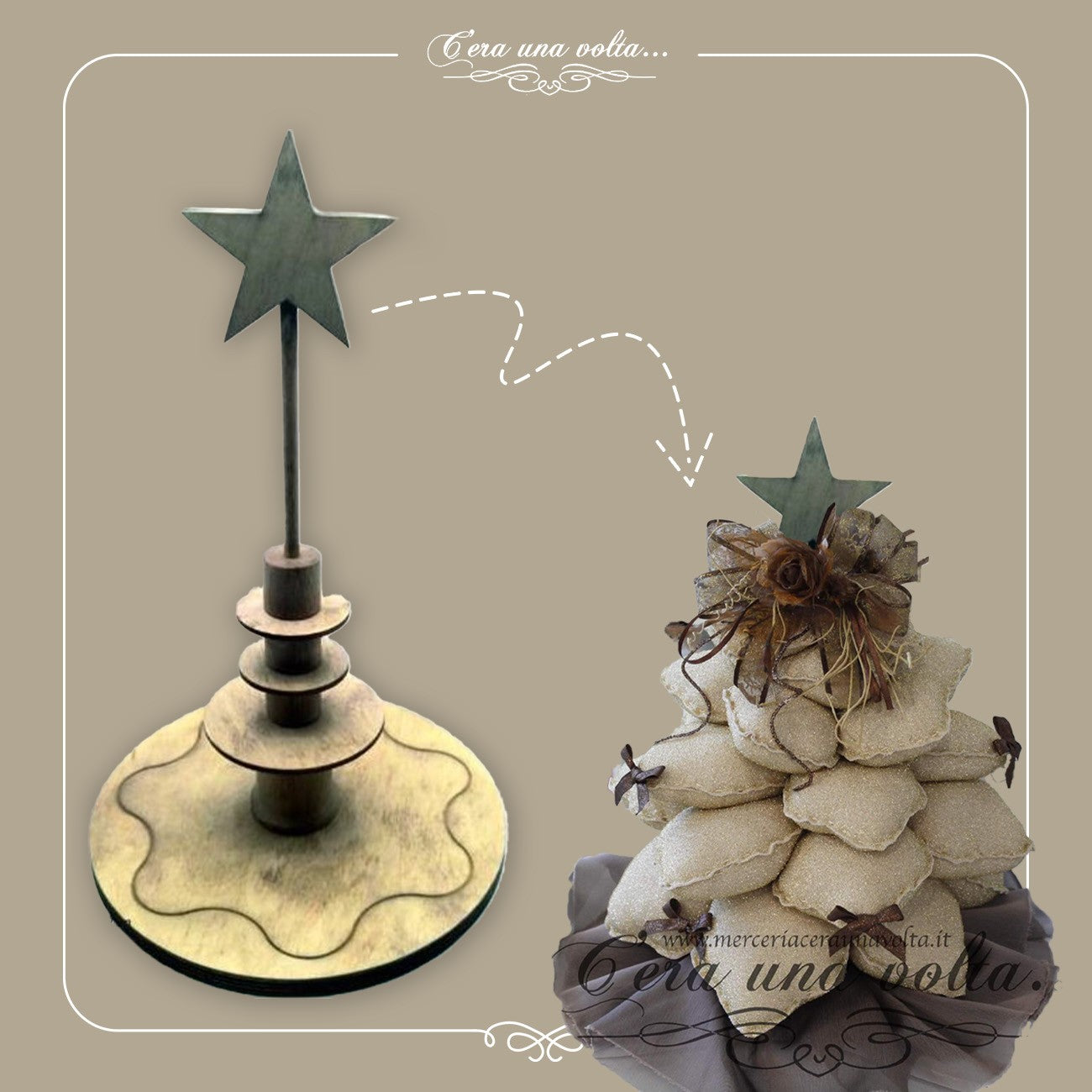 Struttura in legno per realizzare un bellissimo albero di Natale, dal sapore vintage e dal gusto un pò retrò composto da una base in legno, 4 rocchetti e 3 vassoi rotondi, 1 stella e un bastone cilindrico