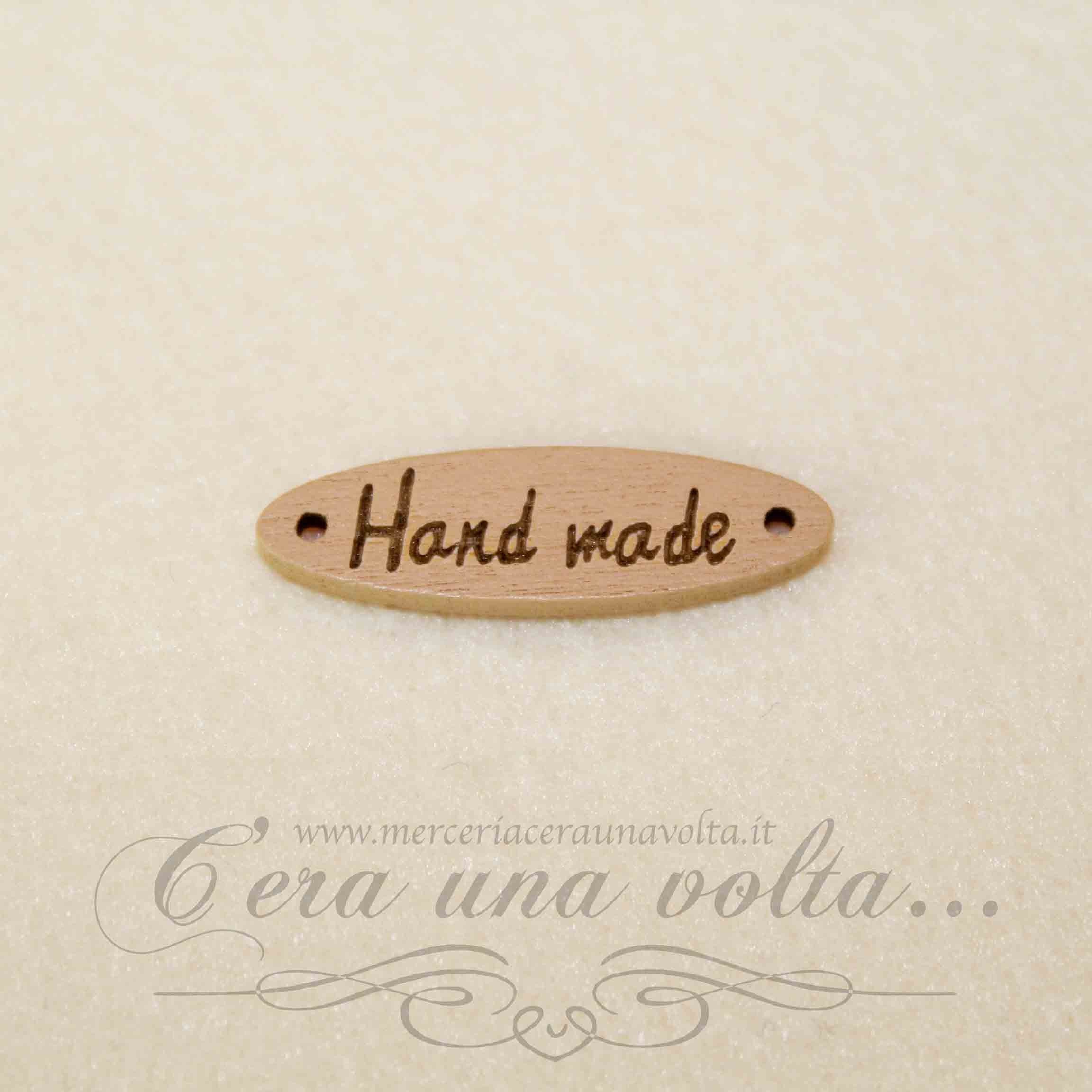 Targhetta in legno con stampa serigrafata "Hand Made", perfetta per personalizzare in modo semplice e originale le tue creazioni, con fori laterali per semplificarne l'applicazione.