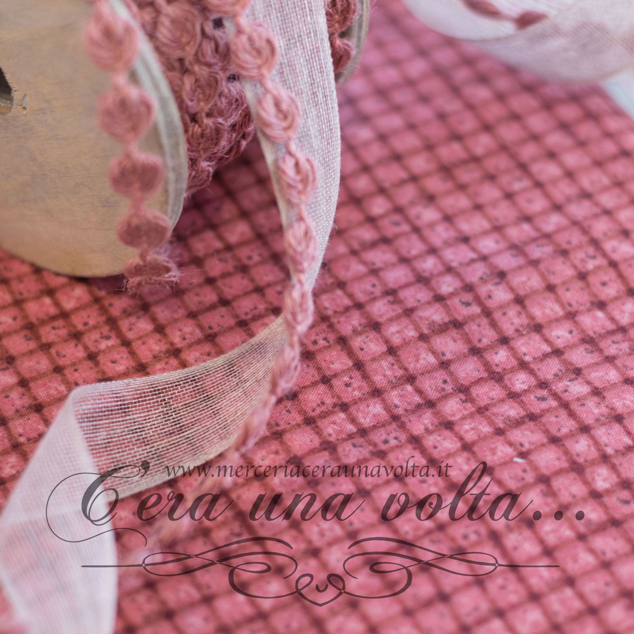 Caratteristica stampa country, in questo tessuto in cotone color Porpora, spezzato da righe Vinaccia, bellezza e semplicità in stile rustico...