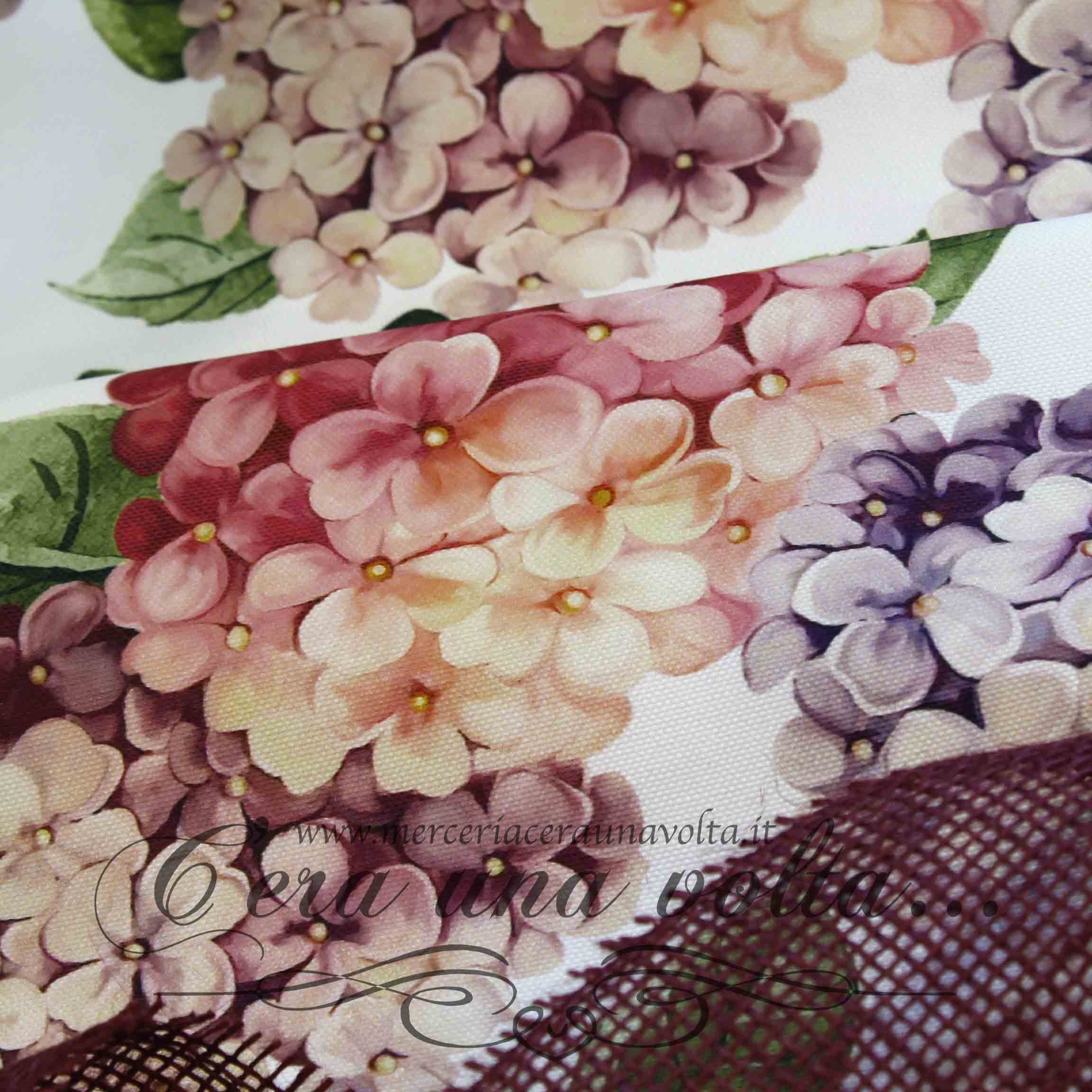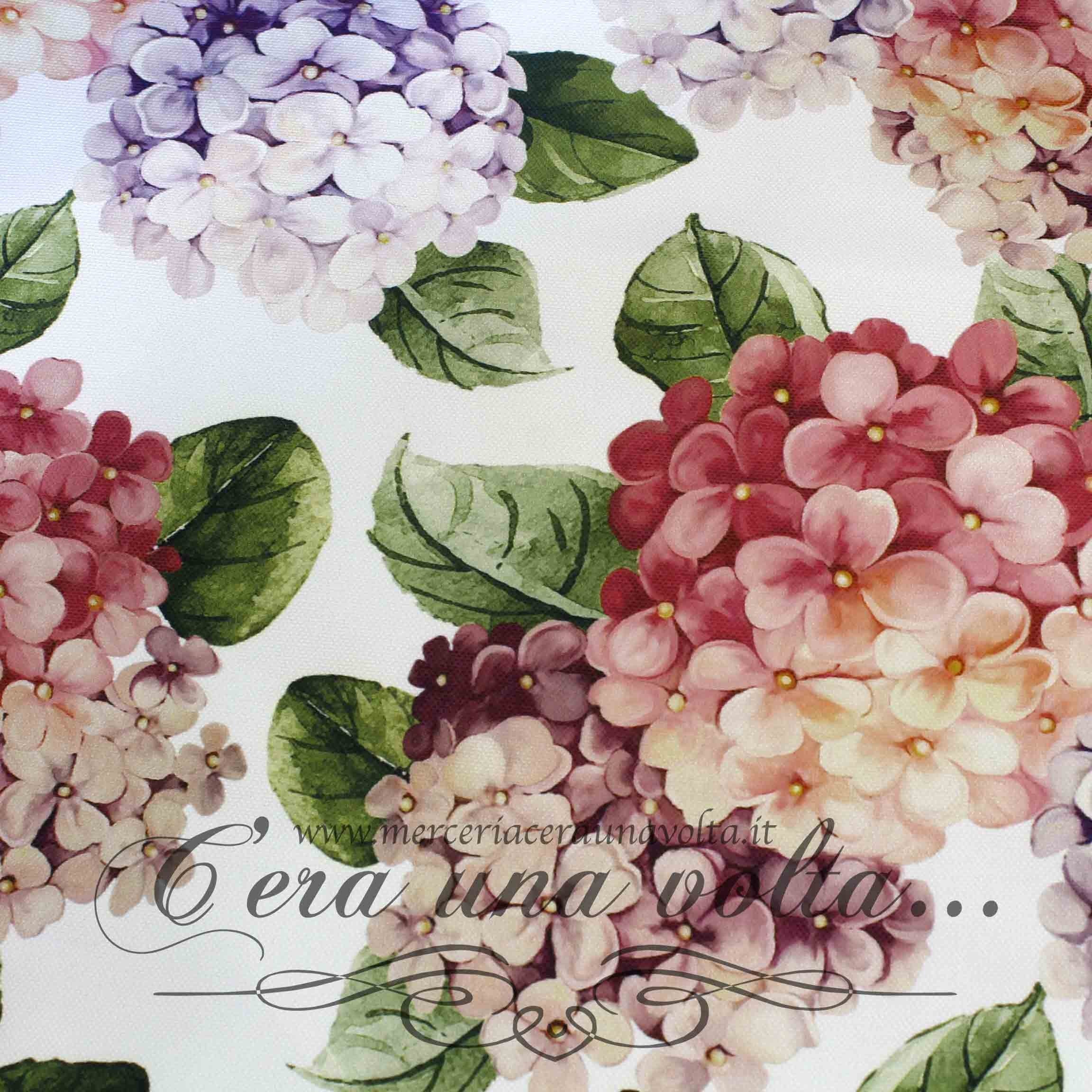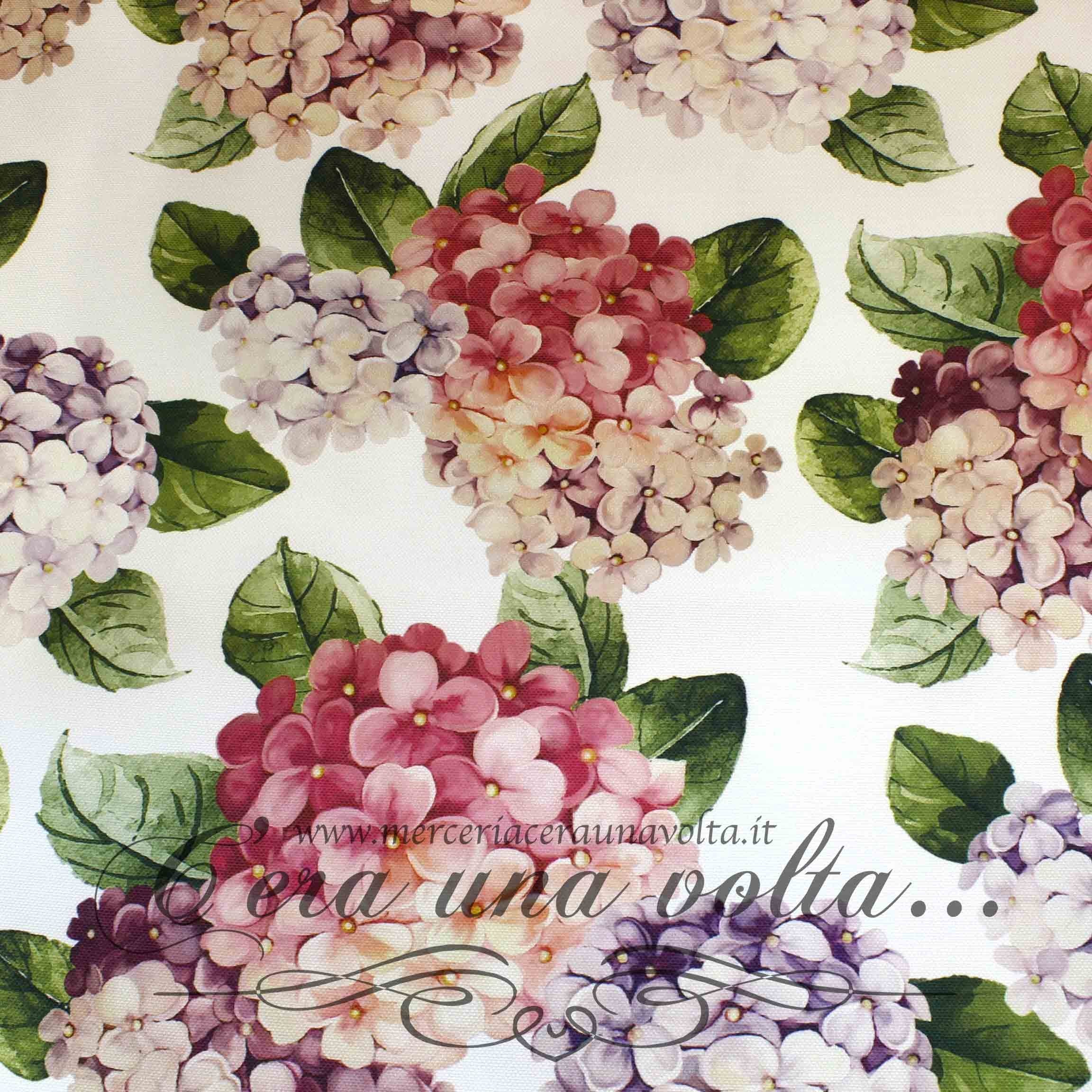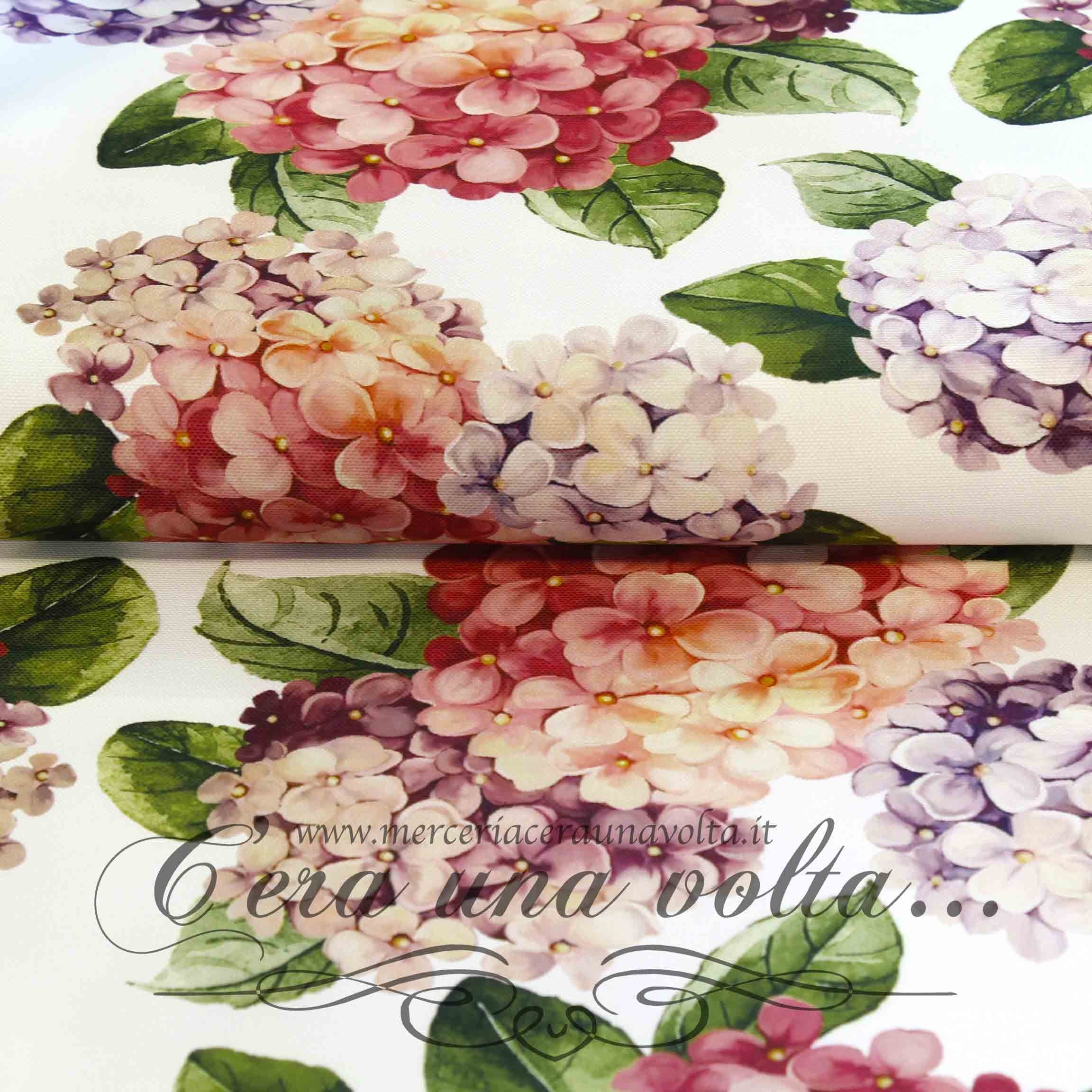 Tessuto antimacchia Ortensie, chiamate anche "Rose del Giappone", bellissime infiorescenze a sfera dai colori intensi illumineranno i tuoi progetti d'arredamento....