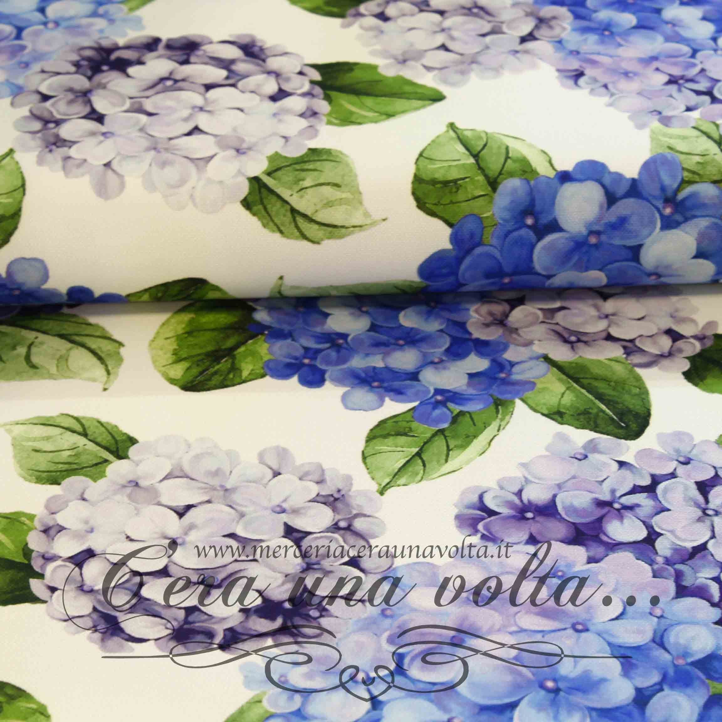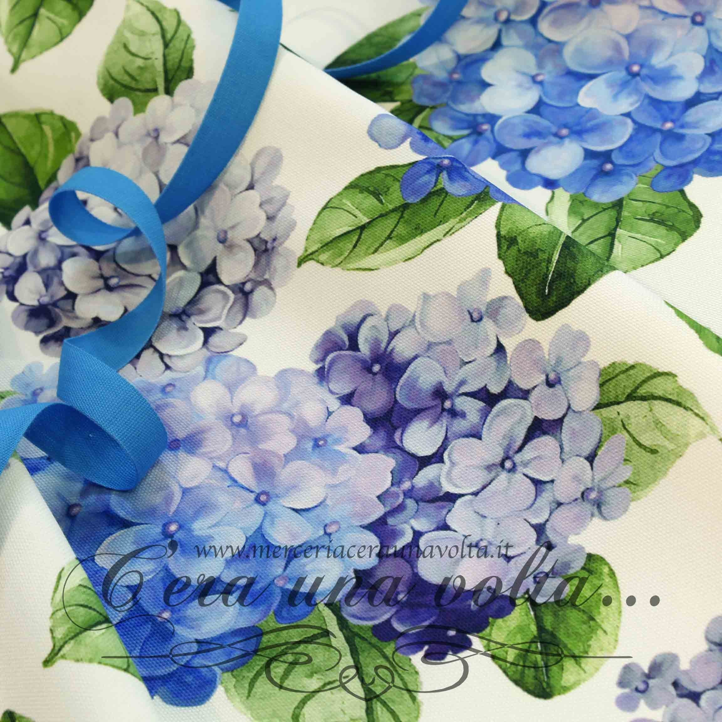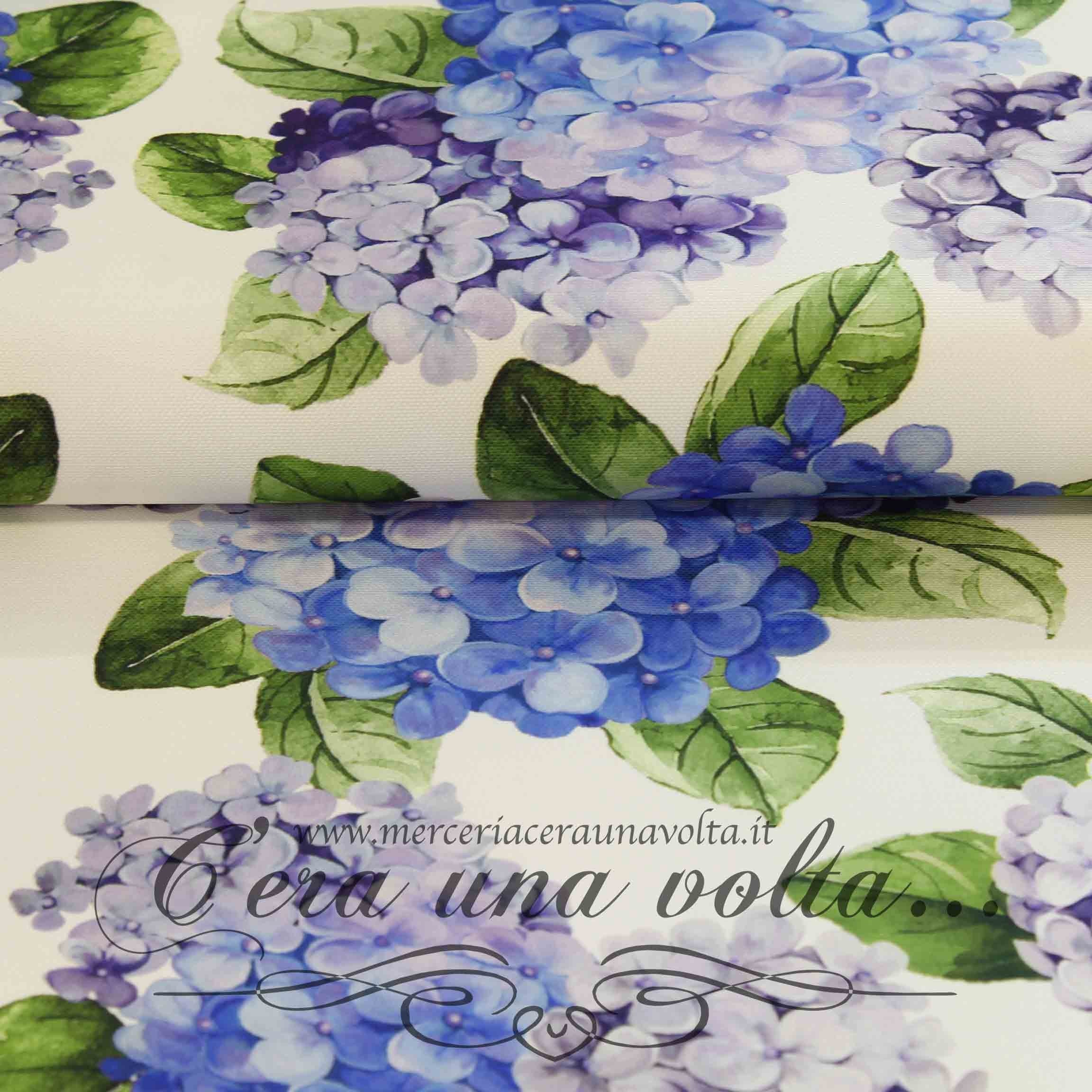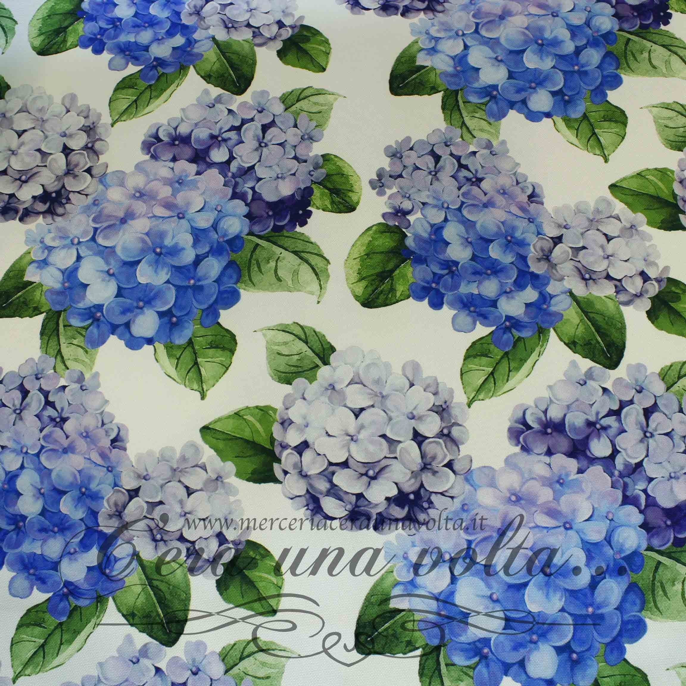 Tessuto antimacchia Ortensie, chiamate anche "Rose del Giappone", bellissime infiorescenze a sfera dai colori intensi illumineranno i tuoi progetti d'arredamento....